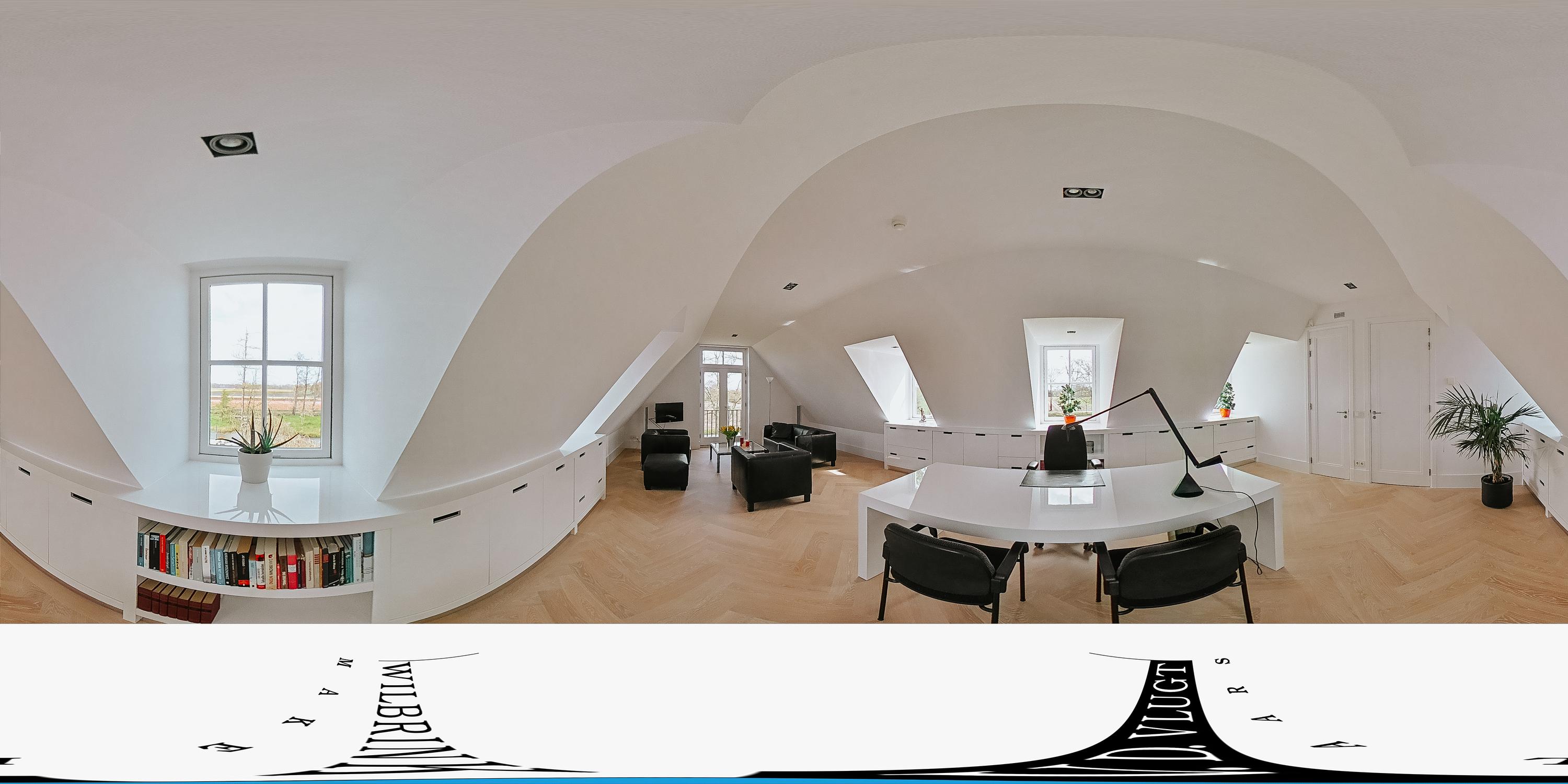 De verlichte, centraal gelegen trap brengt ons naar de slaapverdieping waar 4 royale slaapkamers met fraai uitzicht zijn, een 2e luxe badkamer en apart toilet. Via de trapopgang aan de achterzijde van de woning komen we in een zeer grote kamer met vaste kasten en 6 dakkapellen die thans in gebruik is als werkkamer. Ook hier genieten we van een prachtig uitzicht.