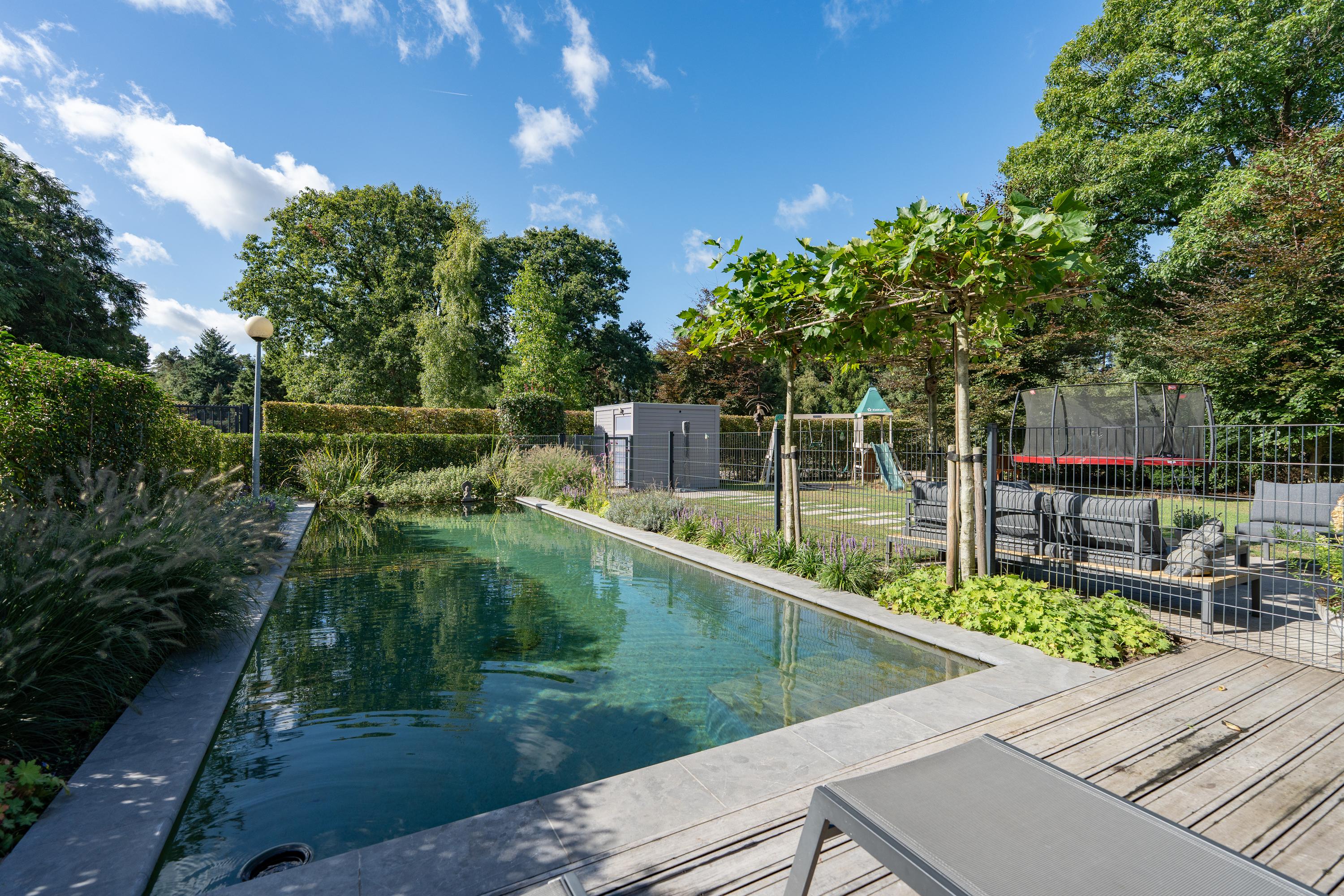 Rondom de woning ligt een verzorgde voor, zij en achtertuin, ingericht met meerdere terrassen waardoor op elk moment van de dag een fijne plek in de zon of schaduw te vinden is. Ook is er nog een extra berging. De omheinde zwemvijver is een echte blikvanger en geeft de tuin een bijzondere uitstraling. Op eigen terrein is bovendien ruime parkeergelegenheid aanwezig.