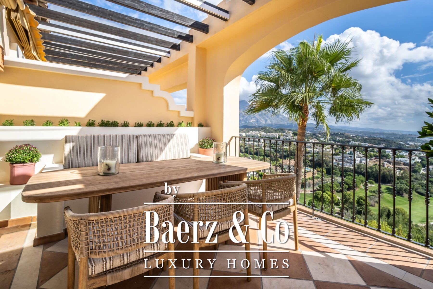 Dit penthouse in Marbella La Quinta vormt het kroonstuk van het landschap met een onverstoord uitzicht op zee, bergen en de smaragdgroene golfbanen. De terrassen nodigen uit tot wonen het hele jaar door, met een ligging die zowel de rust van de ochtendzon als het zachte avondlicht opvangt – ideaal voor een intiem diner of een rustige terugtrekplek.