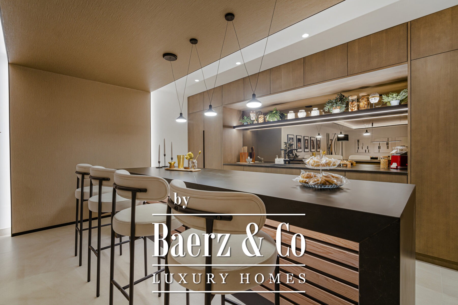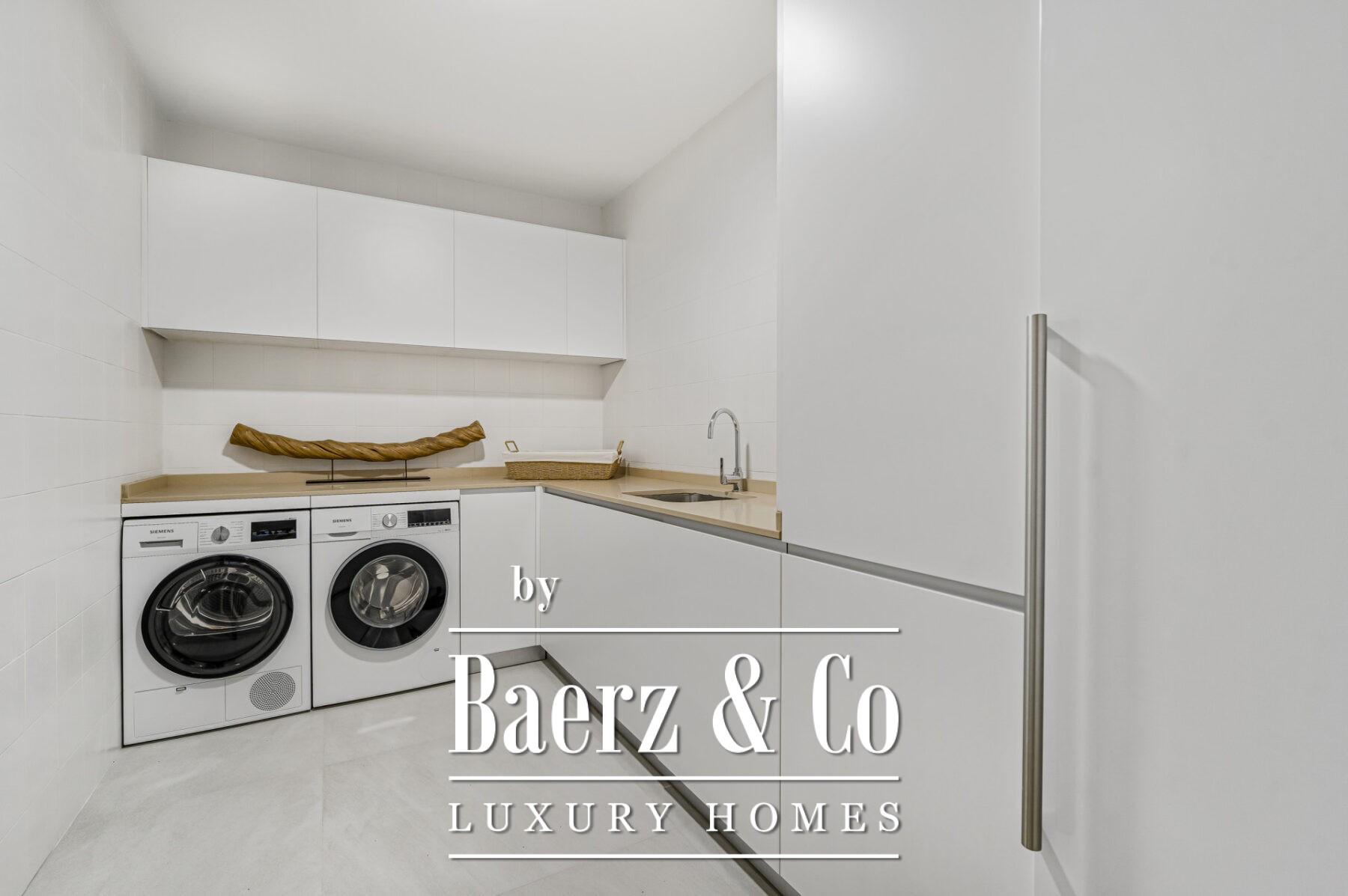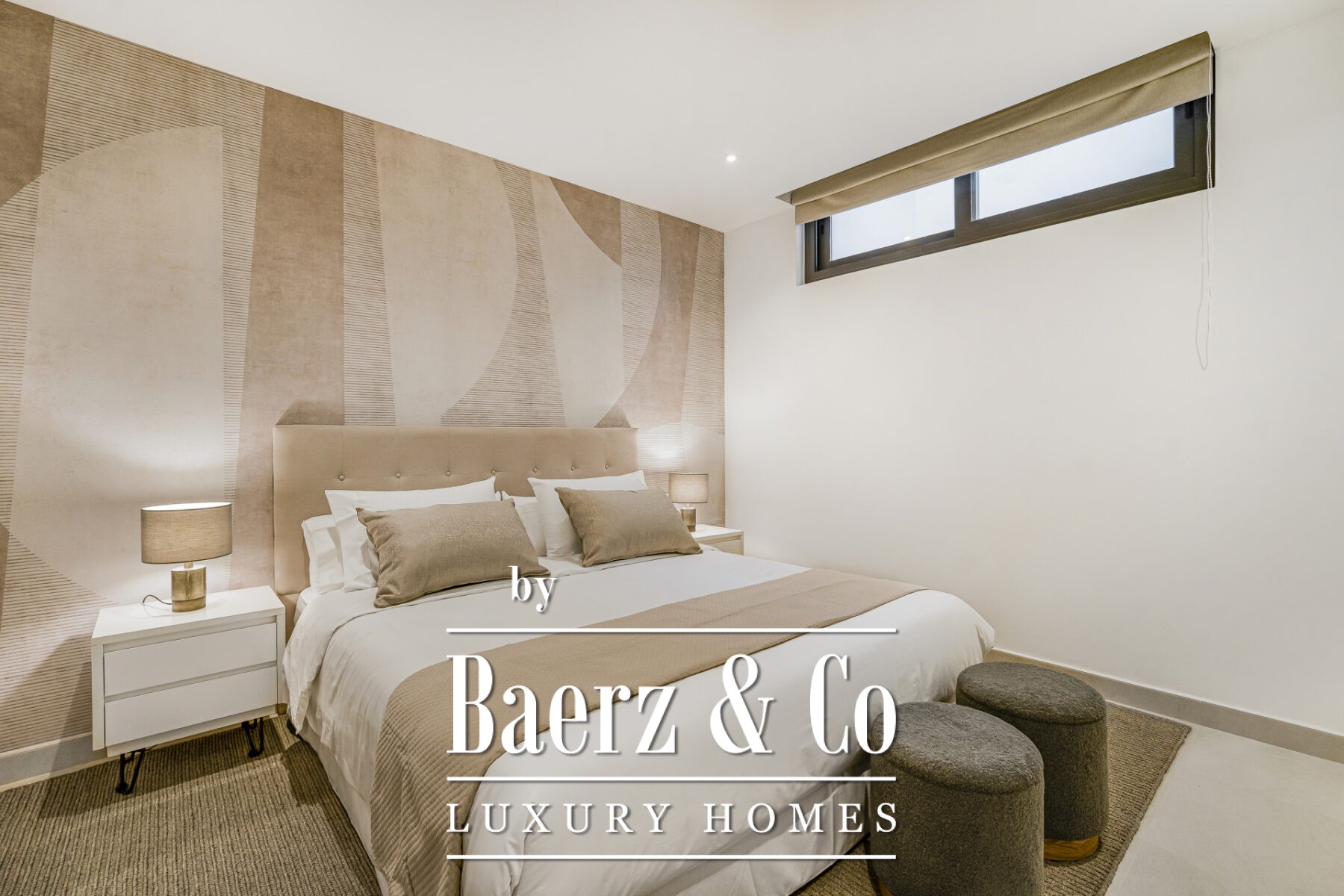 De woonervaring stroomt moeiteloos tussen open leef- en eetruimtes, geankerd door een keuken van topniveau en grenzend aan de aangelegde tuin met verwarmd zwembad. Zowel privé- als gastensuites zijn op alle verdiepingen aanwezig, inclusief een mastersuite met inloopkast, terras en toegang tot een solarium met panoramisch zeezicht, jacuzzi en buitenkeuken. Voor ontspanning en vermaak is er een speelkamer, biljarttafel, lounge en bar op het lagere niveau, aangevuld met twee gastensuites en een garage voor drie auto's met elektrische laadpunten.