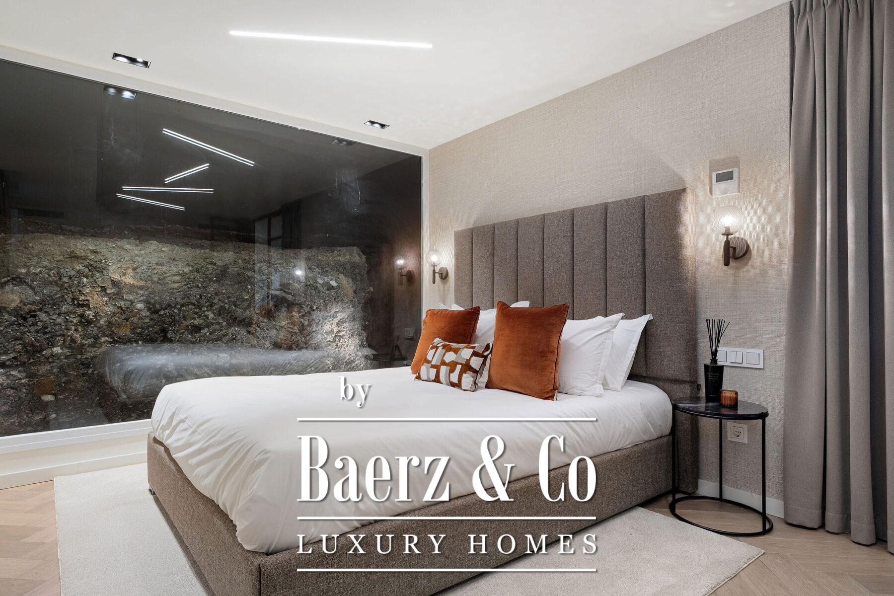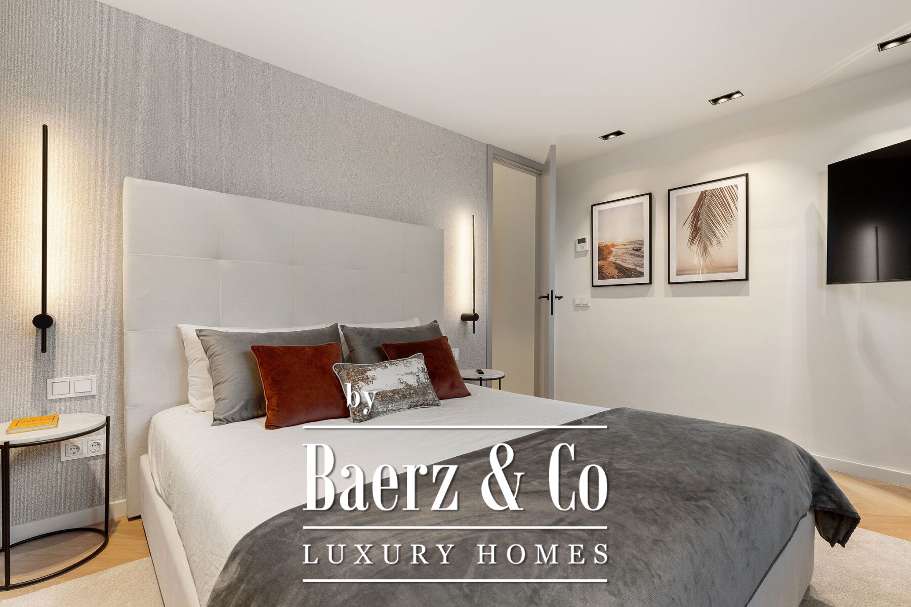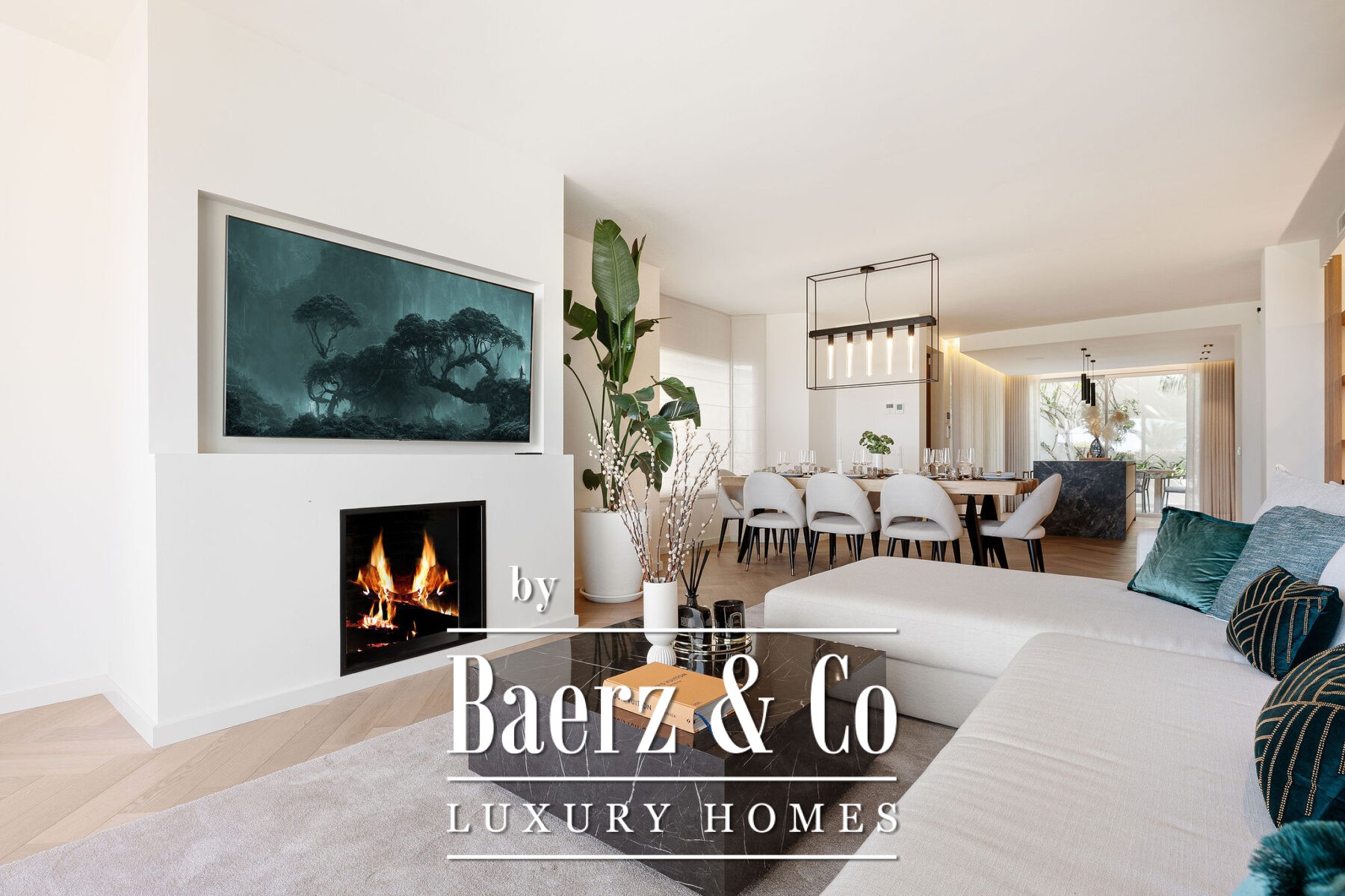 Op de begane grond accentueert natuurlijk licht het open leef- en eetgedeelte en de ultramoderne Gaggenau-keuken, allemaal voorzien van hoogwaardige hout- en marmeren accenten. Visgraatvloeren en een neutraal palet zorgen voor warmte en een ingetogen, verfijnde sfeer. Aansluitend aan de living nodigt het privéterras uit tot diners in de open lucht en momenten van rust en privacy. De royale mastersuite beschikt over een ruime inloopkast, een vrijstaand bad met uitzicht op het terras en een en-suite badkamer. Een extra slaapkamer op deze verdieping creëert flexibele mogelijkheden voor familie of gasten.