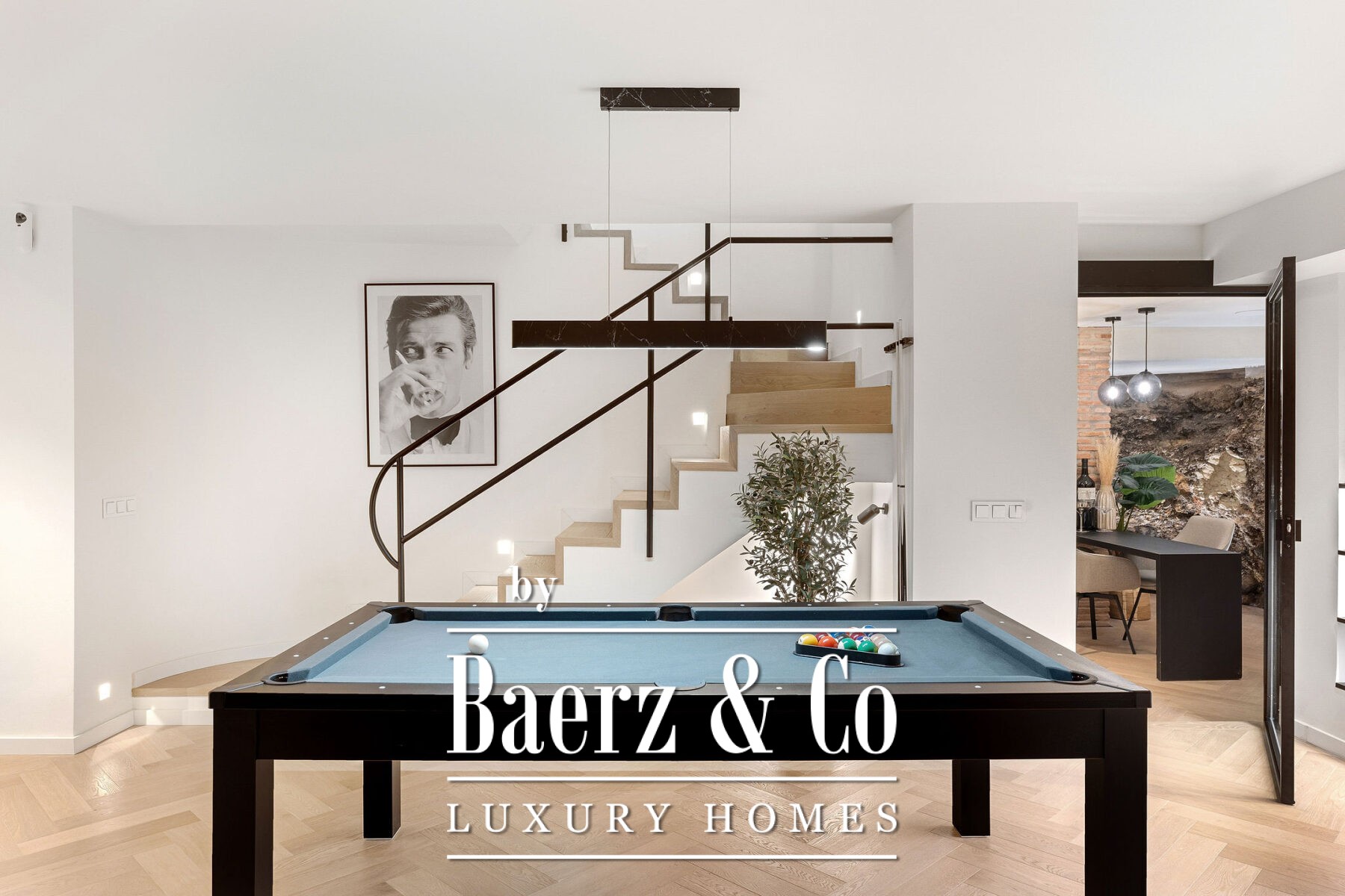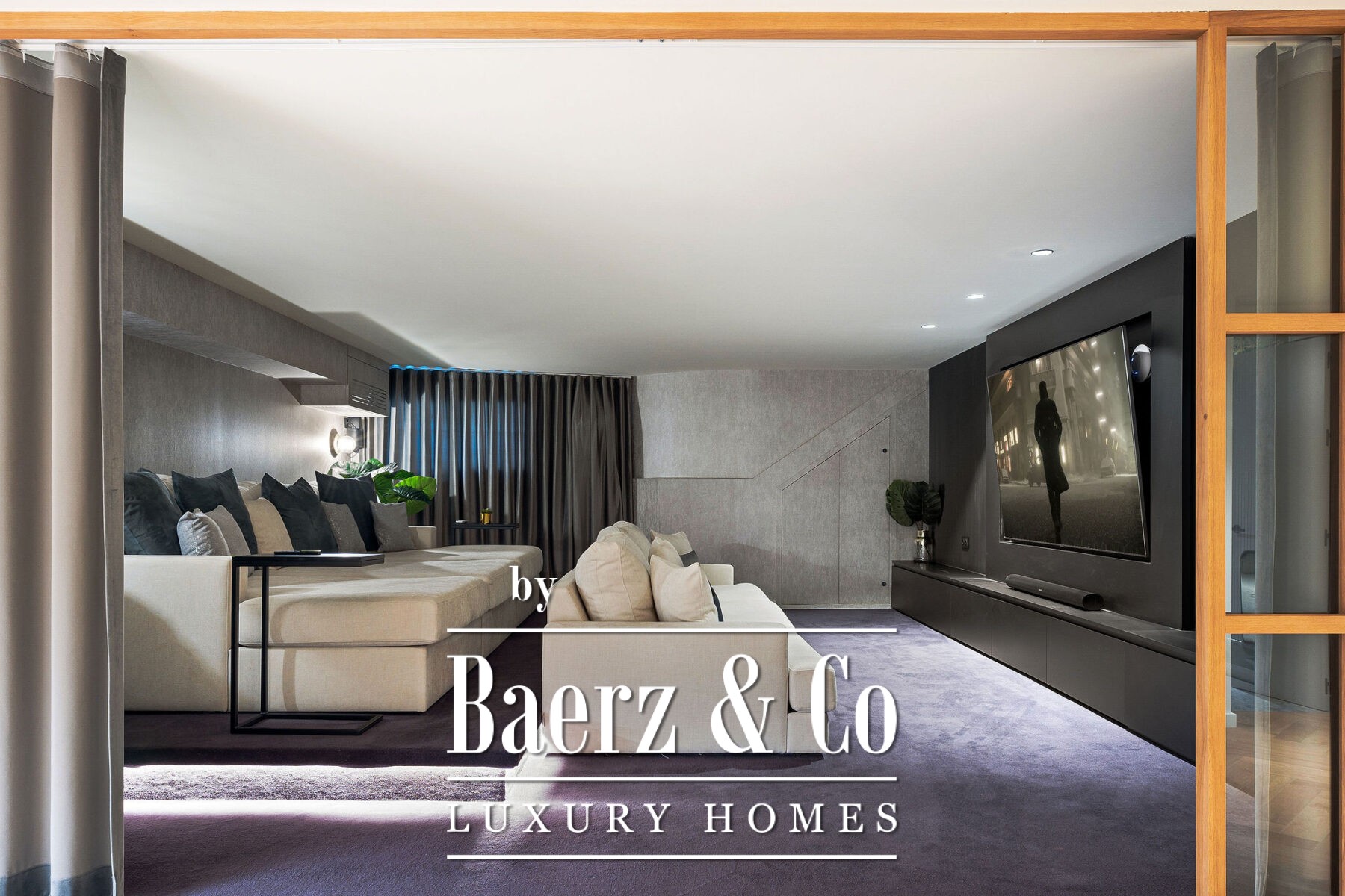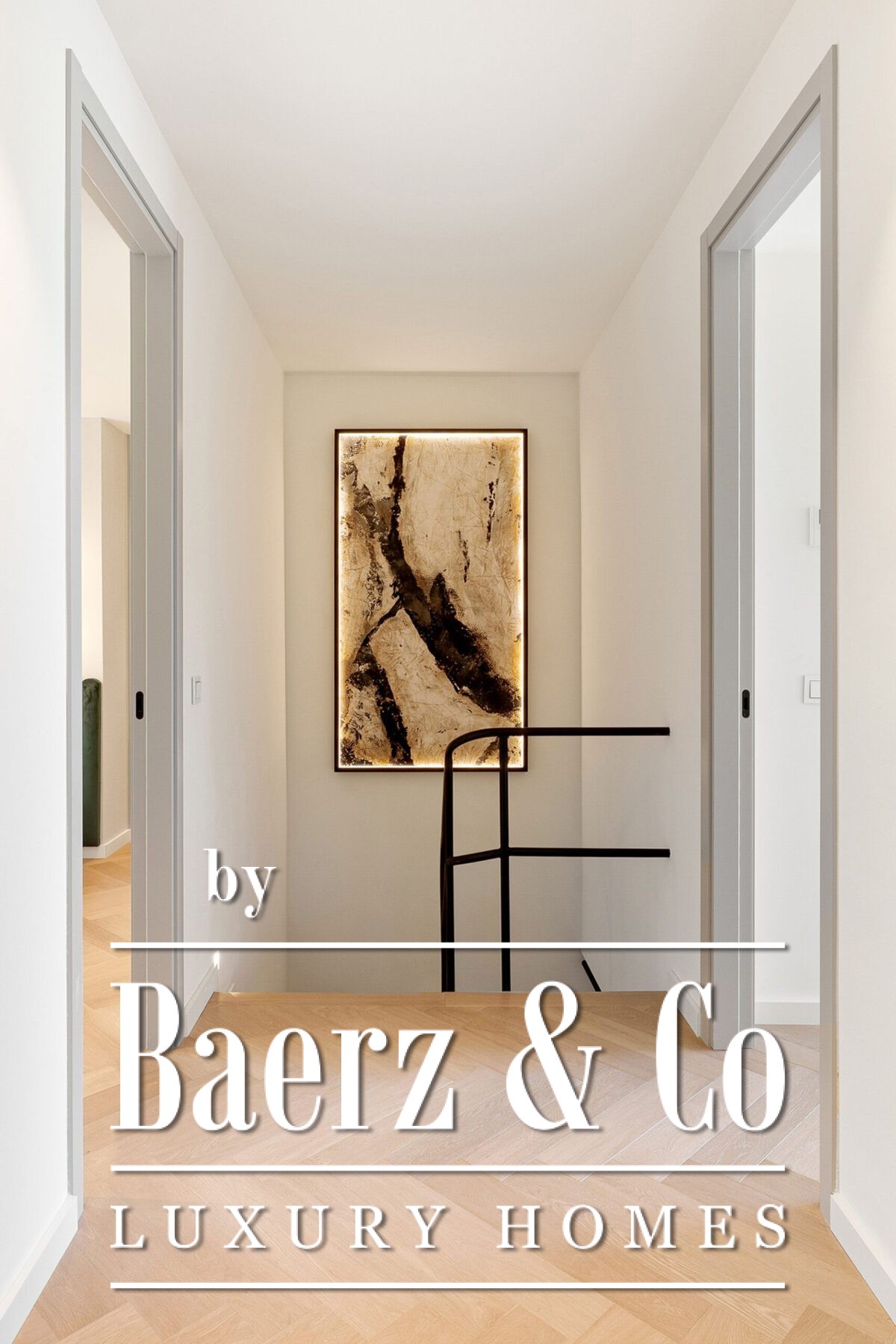 Op de begane grond accentueert natuurlijk licht het open leef- en eetgedeelte en de ultramoderne Gaggenau-keuken, allemaal voorzien van hoogwaardige hout- en marmeren accenten. Visgraatvloeren en een neutraal palet zorgen voor warmte en een ingetogen, verfijnde sfeer. Aansluitend aan de living nodigt het privéterras uit tot diners in de open lucht en momenten van rust en privacy. De royale mastersuite beschikt over een ruime inloopkast, een vrijstaand bad met uitzicht op het terras en een en-suite badkamer. Een extra slaapkamer op deze verdieping creëert flexibele mogelijkheden voor familie of gasten.