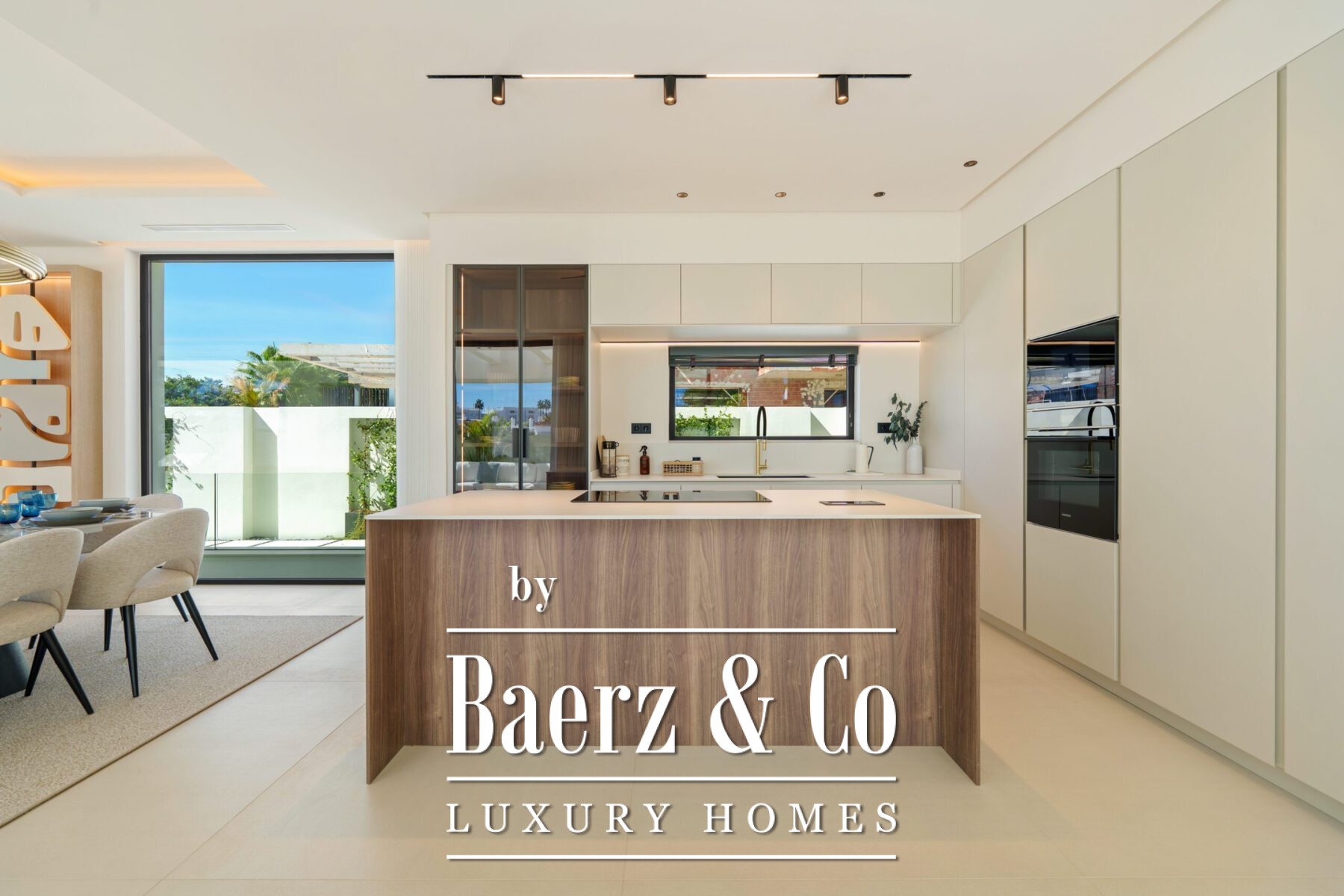 Het interieur ademt licht en sereniteit, met zachte neutrale tinten, subtiele inbouwverlichting en royale raampartijen van vloer tot plafond die het Andalusische licht binnenlaten. De open leef- en eetruimte, voorzien van een op maat gemaakte entertainmentwand en moderne afwerking, loopt naadloos over in de hoogwaardige keuken waar een houten kookeiland en geïntegreerde apparatuur samengaan met strak vormgegeven kasten. Deze vloeiende ruimte-ervaring zet zich voort in de eetkamer, ideaal voor betekenisvolle samenzijn.
