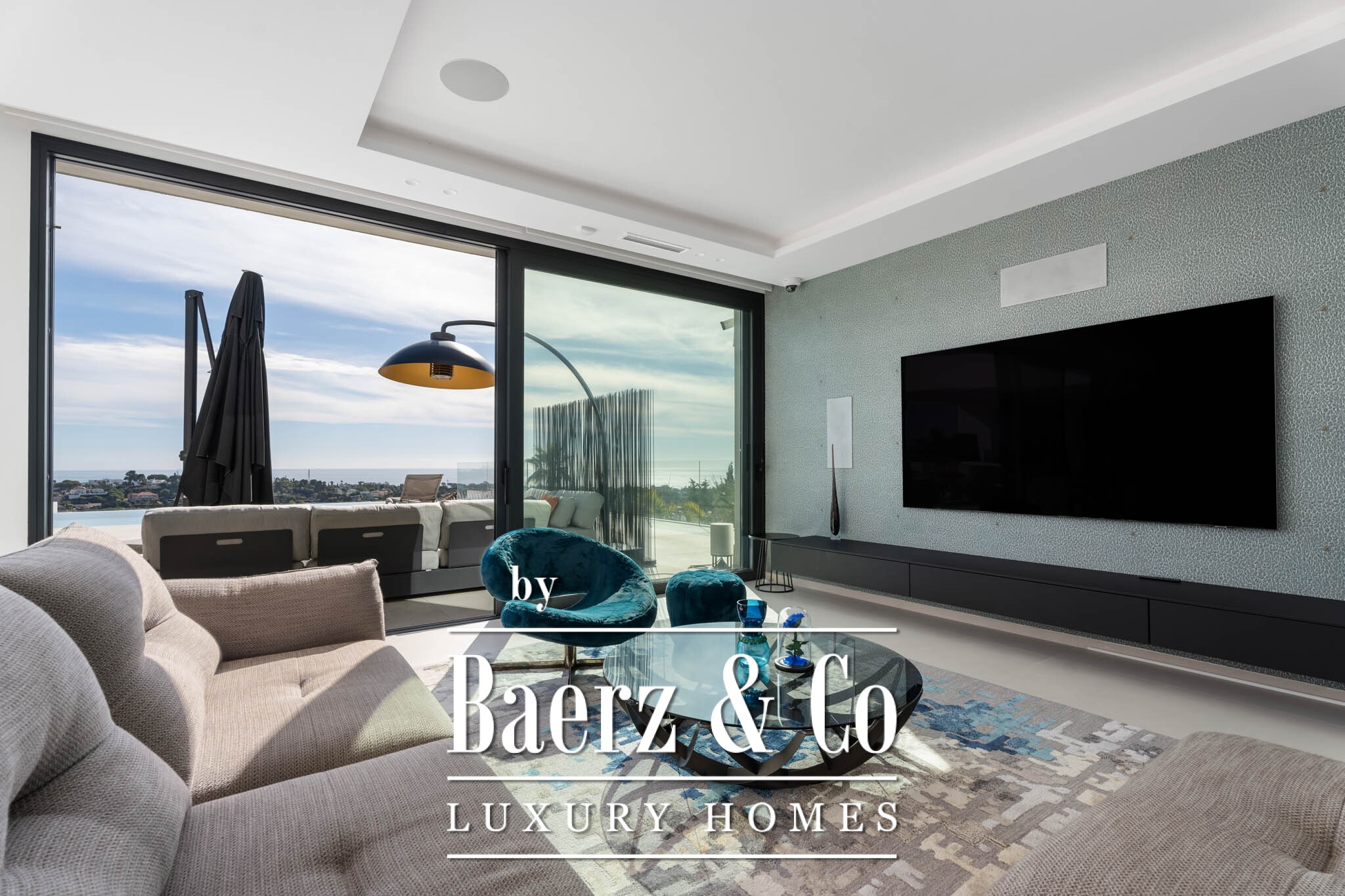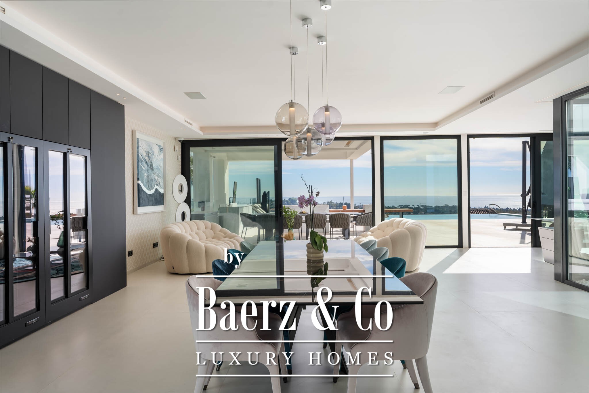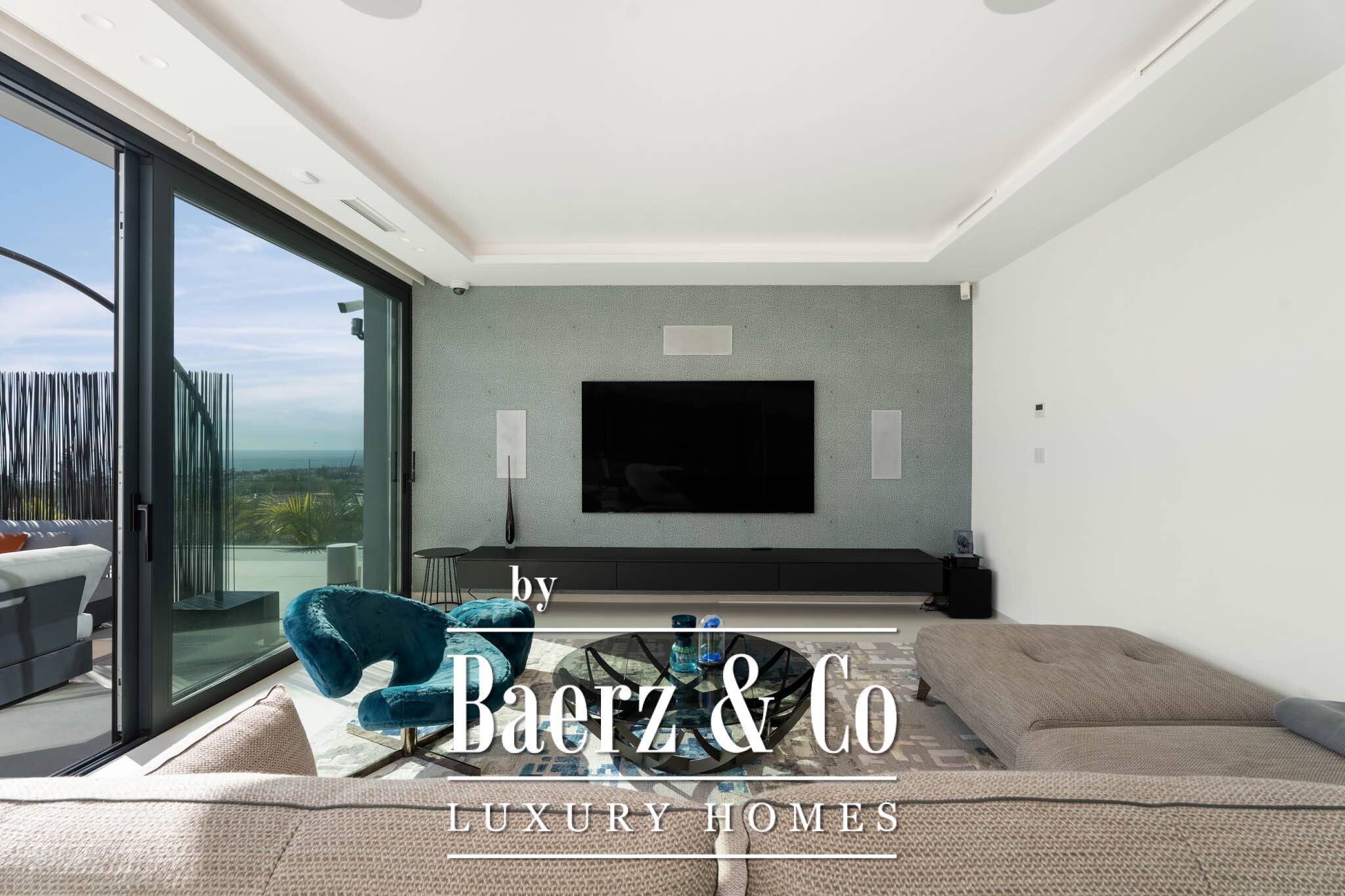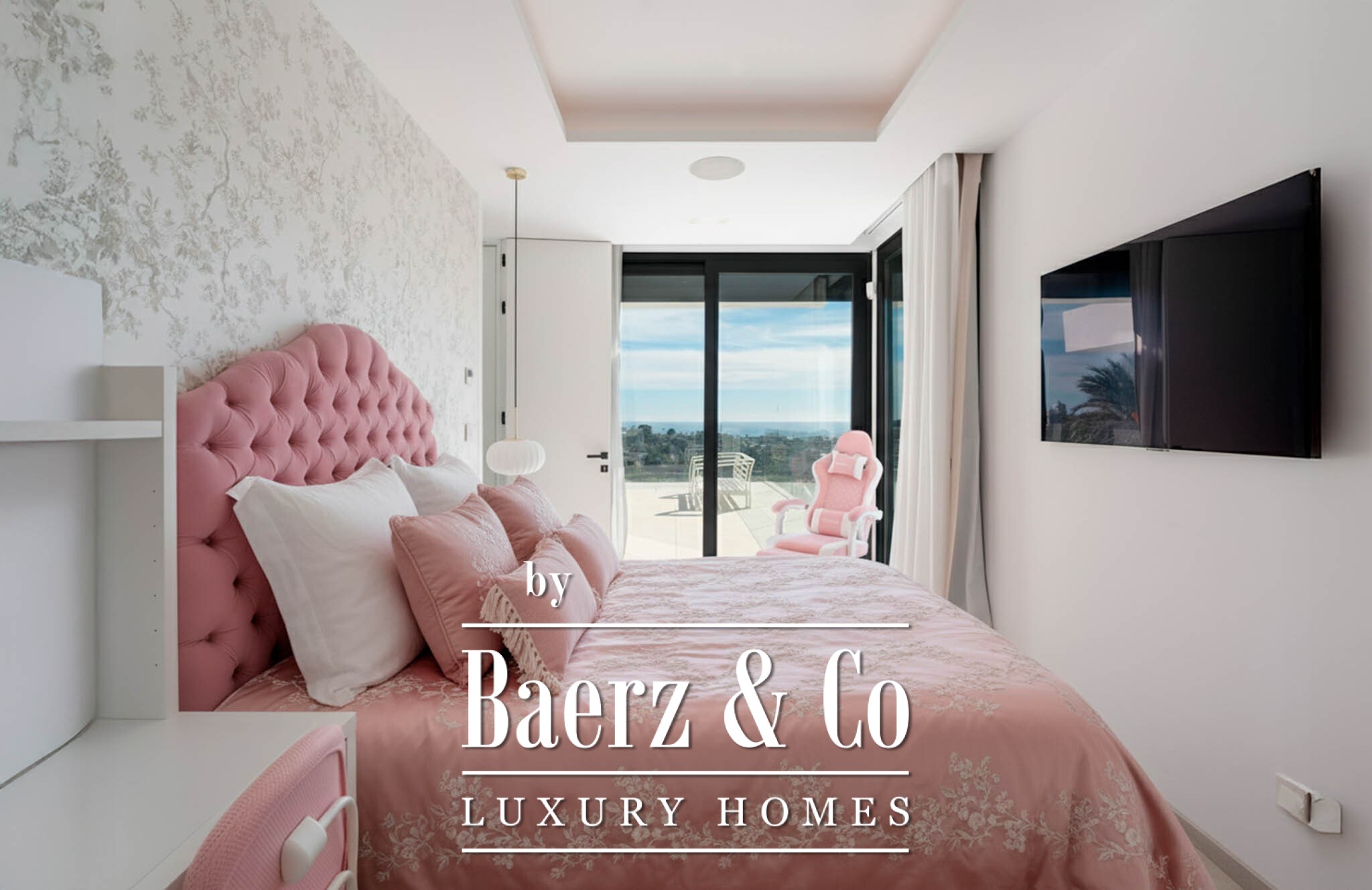 Zes slaapkamers, elk met een eigen badkamer, waarborgen comfort en discretie. De hoofdsuite biedt vrij uitzicht op zee en toegang tot een eigen terras. Op een hoger gelegen niveau zorgt een solarium met jacuzzi voor brede vergezichten van de golfbaan tot aan de verre Afrikaanse kust. De onderste verdieping herbergt entertainment- en wellnessruimtes, waaronder een fitnessruimte, sauna, bioscoopzaal en aparte loungeplekken. Een grote garage met draaiplateaus biedt extra gebruiksgemak.