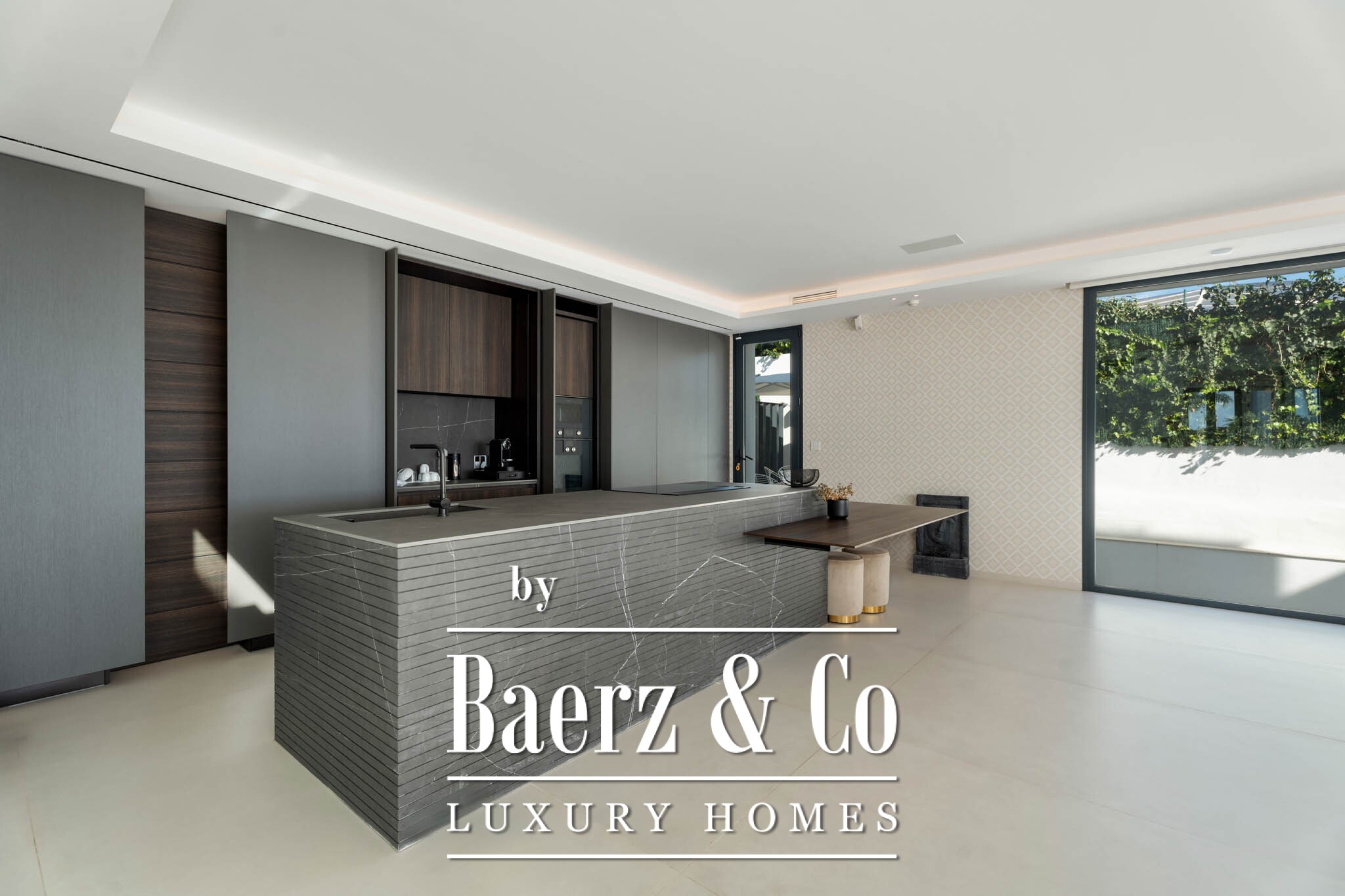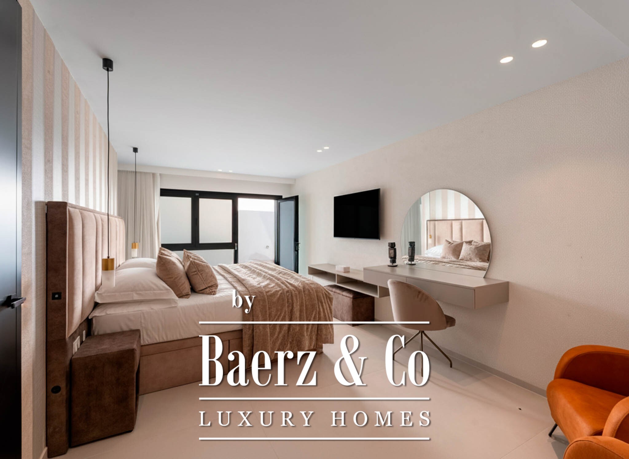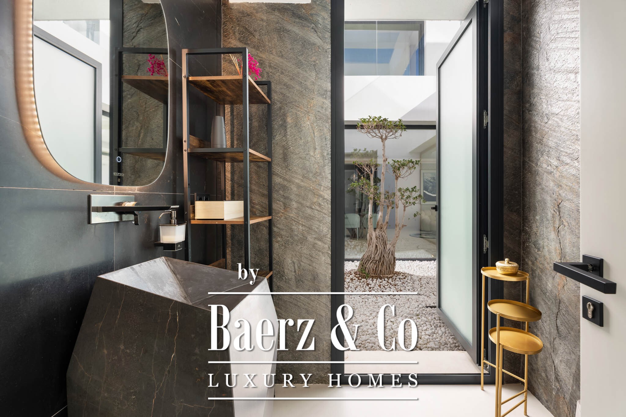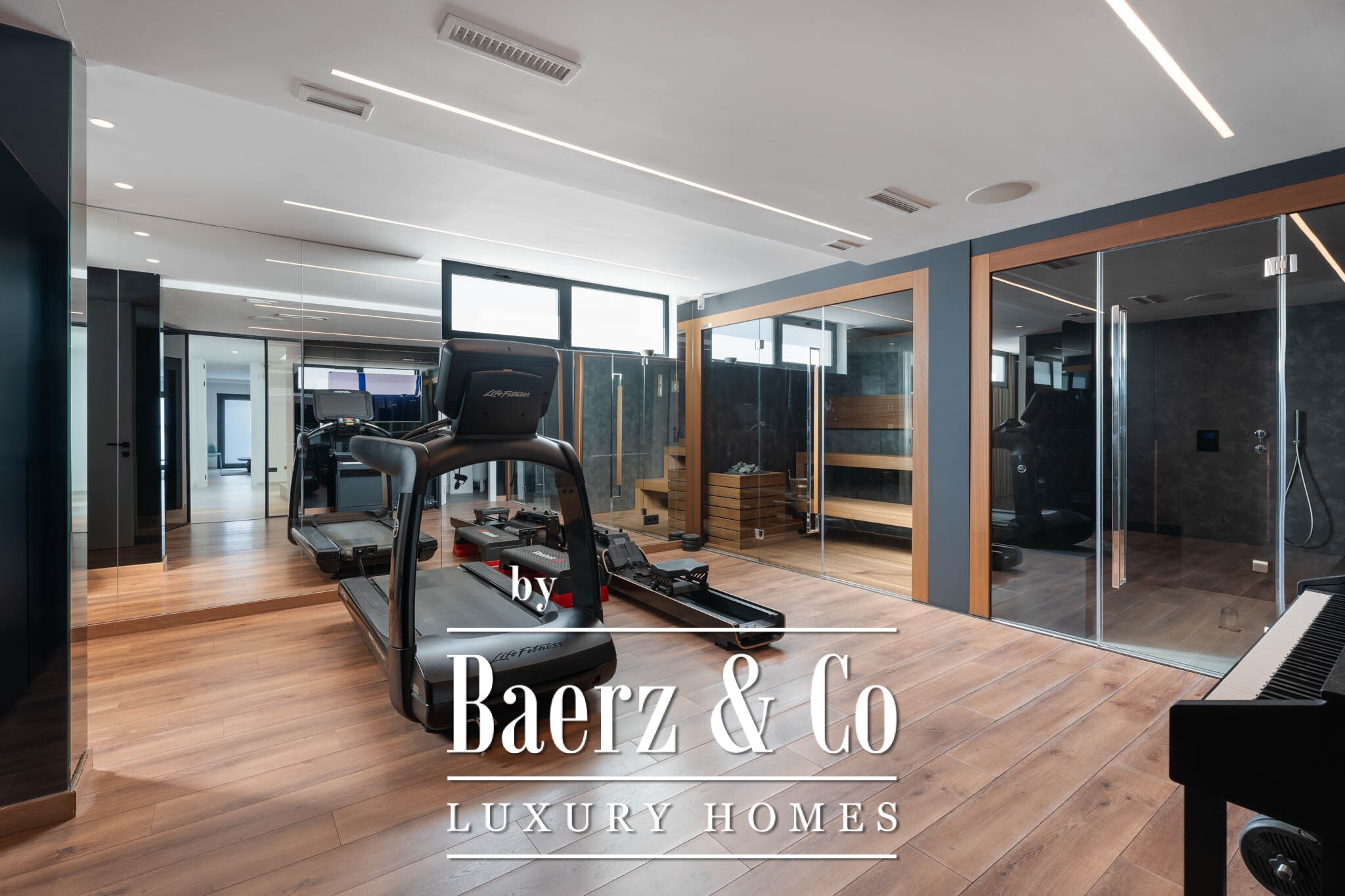 Zes slaapkamers, elk met een eigen badkamer, waarborgen comfort en discretie. De hoofdsuite biedt vrij uitzicht op zee en toegang tot een eigen terras. Op een hoger gelegen niveau zorgt een solarium met jacuzzi voor brede vergezichten van de golfbaan tot aan de verre Afrikaanse kust. De onderste verdieping herbergt entertainment- en wellnessruimtes, waaronder een fitnessruimte, sauna, bioscoopzaal en aparte loungeplekken. Een grote garage met draaiplateaus biedt extra gebruiksgemak.