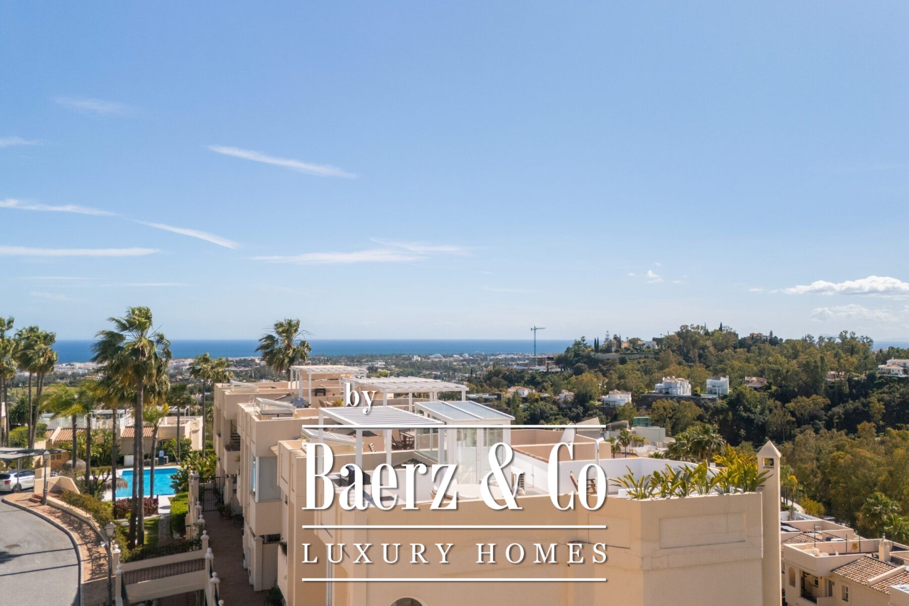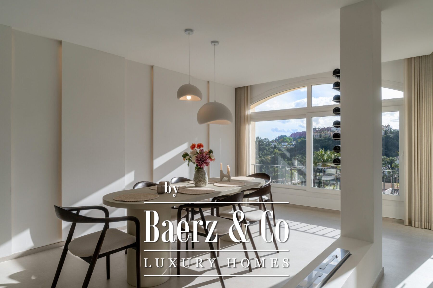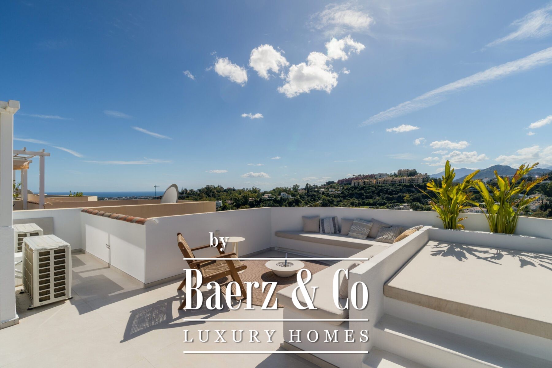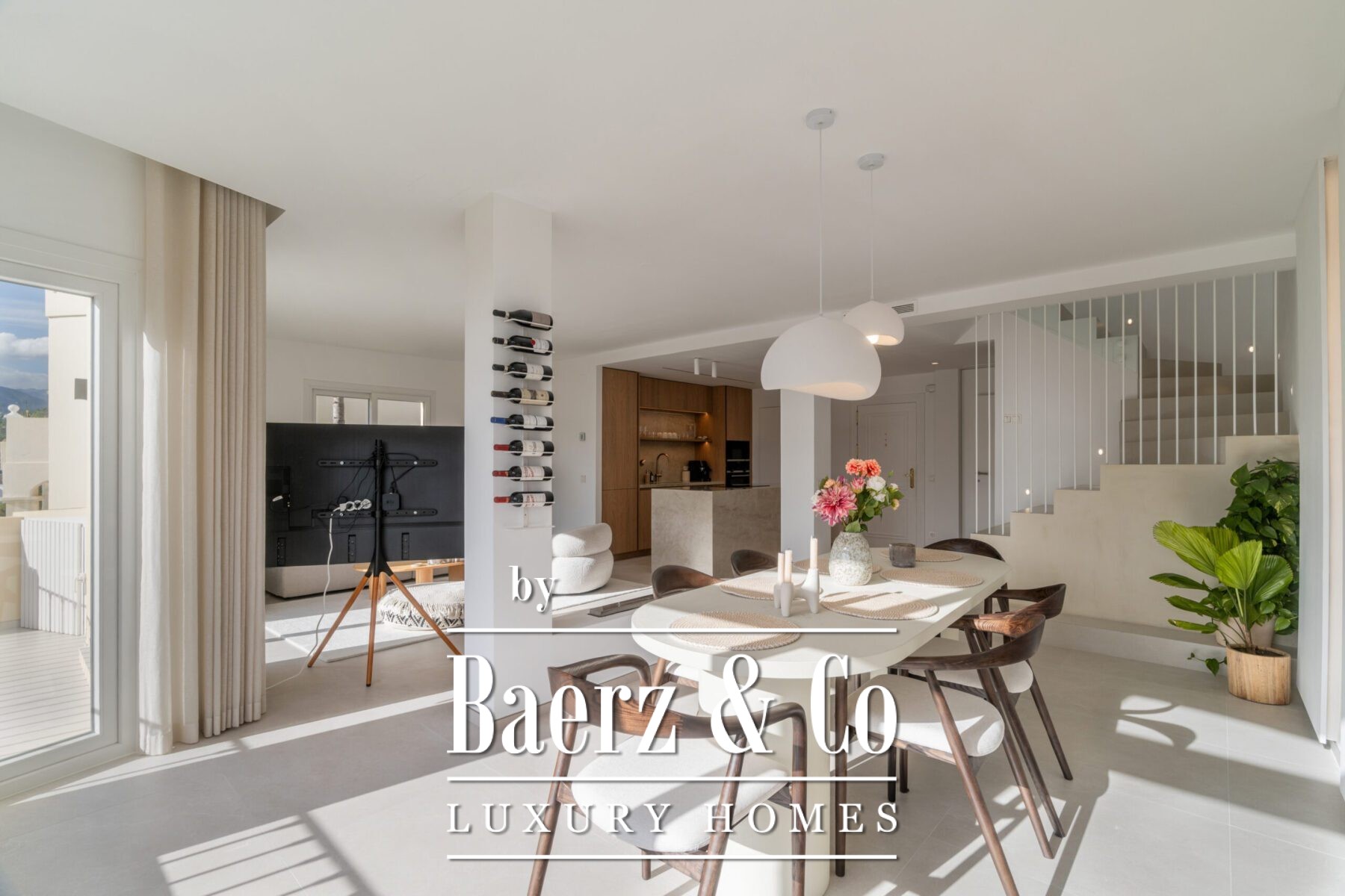 Dit duplex penthouse in Benahavís staat voor wonen op niveau, met 200 m² zorgvuldig ingedeelde leefruimte en een bevoorrechte ligging binnen een beveiligde, afgesloten residentie. De hoofdverdieping is open en vloeiend opgezet, waarbij keuken, eetkamer en woonkamer naadloos overgaan in een privébalkon. Dubbel glas zorgt voor een zee aan licht en omlijst vergezichten over de Middellandse Zee en de omliggende bergen.