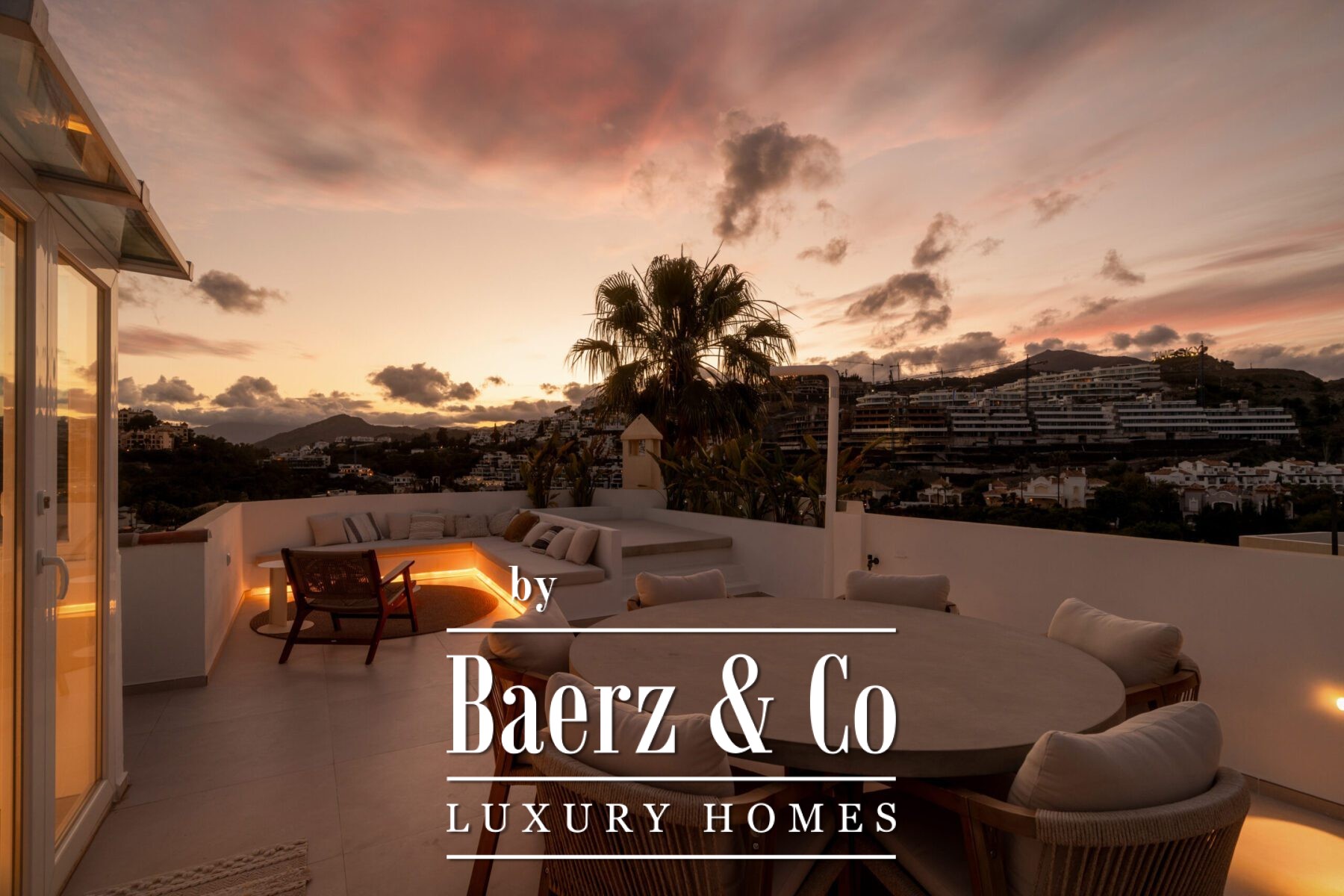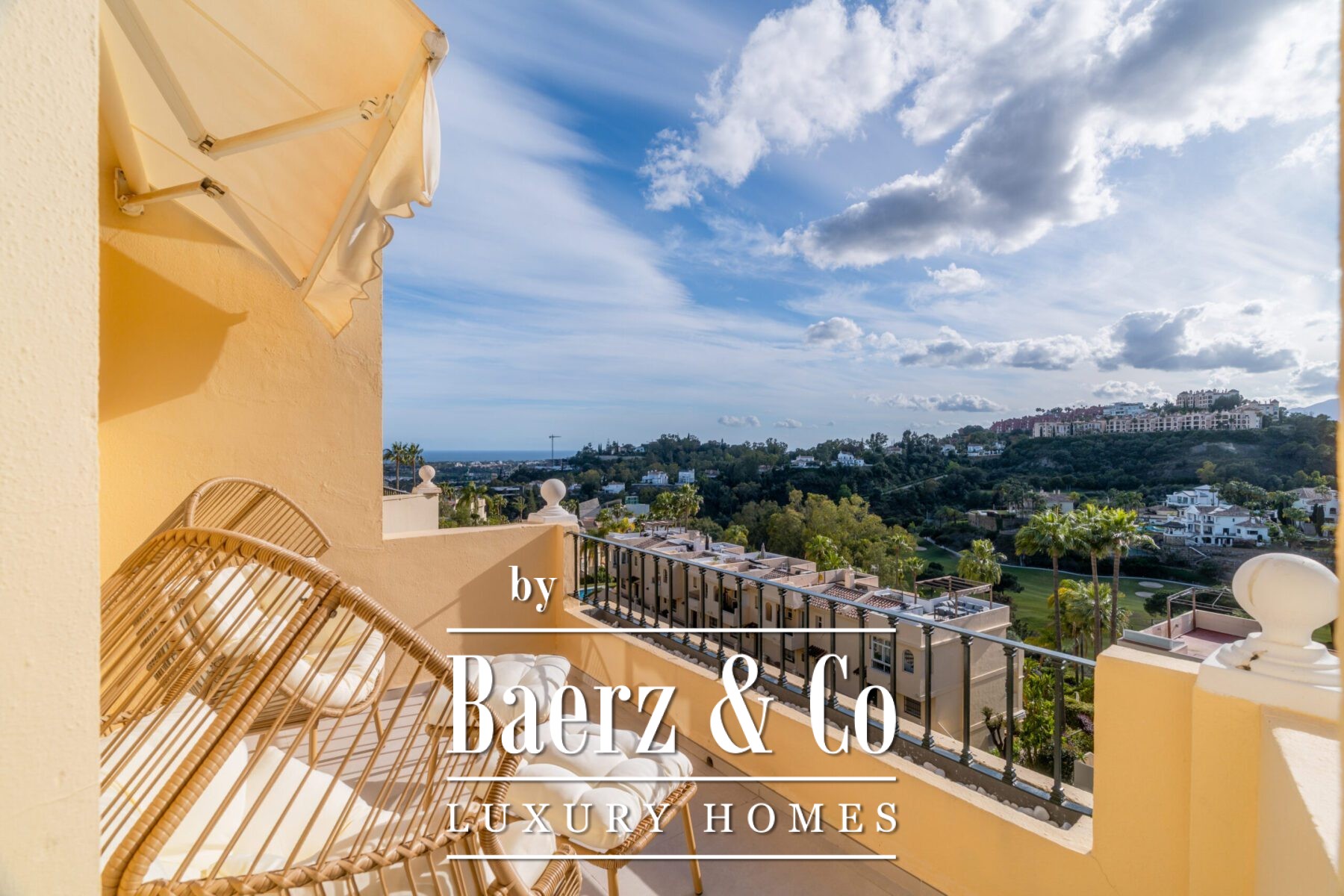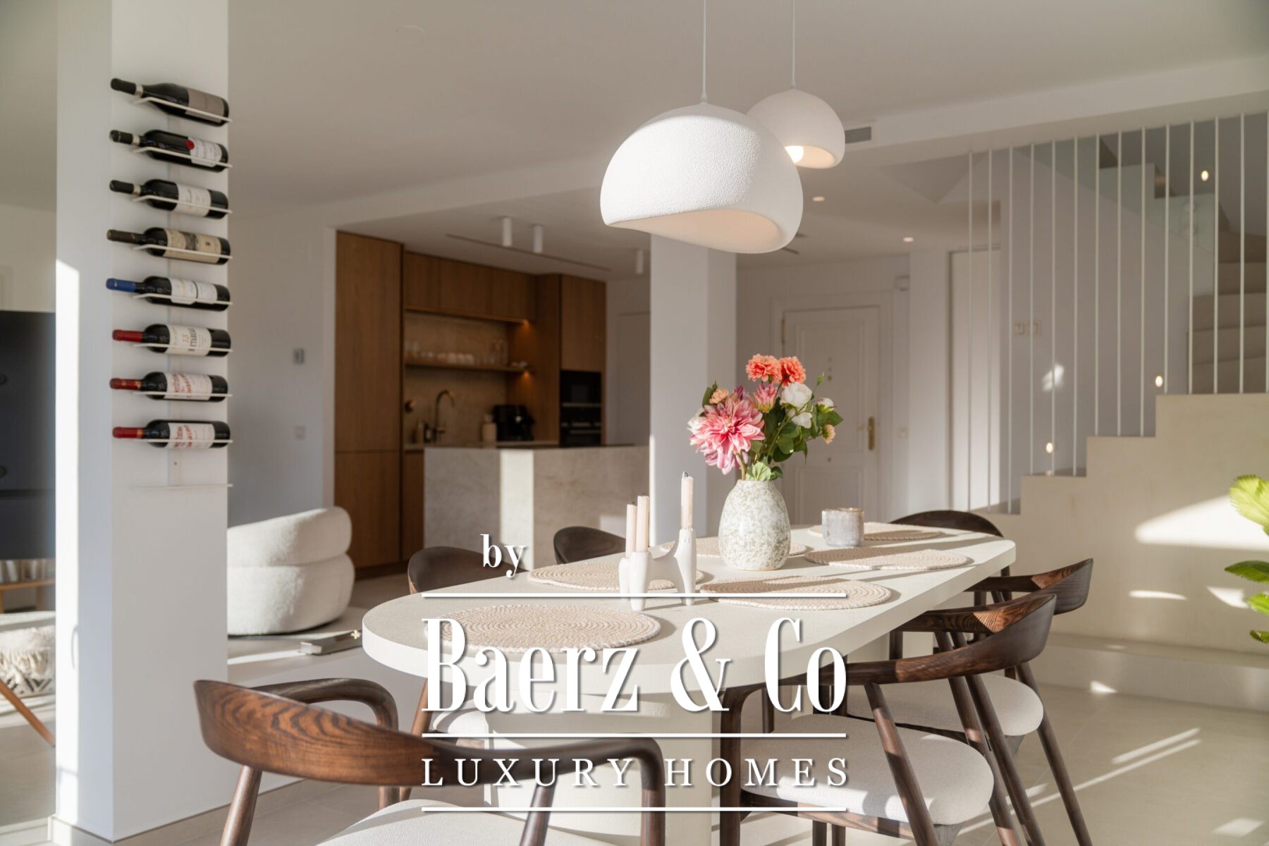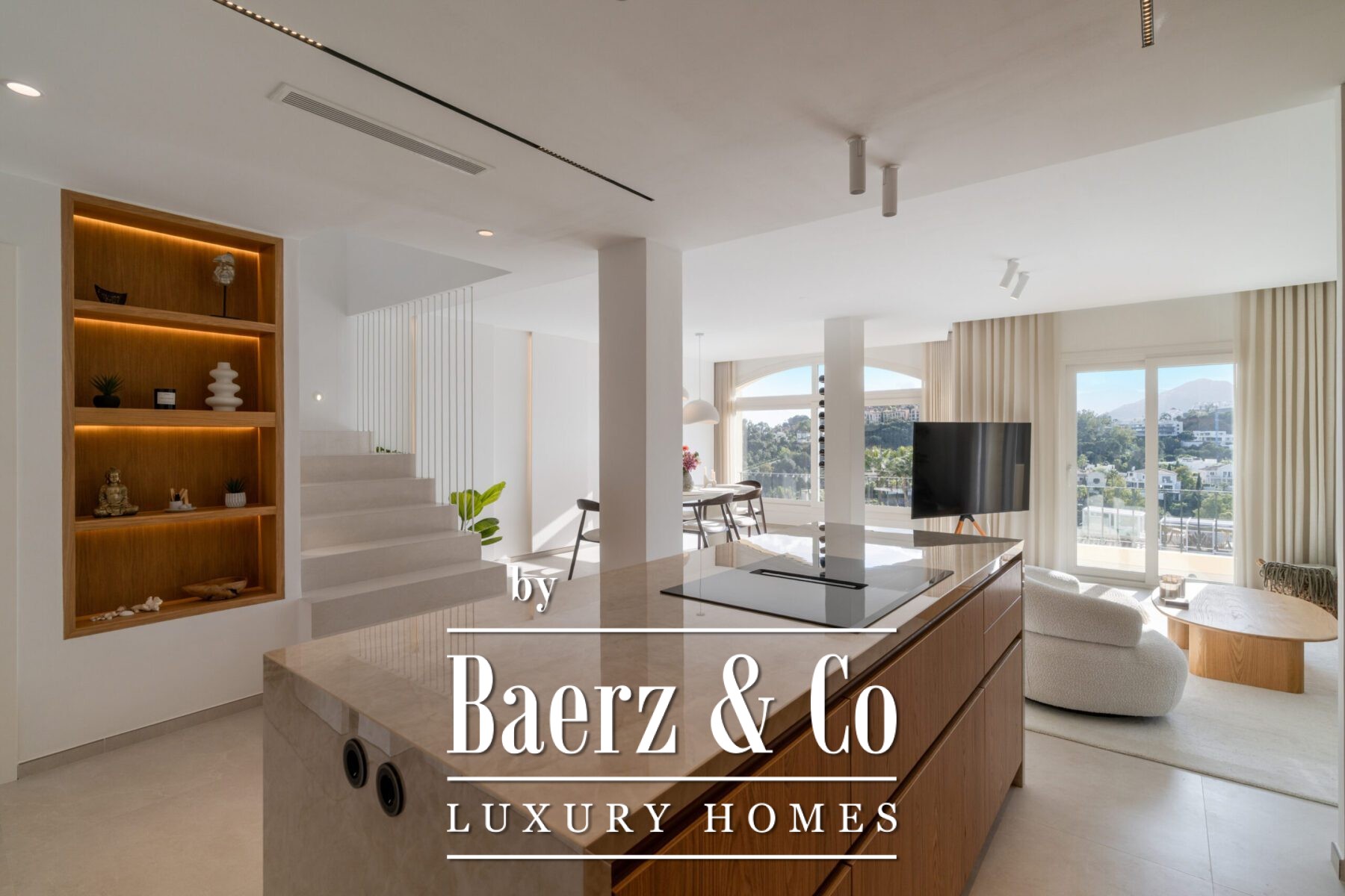 Dit duplex penthouse in Benahavís staat voor wonen op niveau, met 200 m² zorgvuldig ingedeelde leefruimte en een bevoorrechte ligging binnen een beveiligde, afgesloten residentie. De hoofdverdieping is open en vloeiend opgezet, waarbij keuken, eetkamer en woonkamer naadloos overgaan in een privébalkon. Dubbel glas zorgt voor een zee aan licht en omlijst vergezichten over de Middellandse Zee en de omliggende bergen.