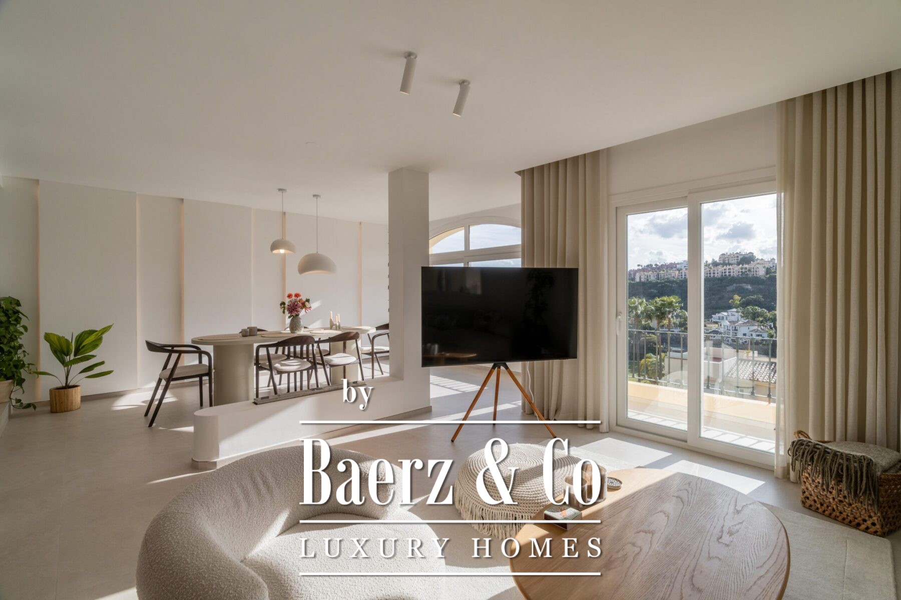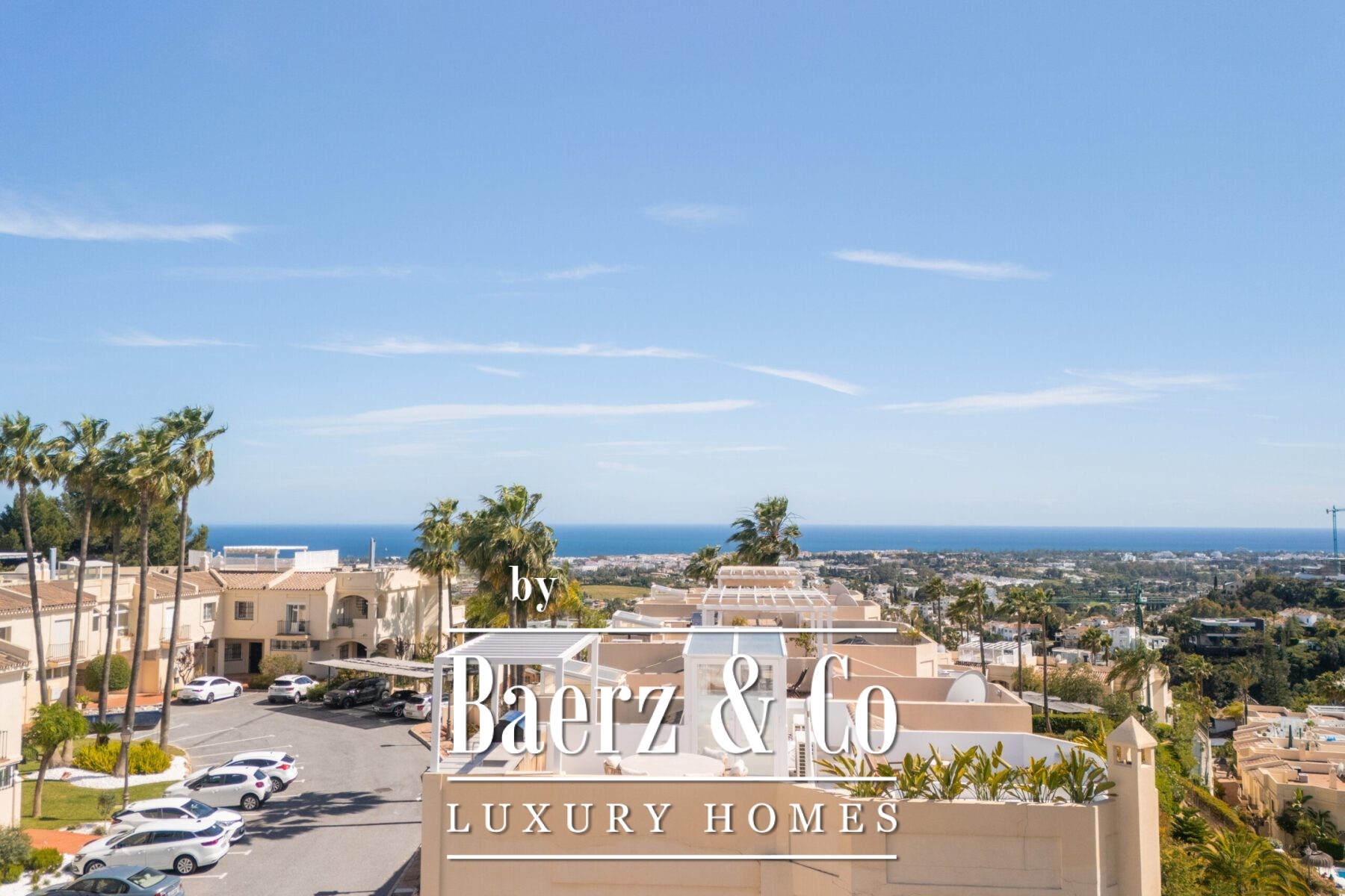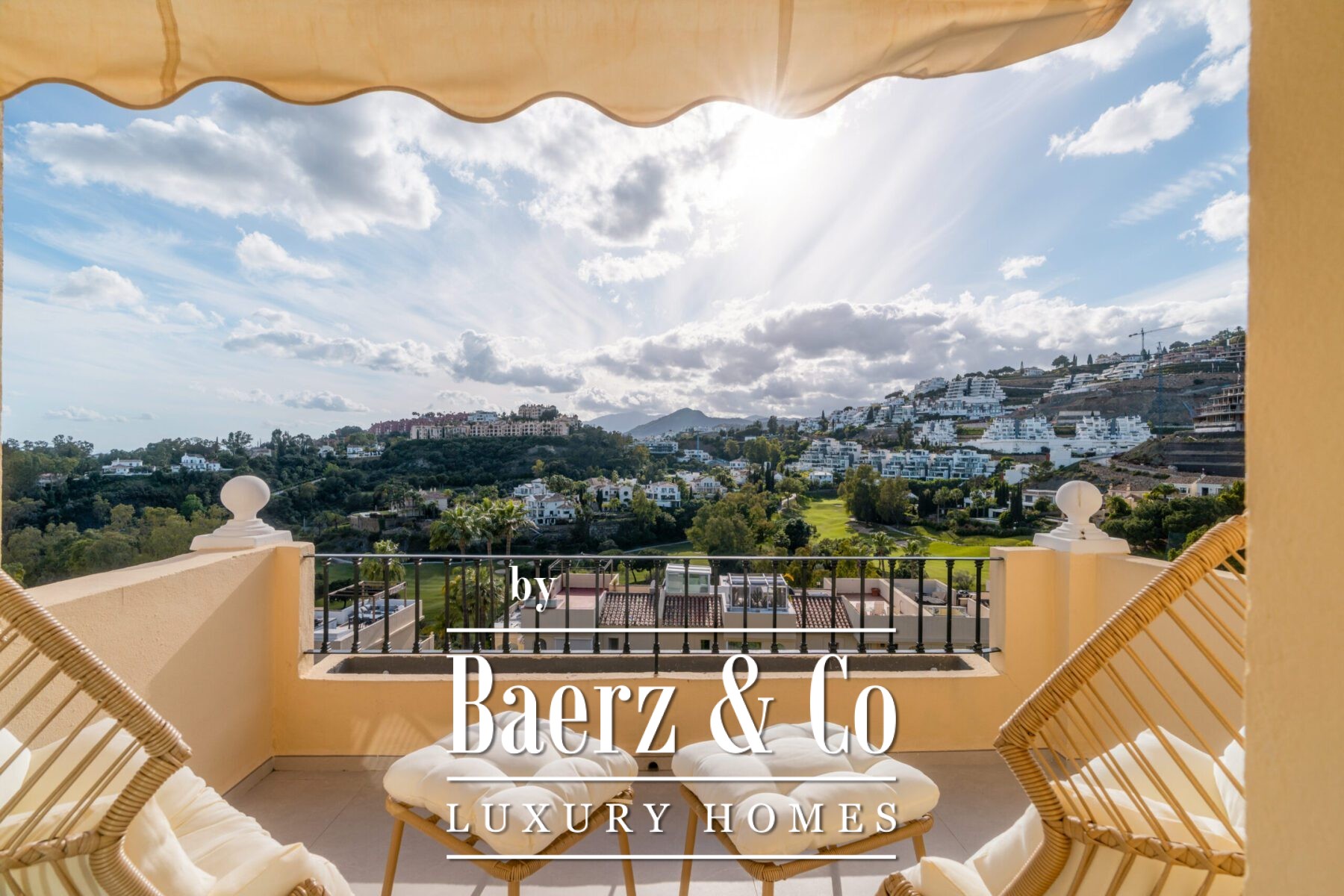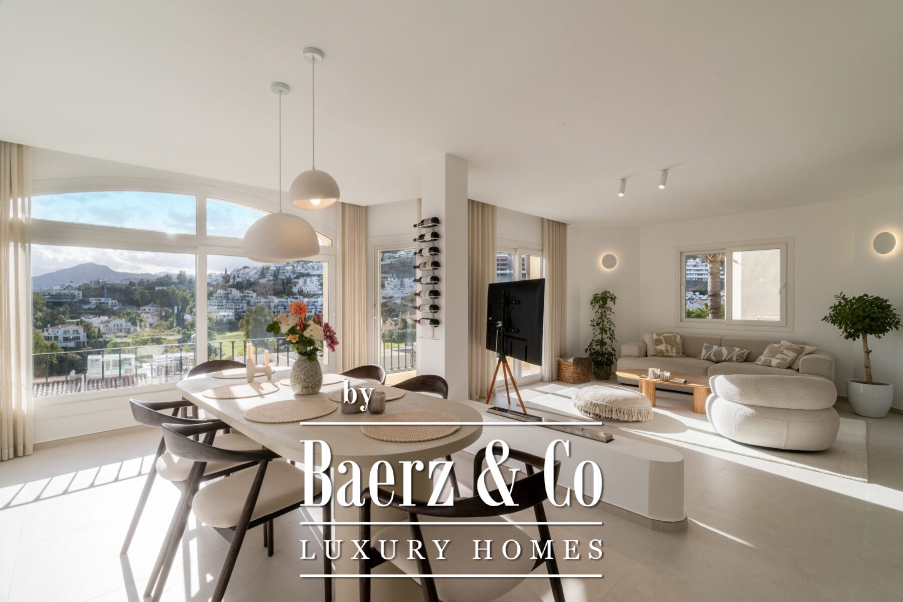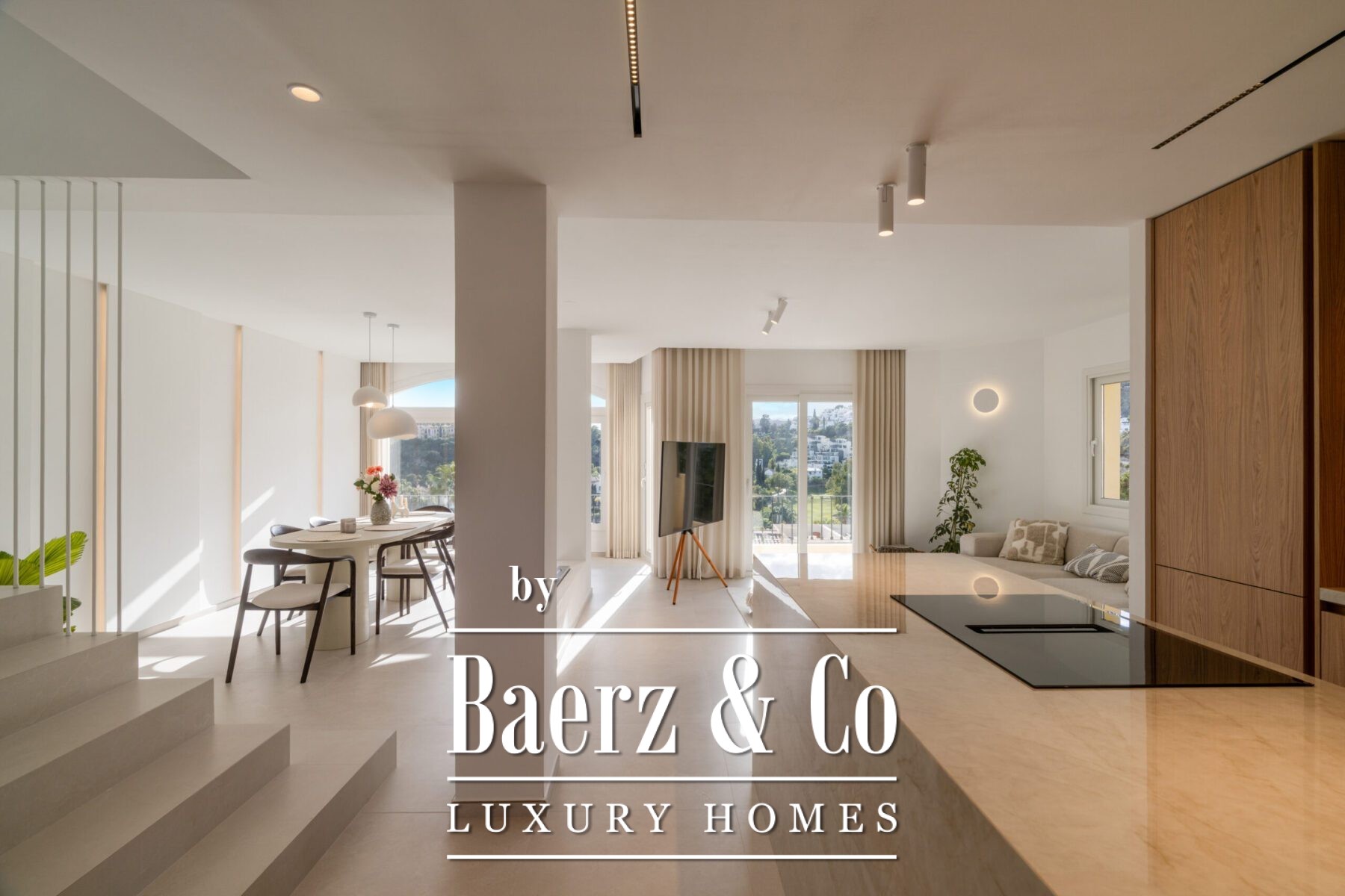 Dit duplex penthouse in Benahavís staat voor wonen op niveau, met 200 m² zorgvuldig ingedeelde leefruimte en een bevoorrechte ligging binnen een beveiligde, afgesloten residentie. De hoofdverdieping is open en vloeiend opgezet, waarbij keuken, eetkamer en woonkamer naadloos overgaan in een privébalkon. Dubbel glas zorgt voor een zee aan licht en omlijst vergezichten over de Middellandse Zee en de omliggende bergen.