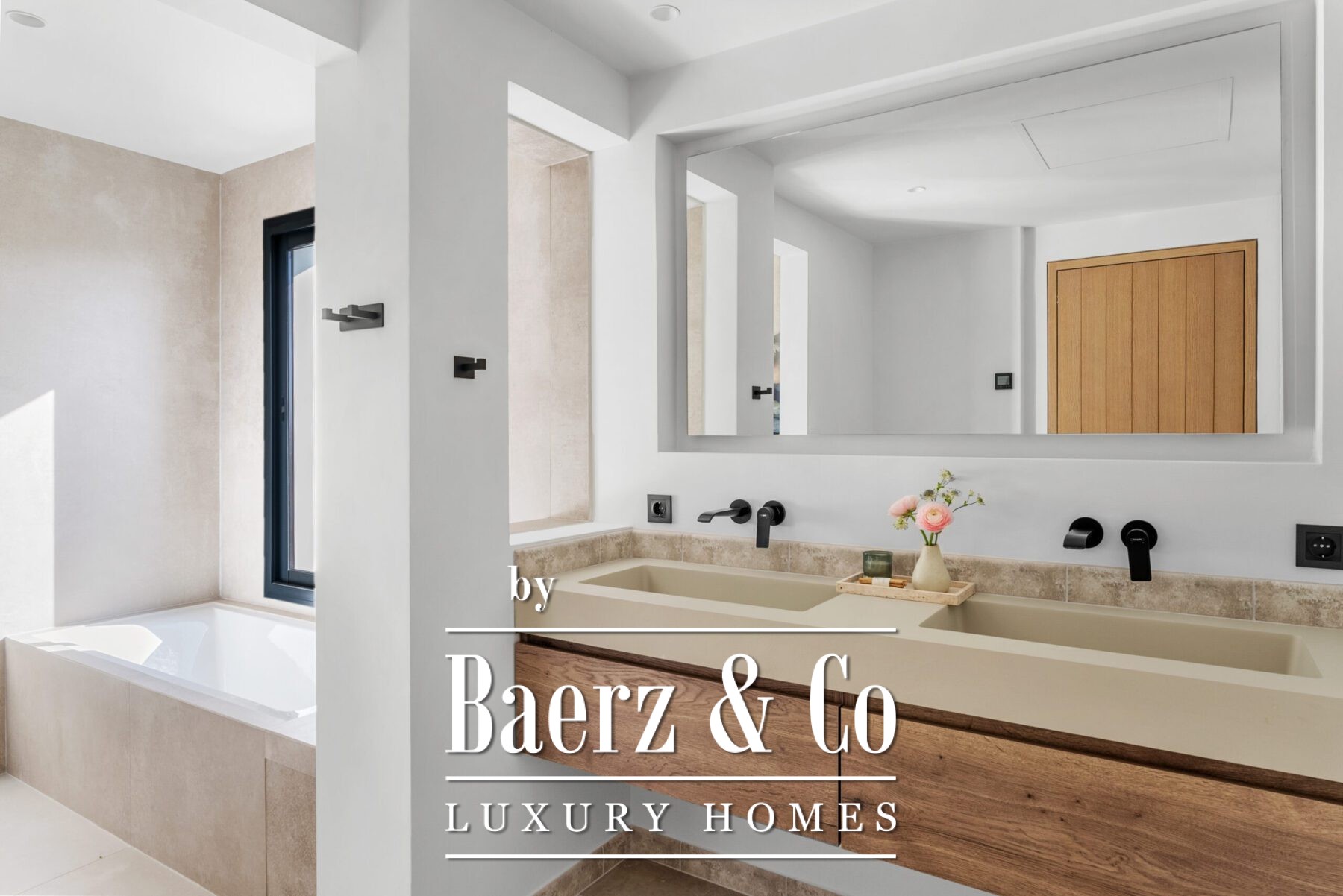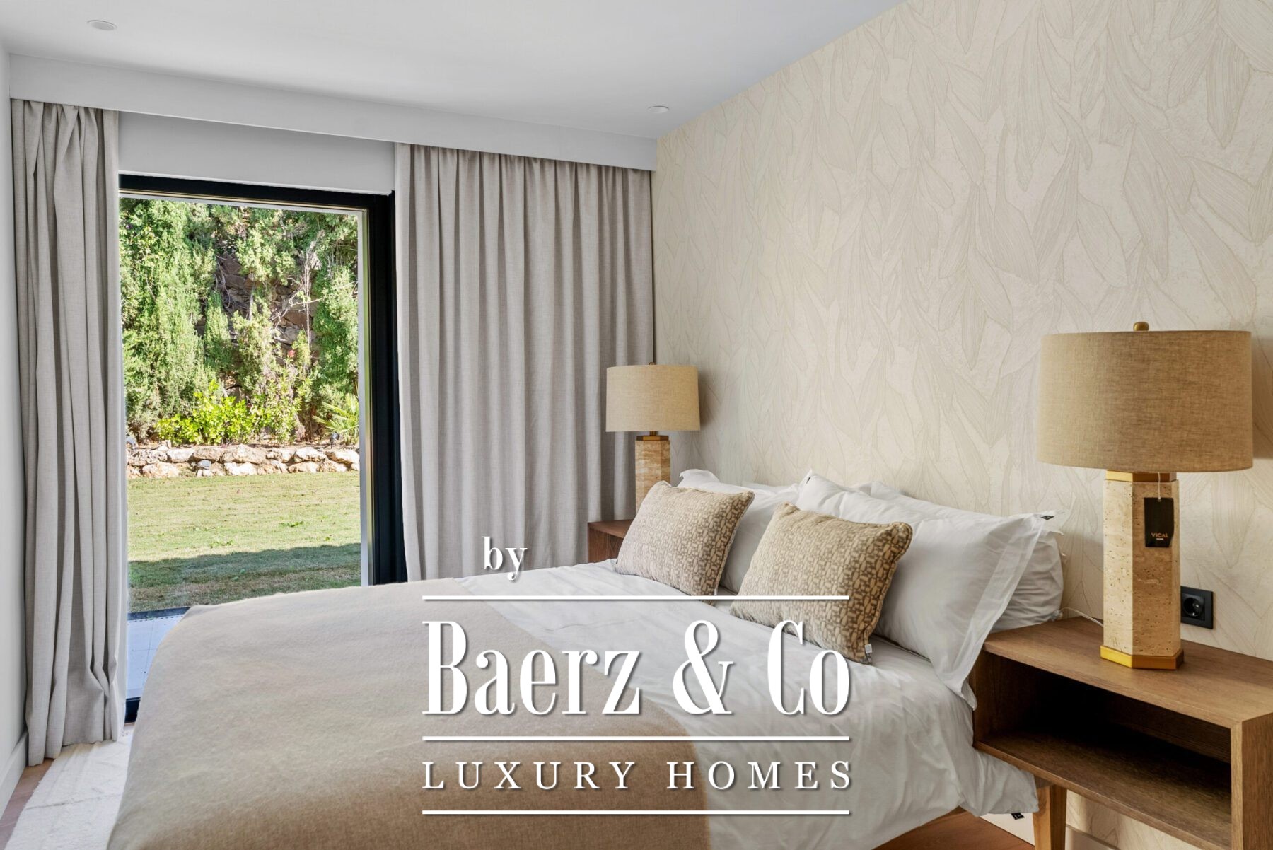Binnen creëren plafonds met dubbele hoogte een luchtig ritme in de hoofdwoonkamer, waar glazen schuifdeuren van vloer tot plafond naadloos openen naar het omliggende landschap. Een marmeren chef-keuken van Miele, een kenmerkende open haard en royale woonruimtes ademen een ingetogen verfijning. Alle vier de slaapkamers zijn voorzien van en-suite badkamers en op maat gemaakte inloopkasten, met directe toegang tot de tuin op het lagere niveau. De master suite onderscheidt zich met een privéterras, waar het ononderbroken uitzicht op de bergen uitnodigt tot reflectie en verstilling.