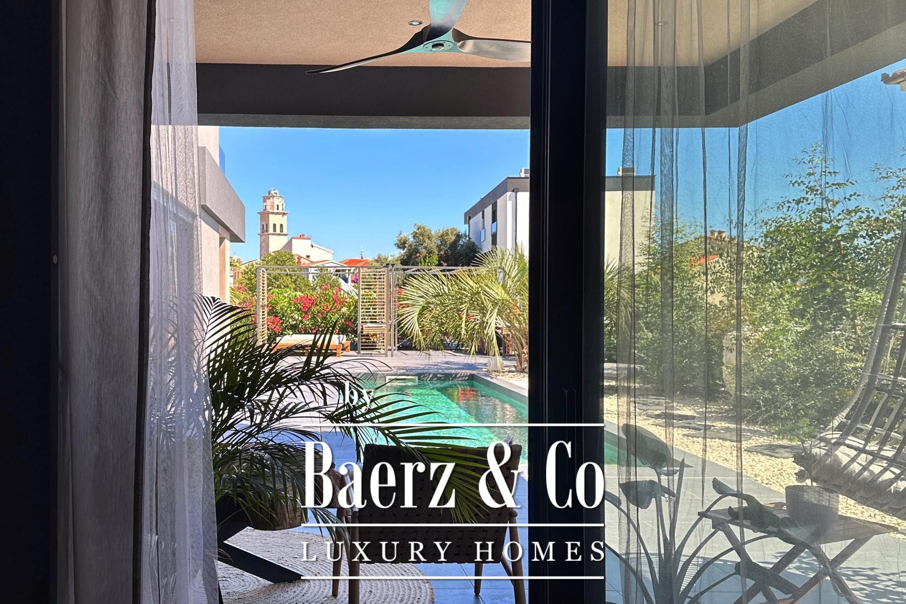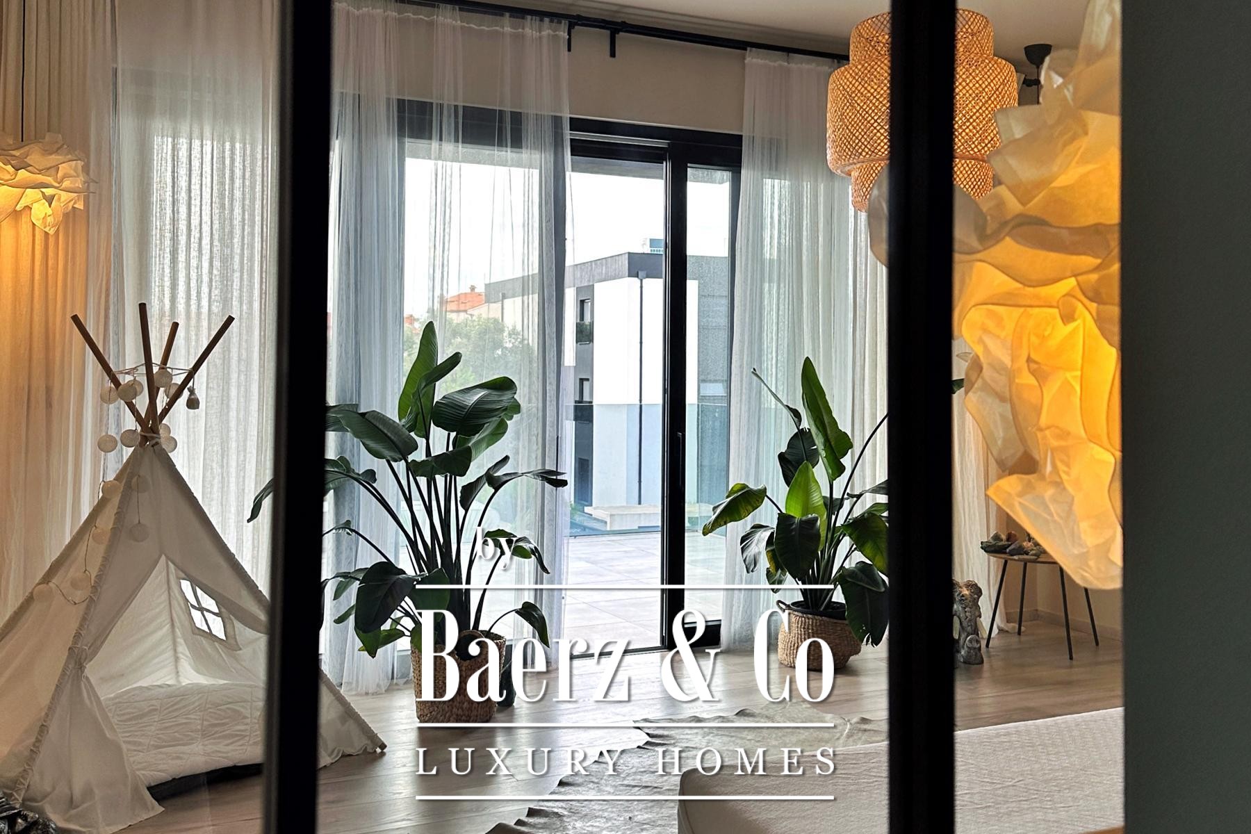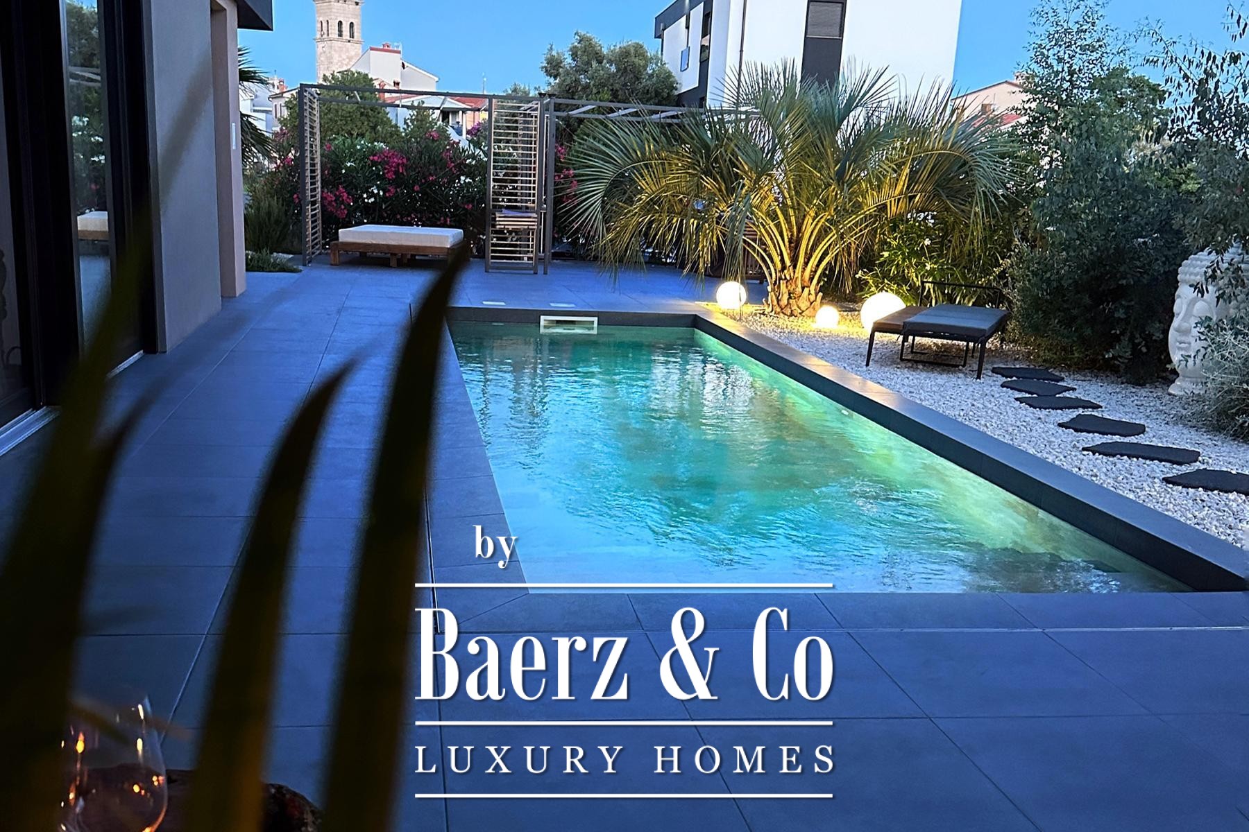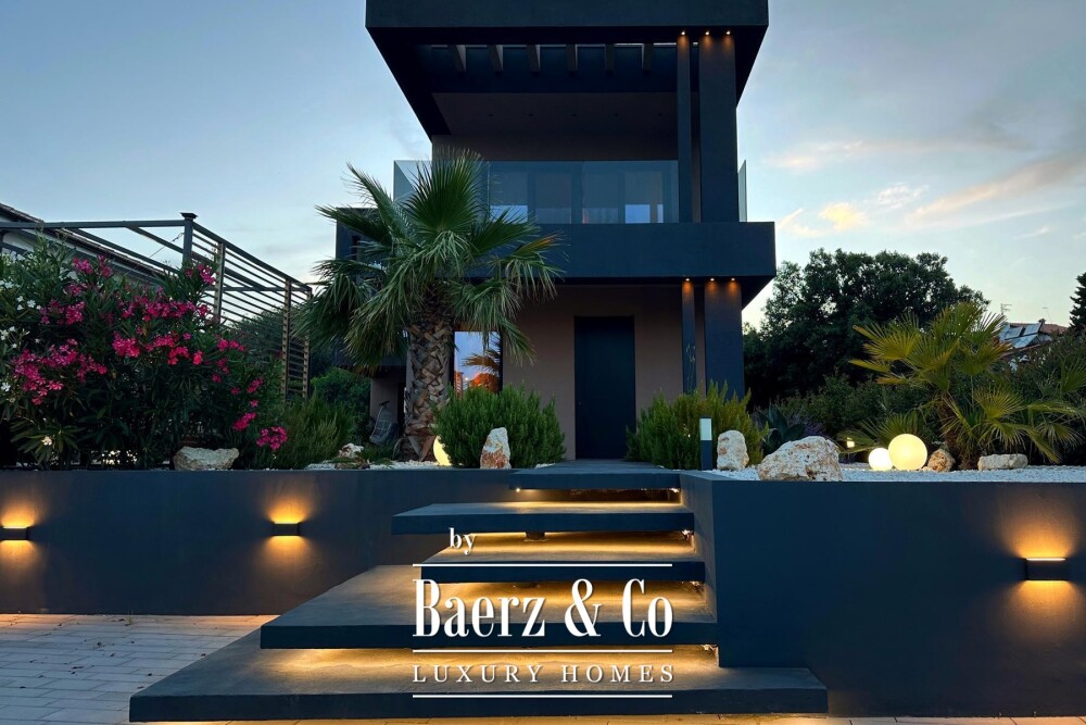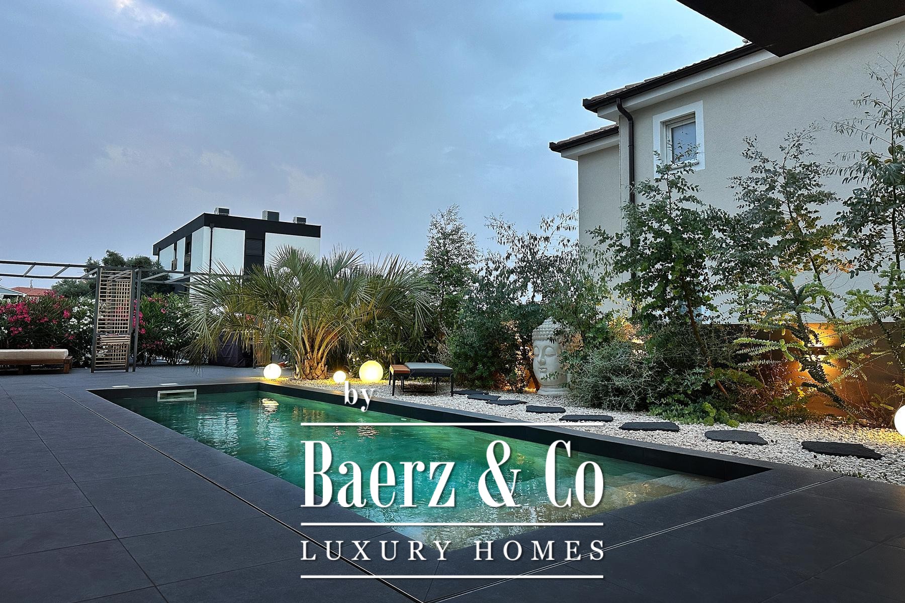 Villa Premantura Medulin ligt op een fraai aangelegd perceel van 710 m² aan de zuidrand van het Istrische schiereiland. De woning beslaat 205 m² en ademt rust dankzij sobere architectonische lijnen en het natuurlijke licht dat elke ruimte vormgeeft. De royale woonkamer op de begane grond verwelkomt u met warme tinten, maatwerkmeubilair en een sfeerbepalende open haard. Kamerhoge raampartijen bieden uitzicht op het zwembad en de tuin, waardoor binnen en buiten naadloos in elkaar overlopen. Een comfortabele keuken, een slaapkamer, een gastentoilet, diverse utiliteitsruimten en toegang tot de achtertuin faciliteren zowel ontspannen wonen als praktisch gebruik.