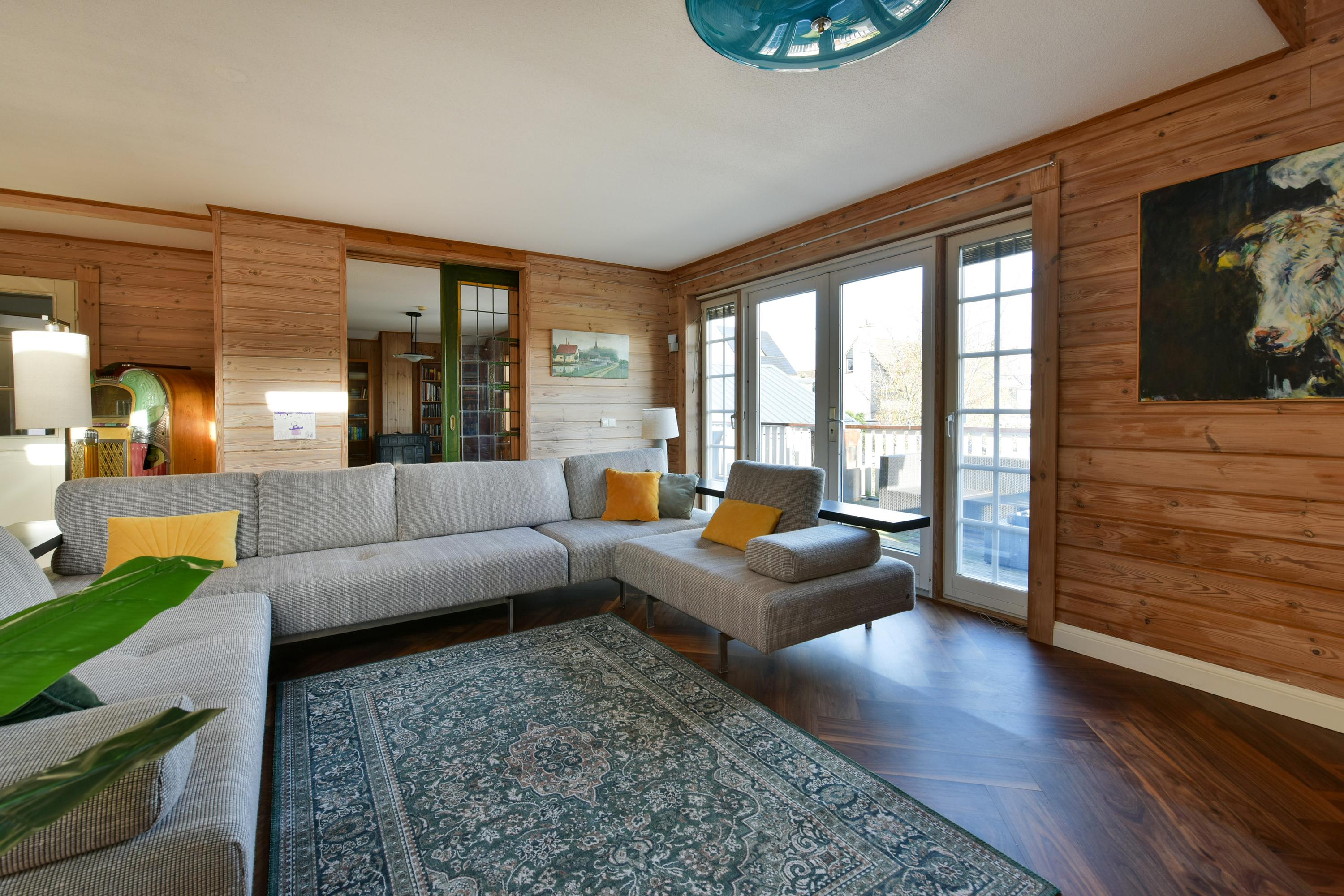 Via een charmante, beschutte binnenplaats bereik je de houten trap die je naar de veranda rondom de woning leidt. Bij binnenkomst stap je de royale hal binnen, waar een toilet met wastafel te vinden is en waar je toegang hebt tot de woonkamer, de bibliotheek en de bijkeuken. De lichte en ruime woonkamer is een ware oase van sfeer, dankzij de notenhouten visgraatvloer, de glas-in-lood schuifdeuren naar de bibliotheek en de openslaande deuren naar zowel de veranda als de tuin. Veel natuurlijk daglicht wordt in de woonkamer gegeven door de lichtstraat van dakramen die op het zuiden gesitueerd zijn.