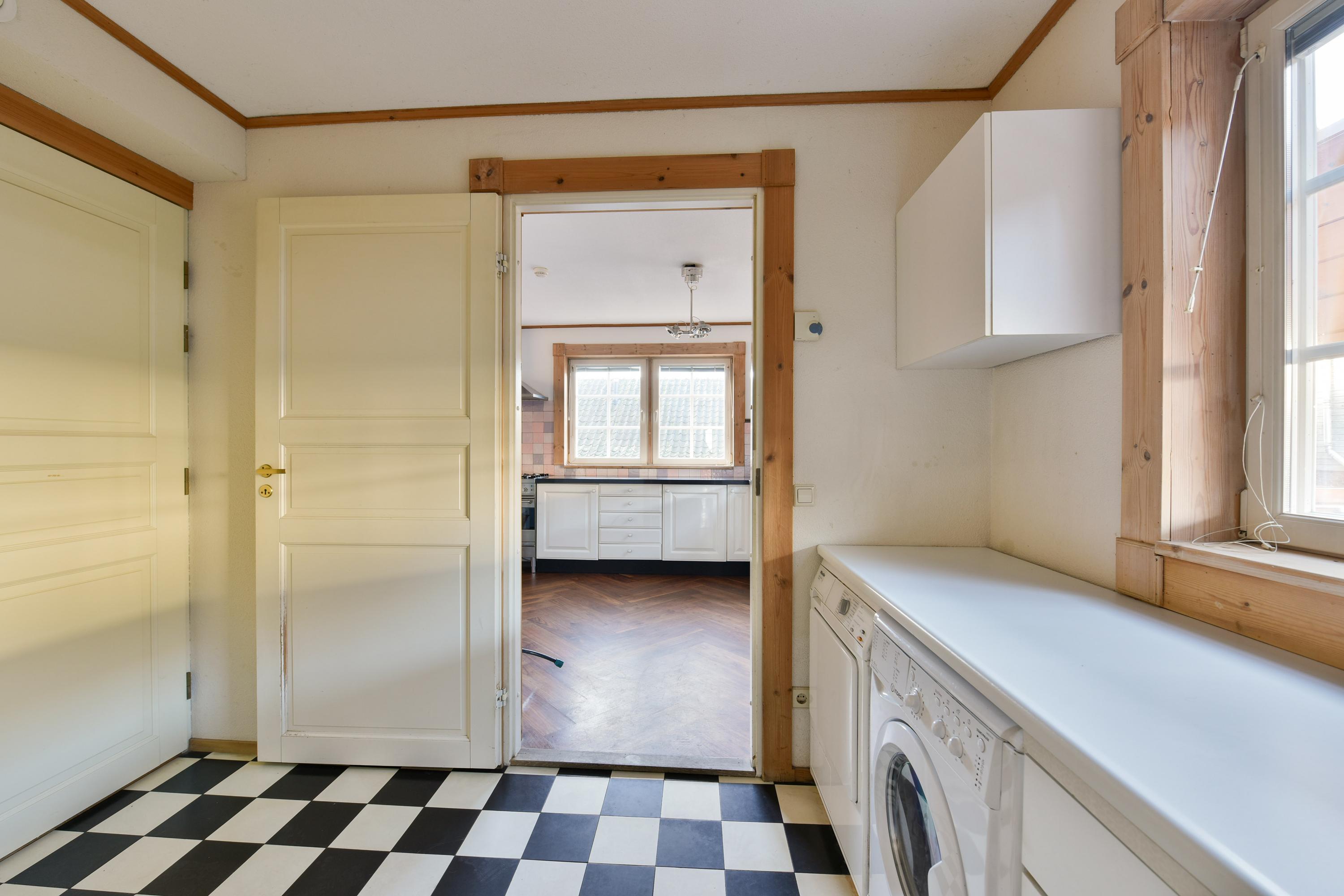 Vanuit de keuken kom je in de praktische, ruime bijkeuken met een zwart-witte tegelvloer. Hier bevinden zich aansluitingen voor de wasmachine en de wasdroger onder een mooie werktafel met kastjes voor extra opbergruimte. Vanuit de bijkeuken heb je toegang tot de centrale hal en via een trap naar beneden naar het souterrain.
