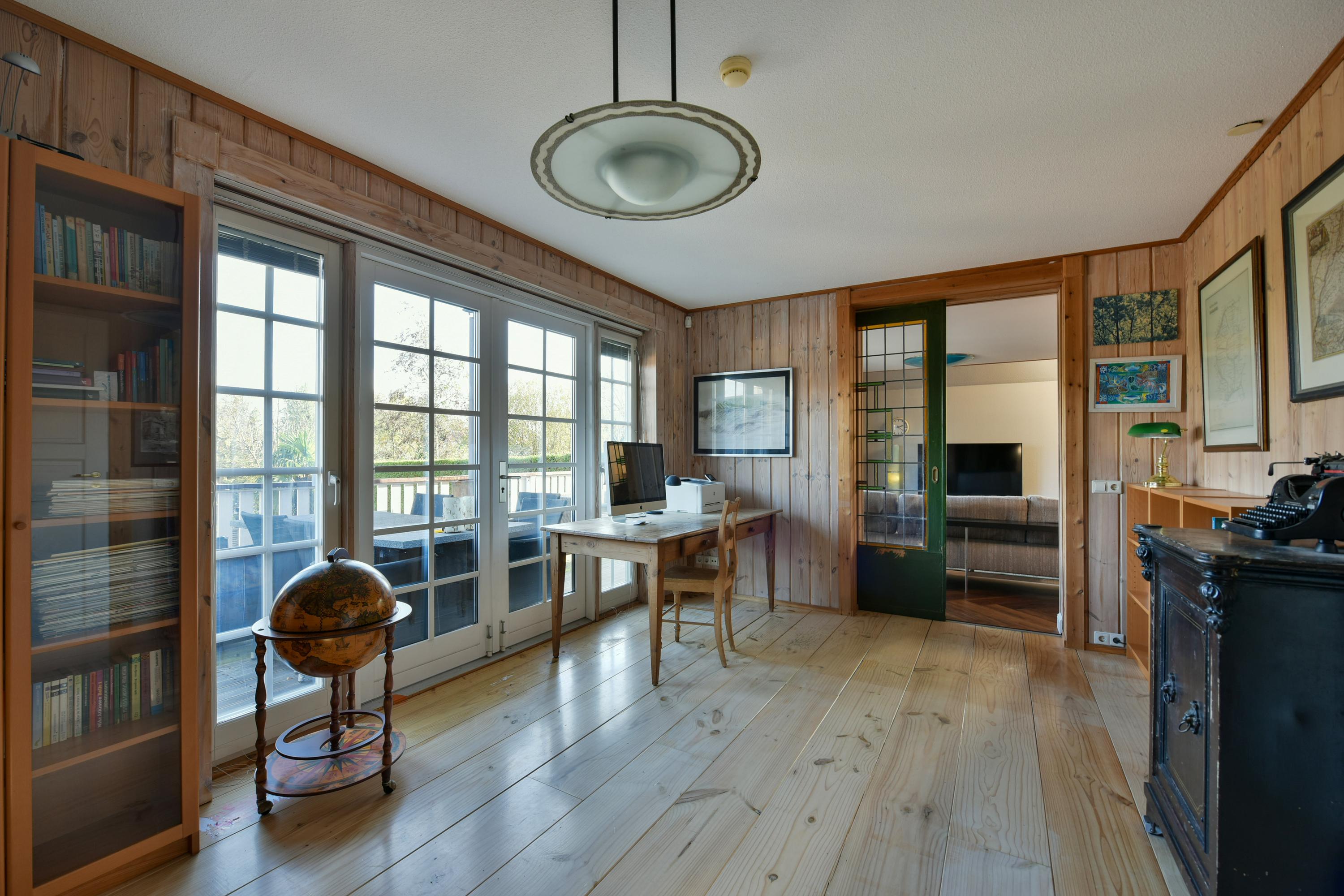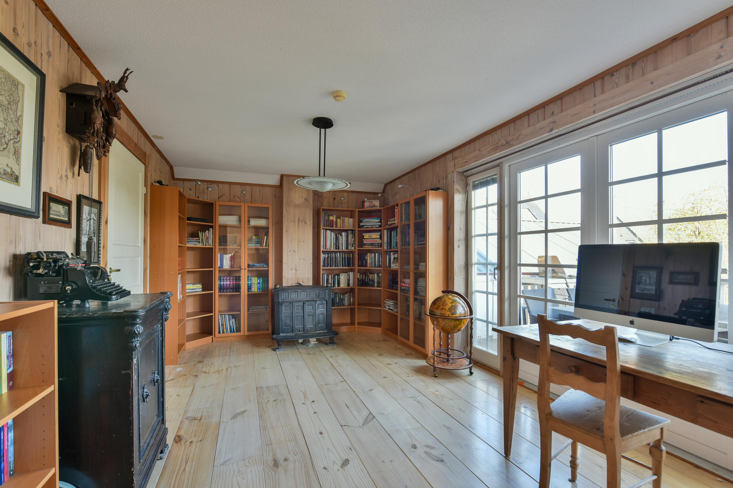 De bibliotheek is natuurlijk voor veel doeleinden inzetbaar, het is een perfecte ruimte voor bijvoorbeeld thuiswerken, een speelkamer voor de kinderen of een TV-kamer en het heeft eveneens openslaande deuren naar de veranda. Extra sfeer wordt gecreëerd door de gezellige houtkachel en de boekenkastenwand.