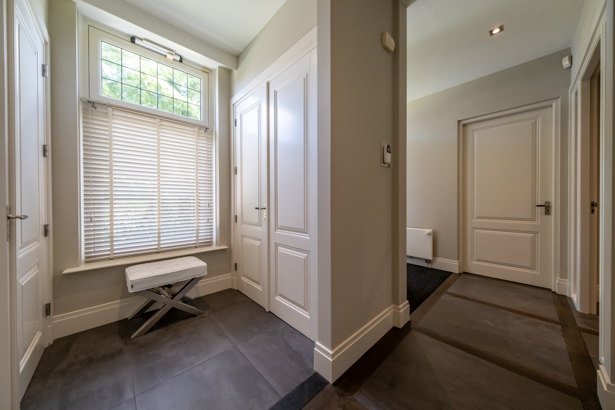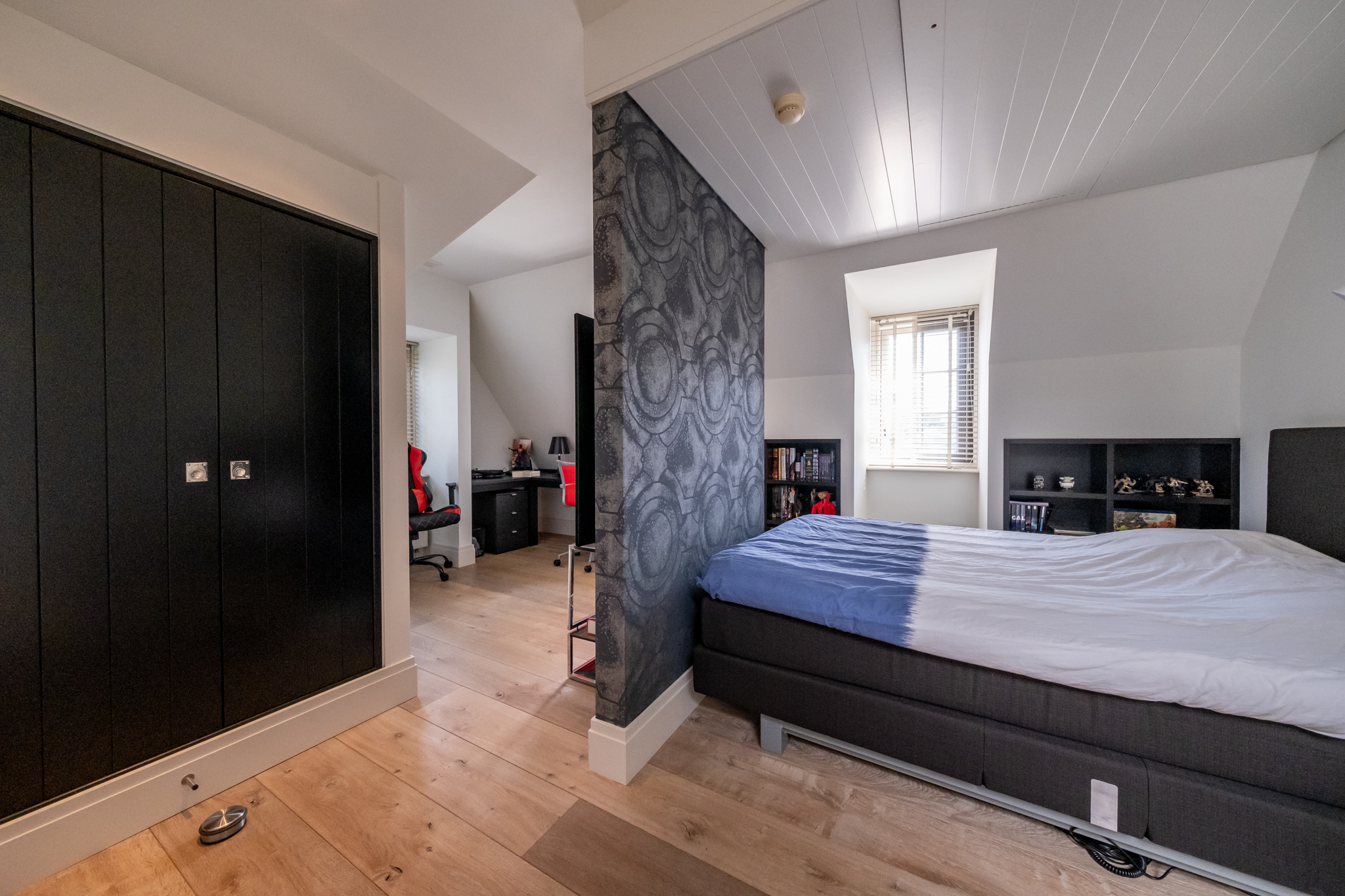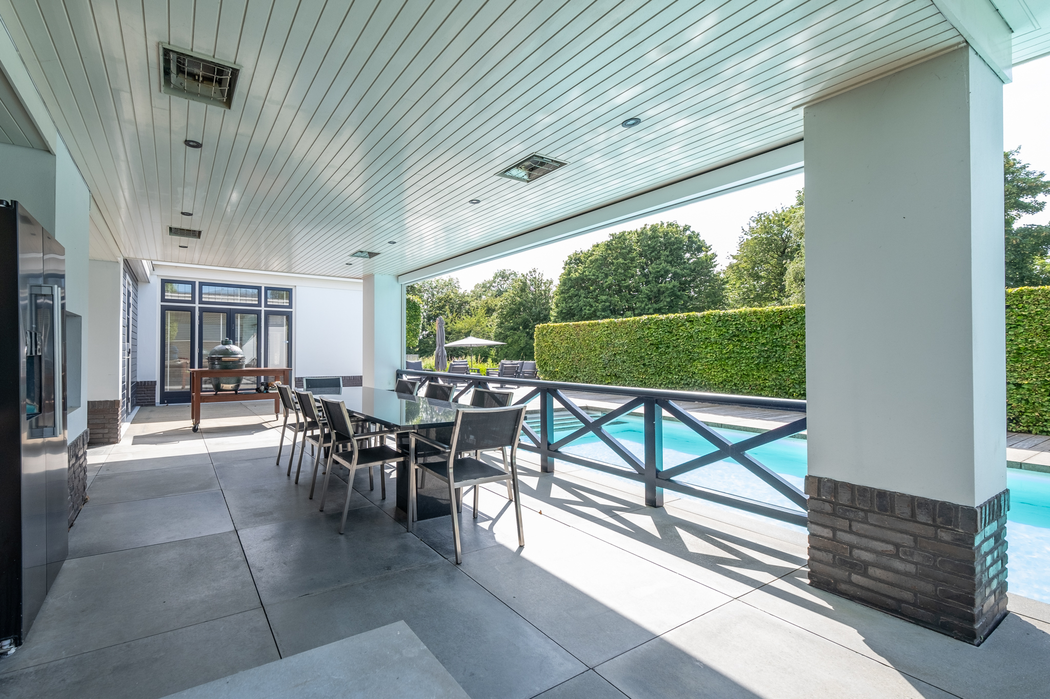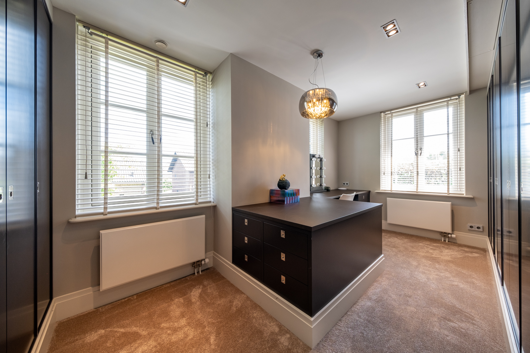 Bij binnenkomst ervaart u direct de allure van dit huis: een royale hal met statige bordestrap, een sfeervolle L-vormige woonkamer met glasstraat in het plafond en een fijne werkhoek. De woonkeuken van Eggersman is een waar pronkstuk: uitgerust met een kookeiland, topapparatuur van Viking en een sfeervolle gashaard. Dankzij de verdiepingshoge stalen pui is de keuken visueel verbonden met de woonkamer, terwijl u toch de luxe van een aparte keukenruimte behoudt. Naast de vele woonvertrekken beschikt de woning over een kelder, dubbele inpandige garage en een multifunctionele vleugel – ideaal als gastenverblijf, werkruimte of au-pair appartement.