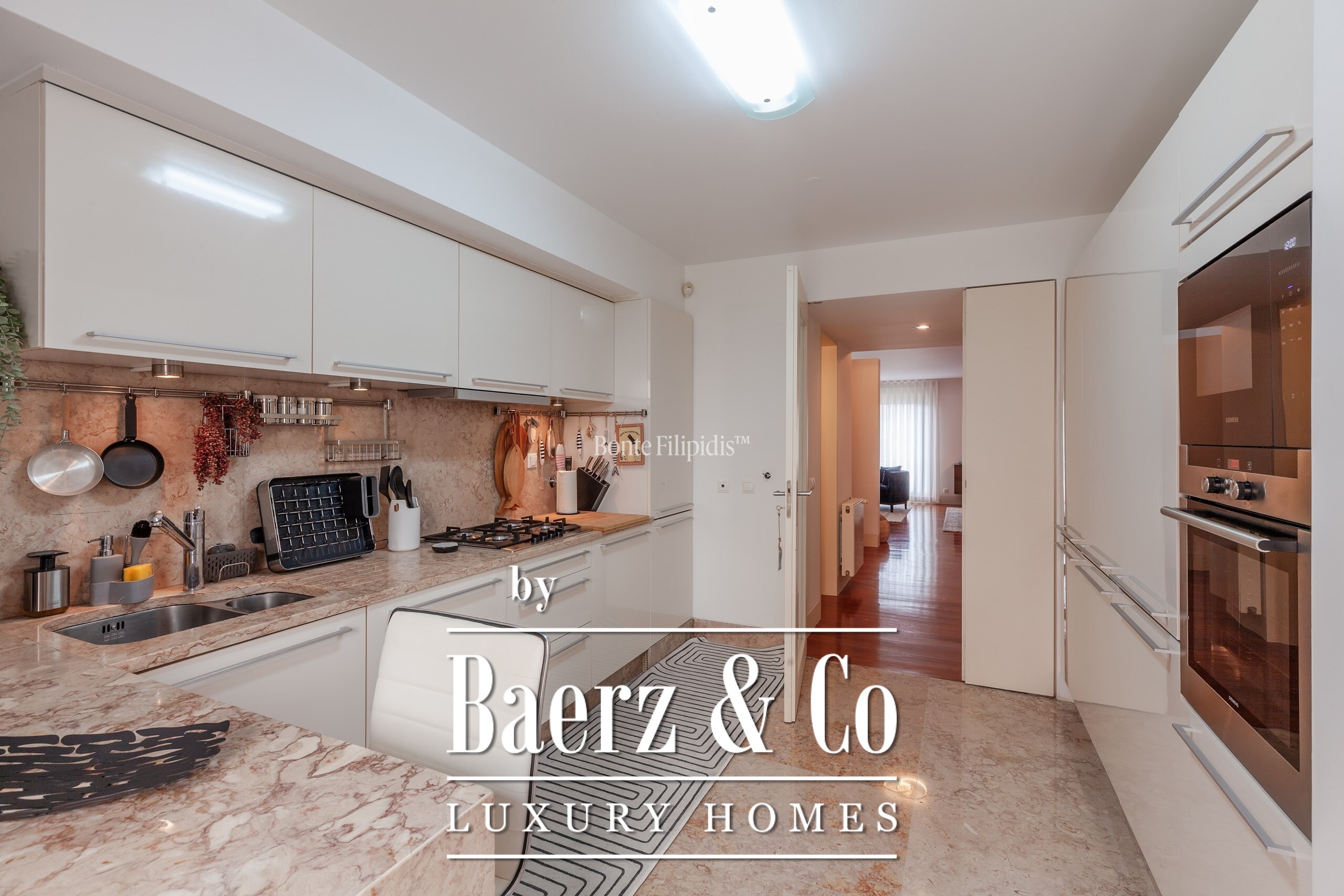 De keuken, badend in het zuidwestelijke licht, is uitgerust met SMEG- en Siemens-apparatuur, Lioz kalksteen en volop bergruimte, voor dagelijks gemak en gastvrijheid bij uitstek. Afzelia houten vloeren, eigentijdse badkamers en centrale verwarming onderstrepen de ingetogen klasse van deze woning. Het appartement wordt grotendeels gemeubileerd aangeboden en ondersteunt daarmee een zorgeloze verhuizing.