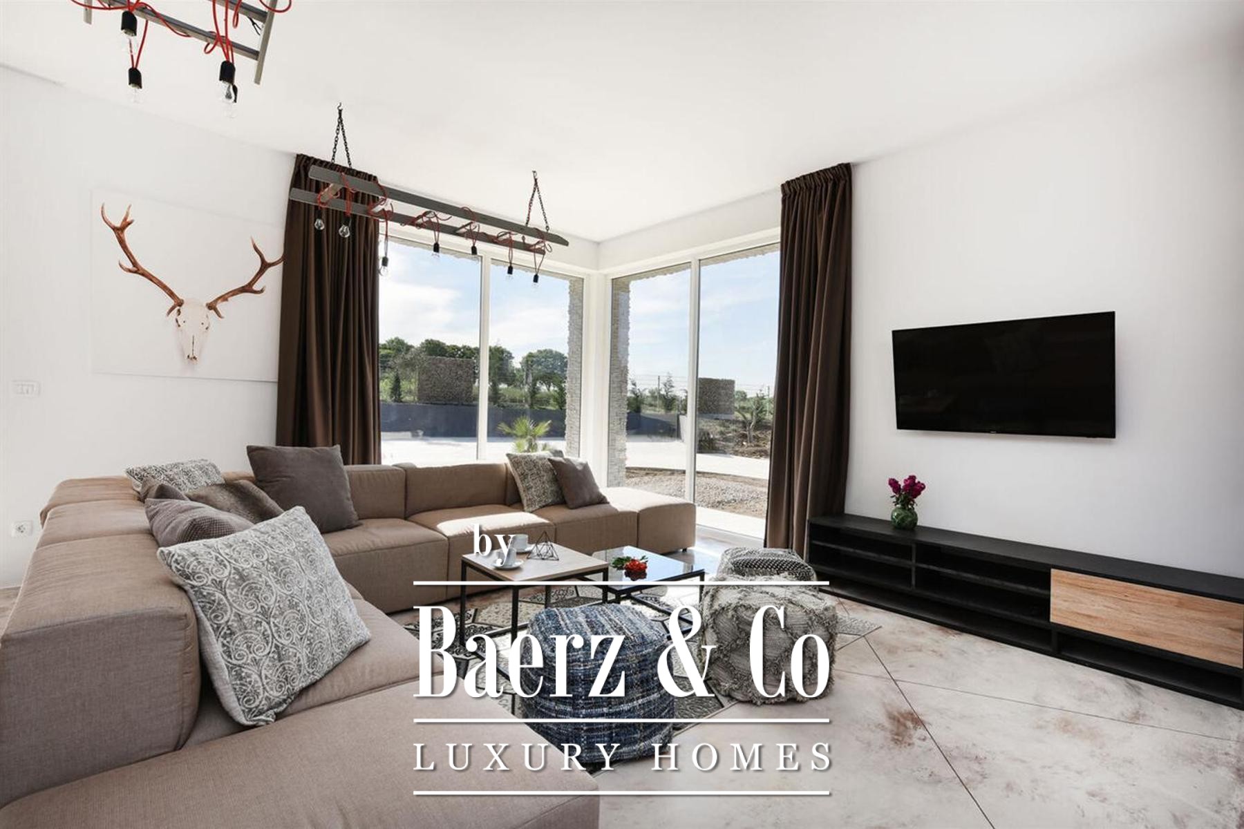 Buiten vormt een verwarmd zwembad van 14 bij 5 meter het middelpunt, omringd door fraai aangelegde zones voor ontspanning en recreatie. Het verlichte landschap integreert ligbedden, een lounge, schommels en een barbecue, waardoor dag en avond naadloos in elkaar overlopen.