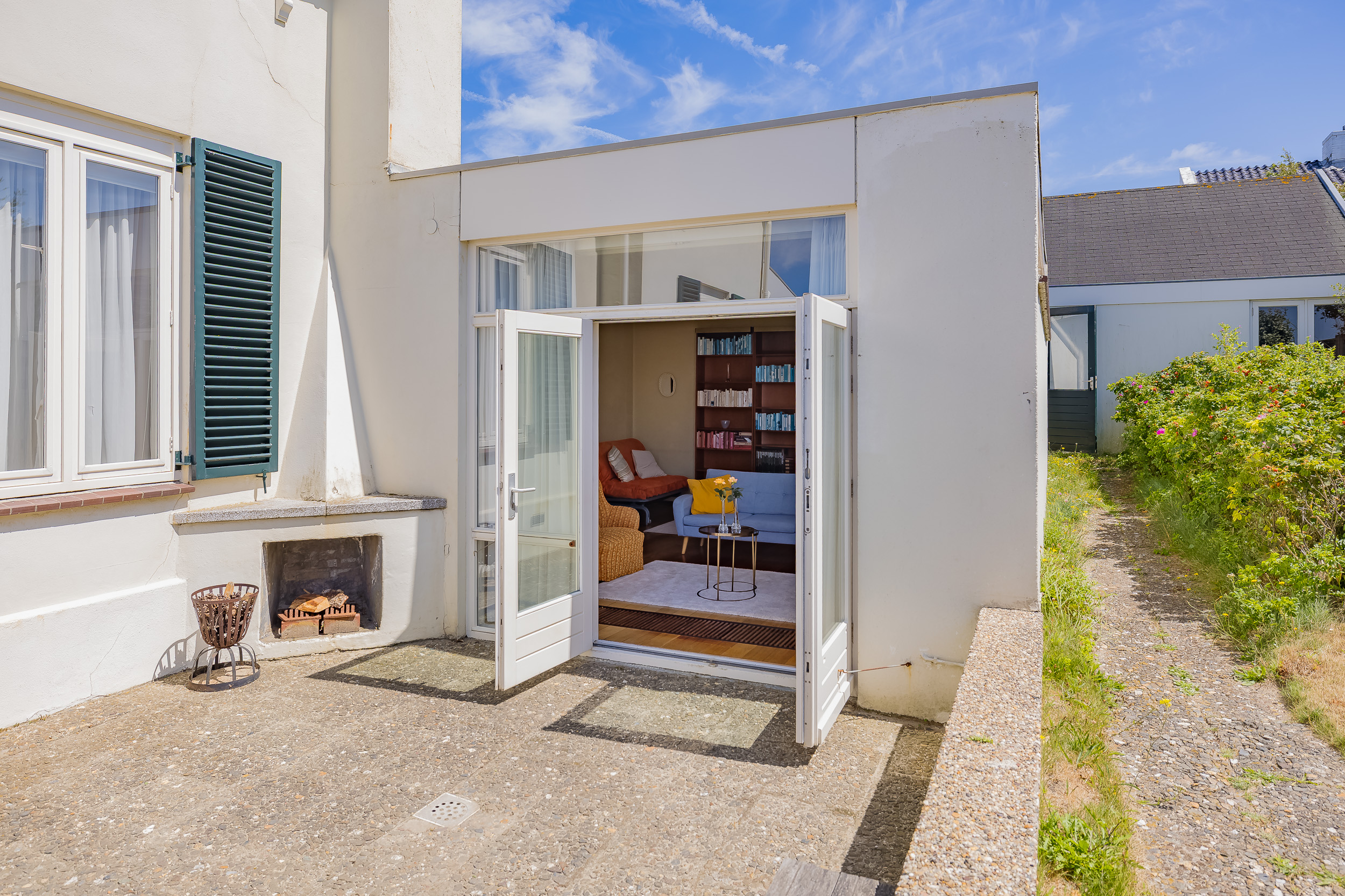 De keuken, voorzien van inbouwapparatuur, is praktisch ingericht met veel kastruimte. Verder vind je op de begane grond een lichte 2e woonkamer met een gashaard, ideaal voor ontspanning of als ruime werkkamer. Daarnaast beschikt de begane grond over een comfortabele slaapkamer met inbouwkast. Het ruime zonnige terras op het zuiden is bereikbaar via de beide woonkamers. De badkamer in de hal is ideaal om na een dagje strand het zand direct van je af te spoelen.