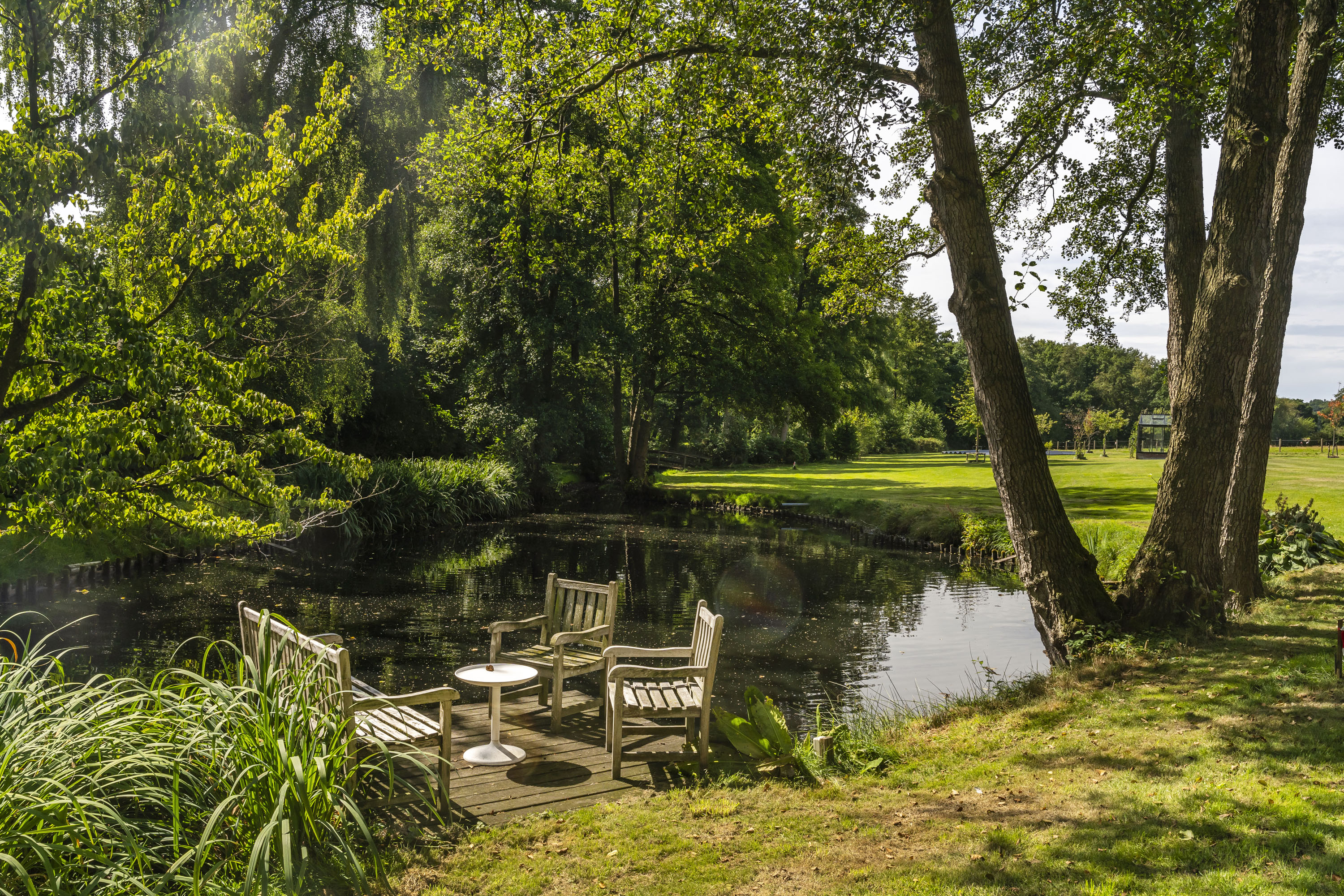 Rondom het landhuis zijn grote gazons aangelegd met verschillende terrassen. Voor de tuinliefhebbers zijn een kas en moestuin op niveau aanwezig. Nagenoeg het gehele terrein kan worden beregend zodat ook in de steeds droger en warmer wordende zomers het hier altijd fraai en lentegroen oogt.