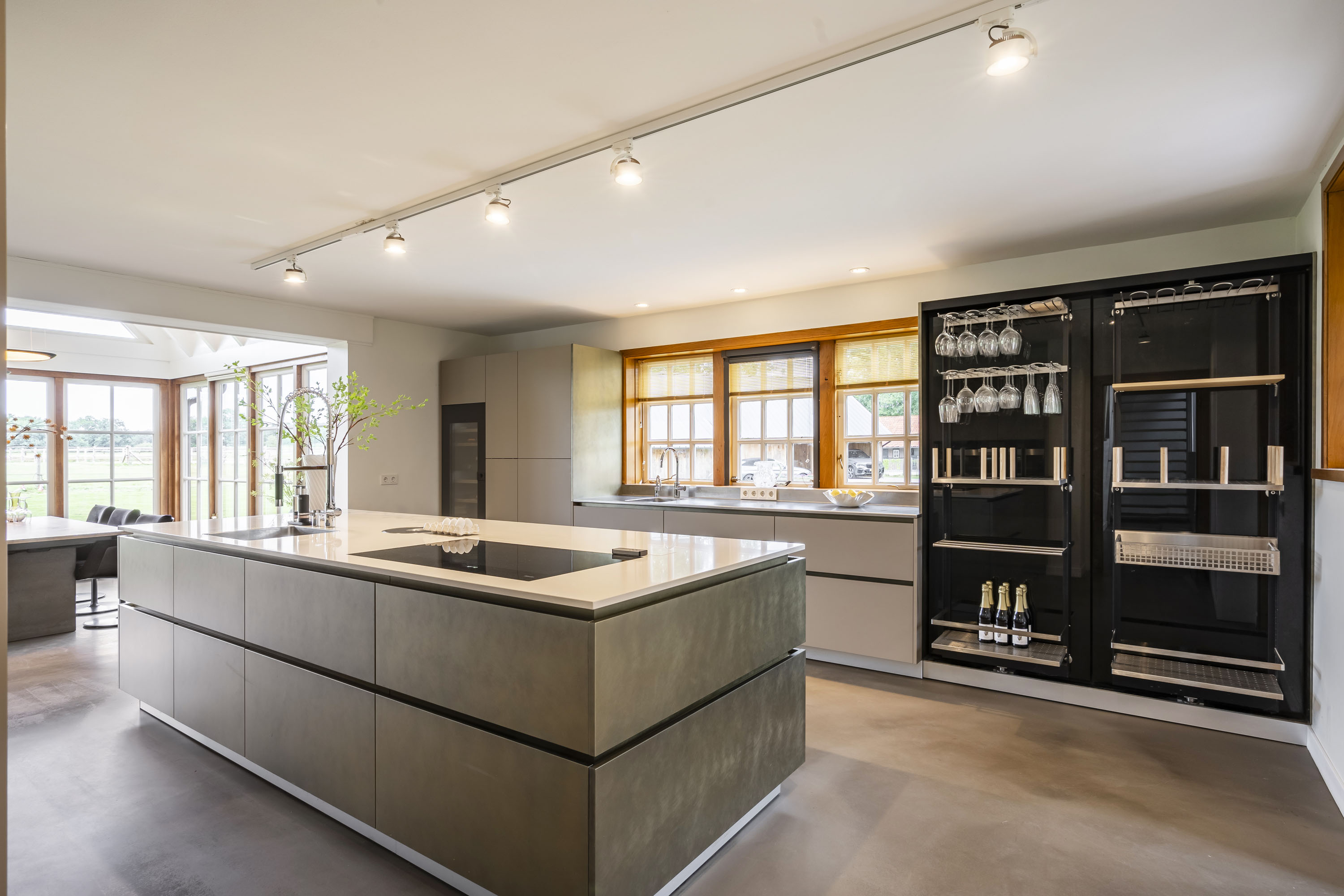 - royale leefkeuken met o.a. modern kookeiland en inbouwkeuken voorzien van composiet en RVS werkblad en luxe inbouwapparatuur waaronder oven, stoomoven, magnetron, koelkast, vriezer, vaatwasser, Quooker, en wijnkast. Volop ruimte om samen met familie of vrienden gezellig te dineren.