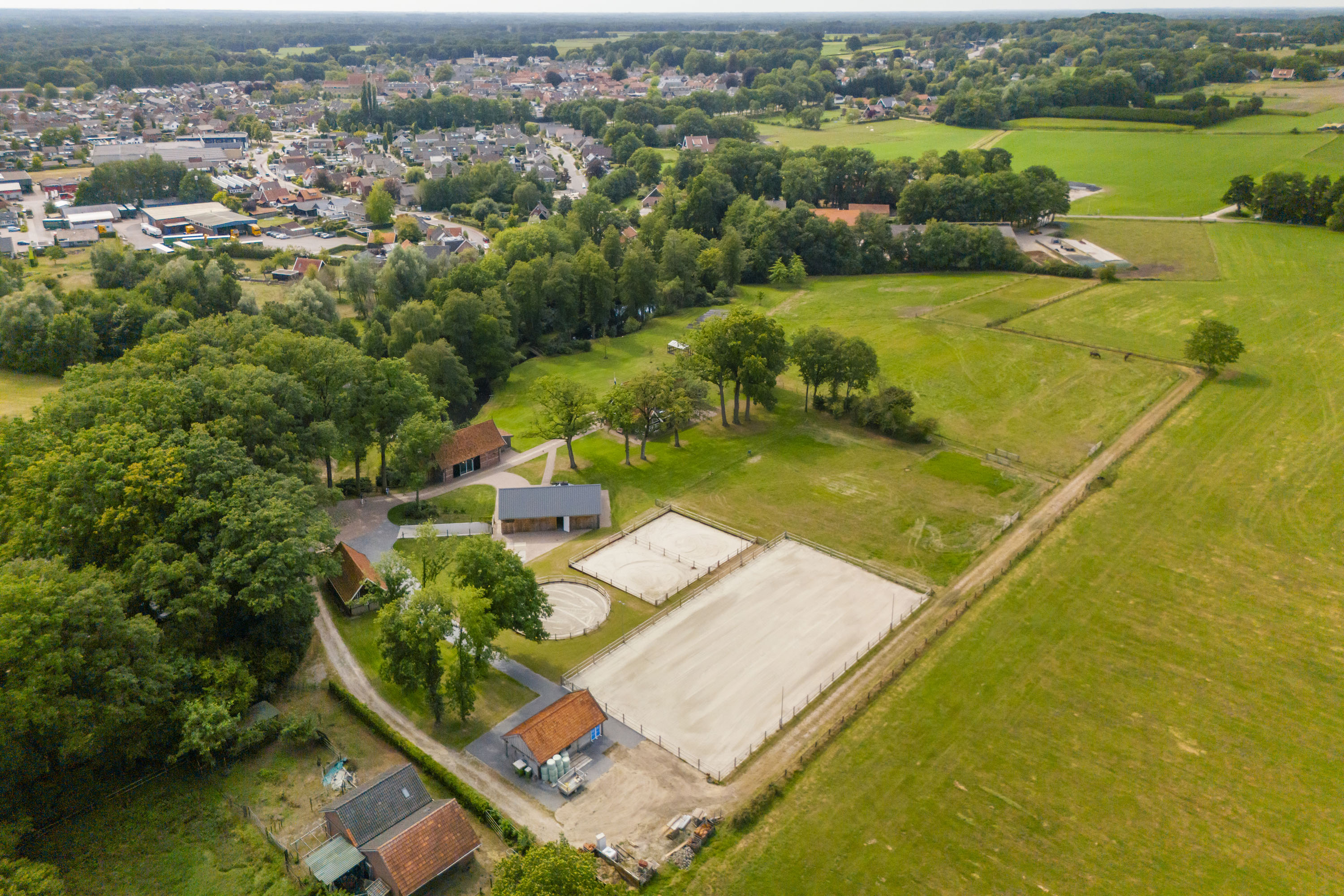 Het erf is een lust voor het oog. Sluit u de poort achter u en vervolgt u de weg over de rustieke erfverharding dan ervaart u direct de intimiteit van dit bijzondere domein. Aan de ene zijde omgeven door volwassen bomen en een indrukwekkende overloopvijver, die op natuurlijke wijze in verbinding staat met de Moerbekkebeek en dus nooit droog valt. Met aan de waterkant een fijn terrasje: een idyllische plek om in alle privacy te genieten van het uitzicht en het spel van het licht op het water. Aan de andere zijde kunt u genieten van de glooiende weiden en akkers afgewisseld met houtwallen en bosschages.