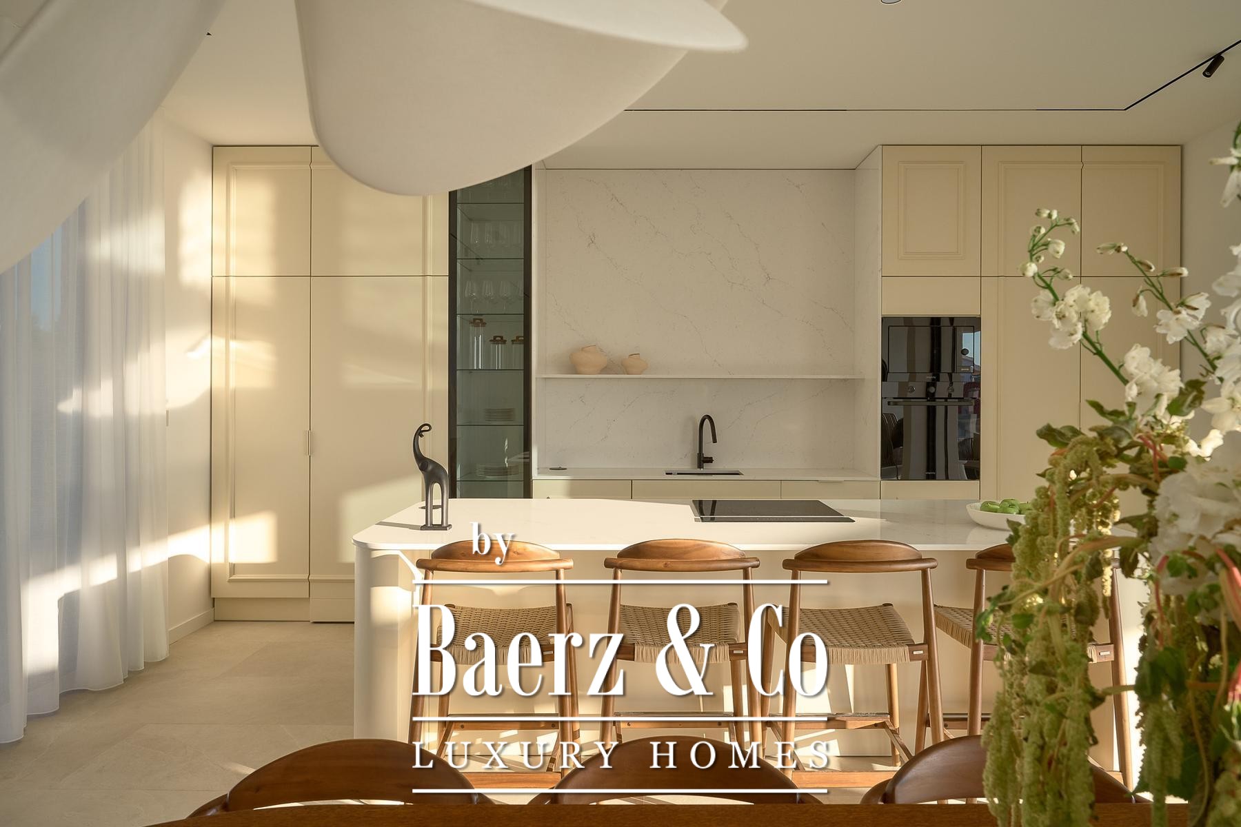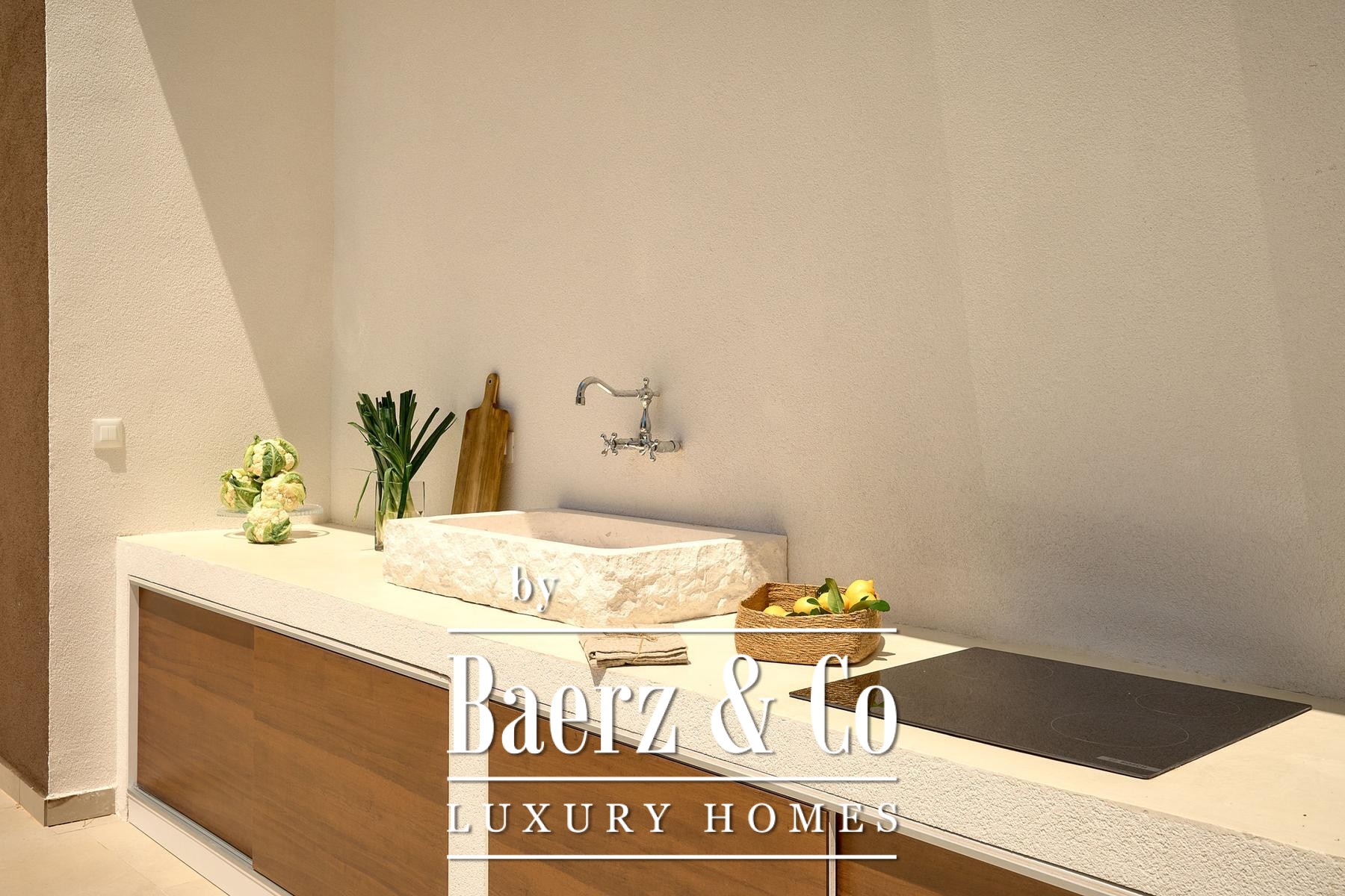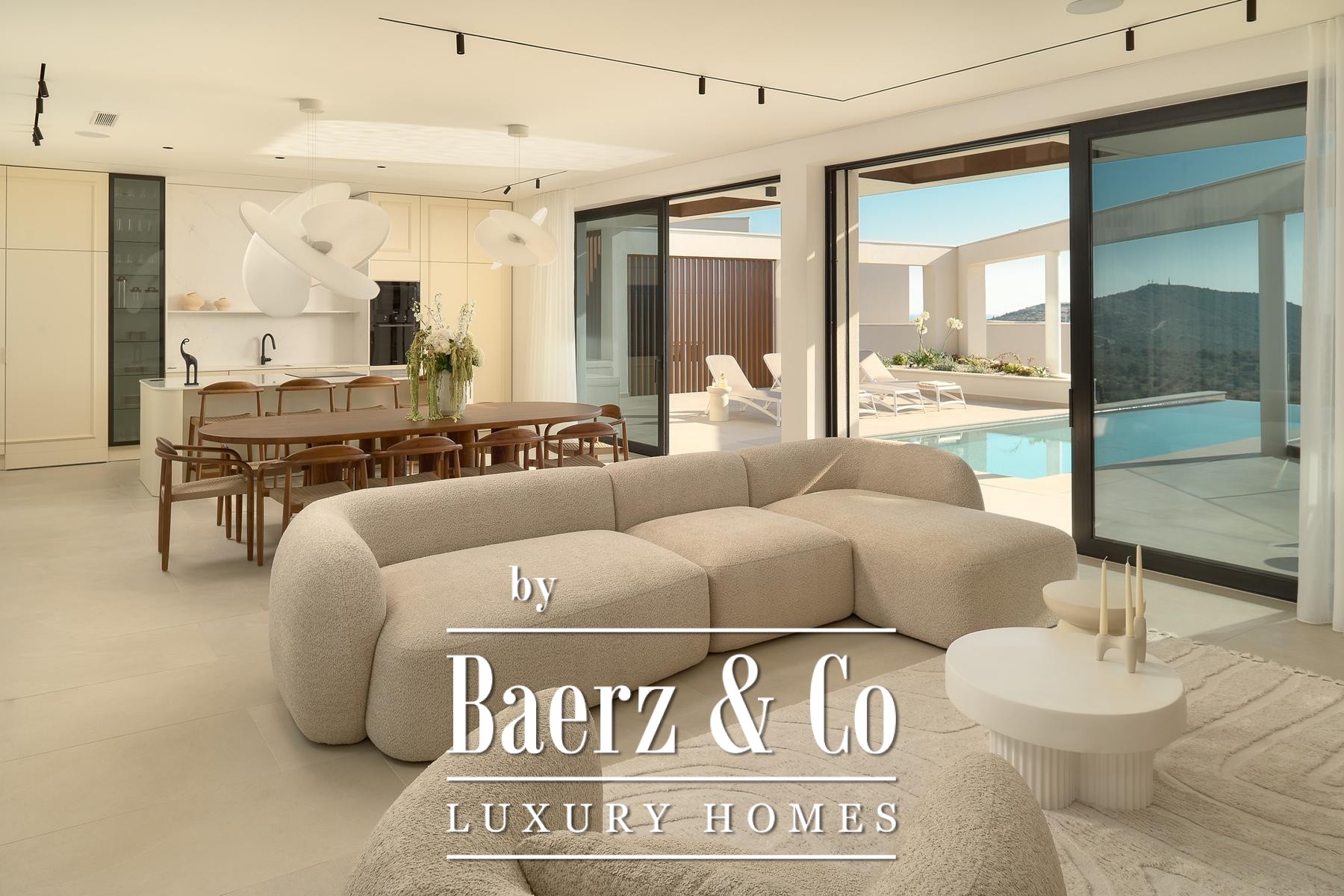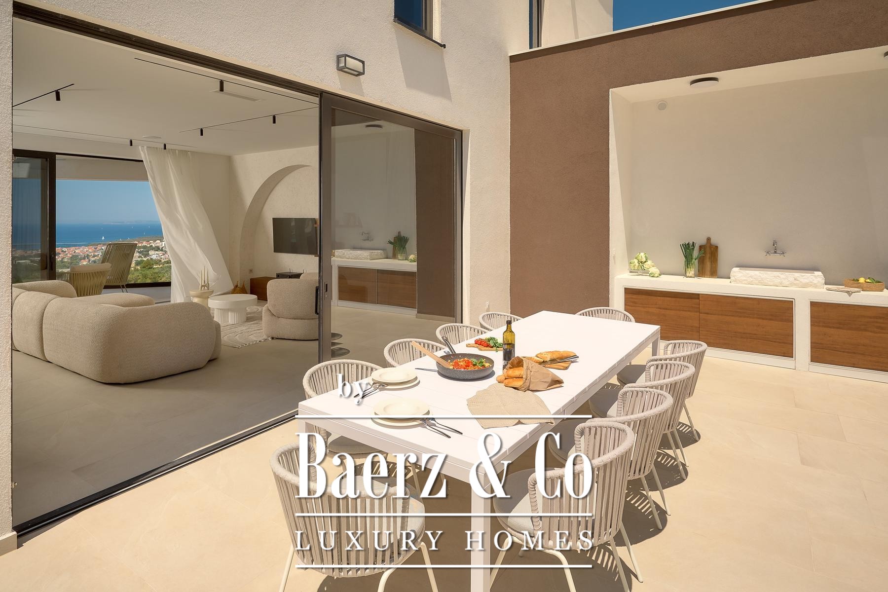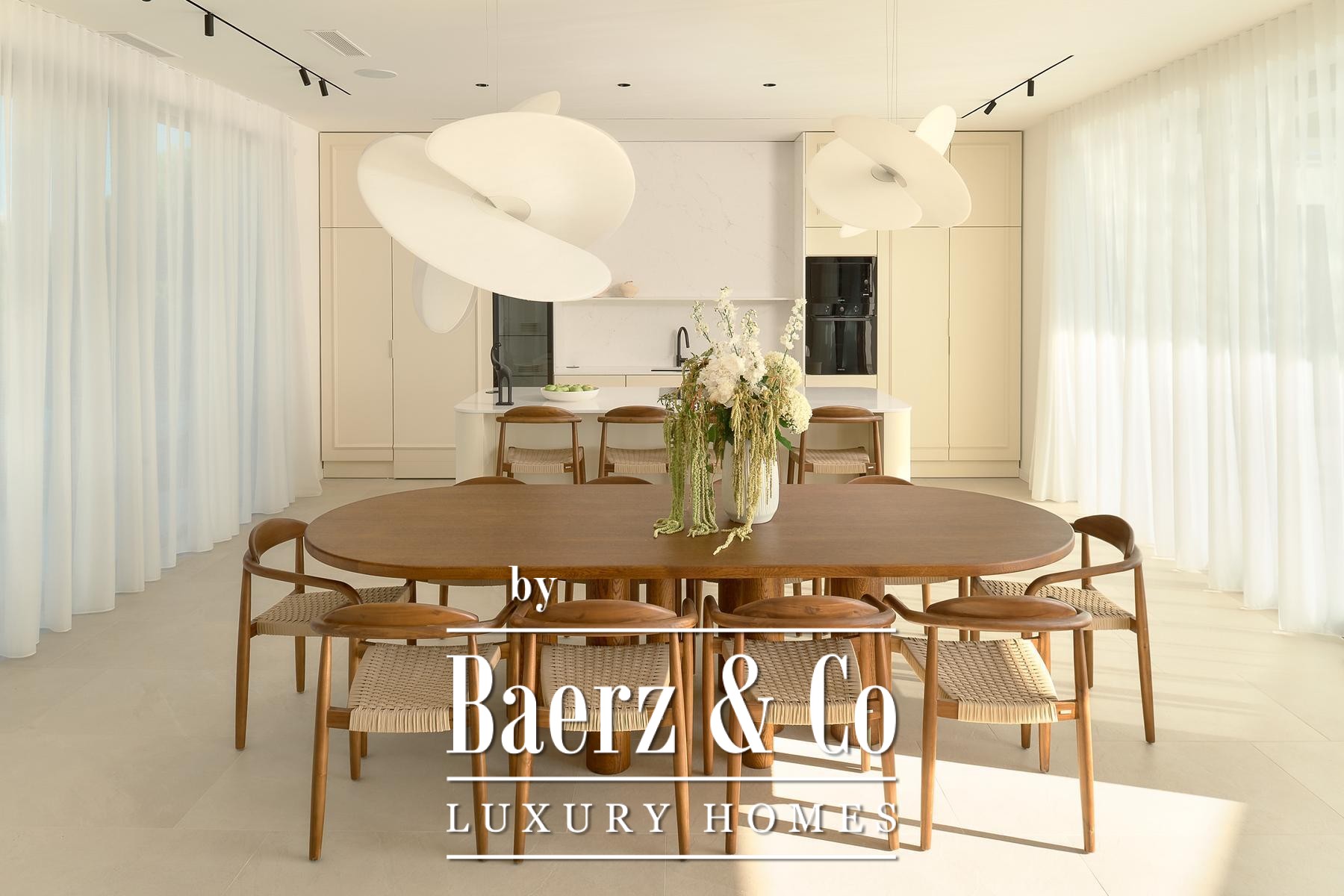 De begane grond verwelkomt u in een lichte, open woonkamer en eetruimte, naadloos verbonden met een moderne keuken, verrijkt met kamerhoge glazen wanden die zorgen voor veel daglicht en een soepele overgang tussen binnen en buiten. De ruime terrassen bieden zones voor ontspanning en gastvrijheid, waaronder een buitenkeuken en barbecue naast het infinity zwembad en een zonneterras.
