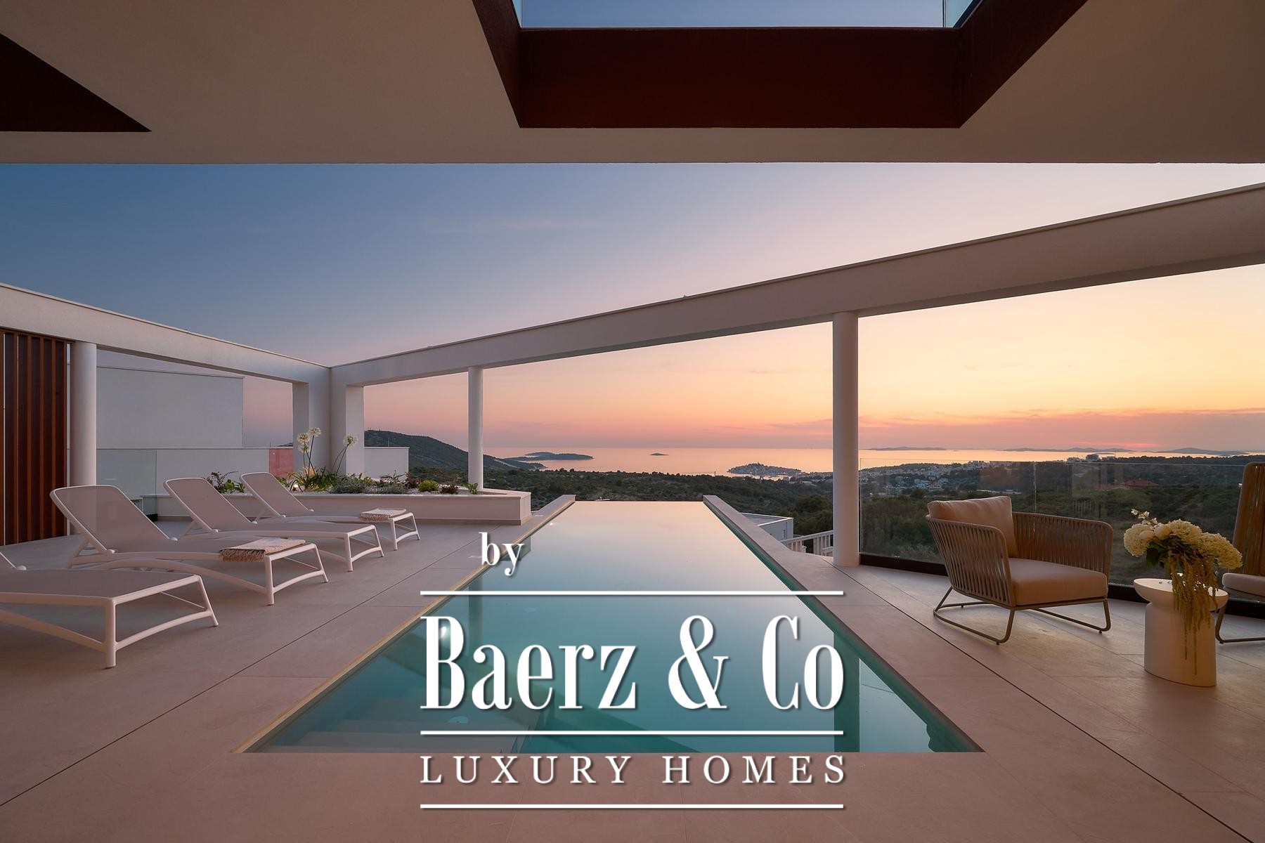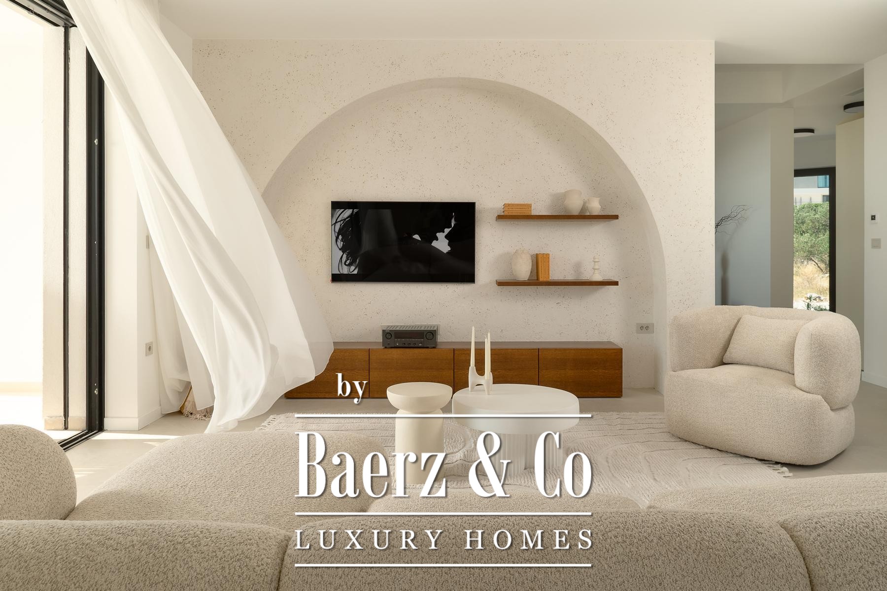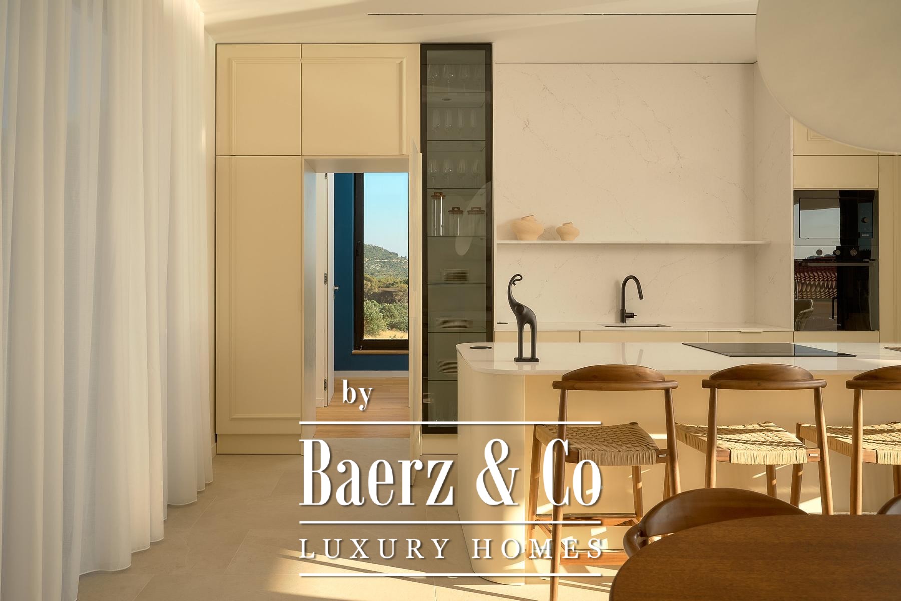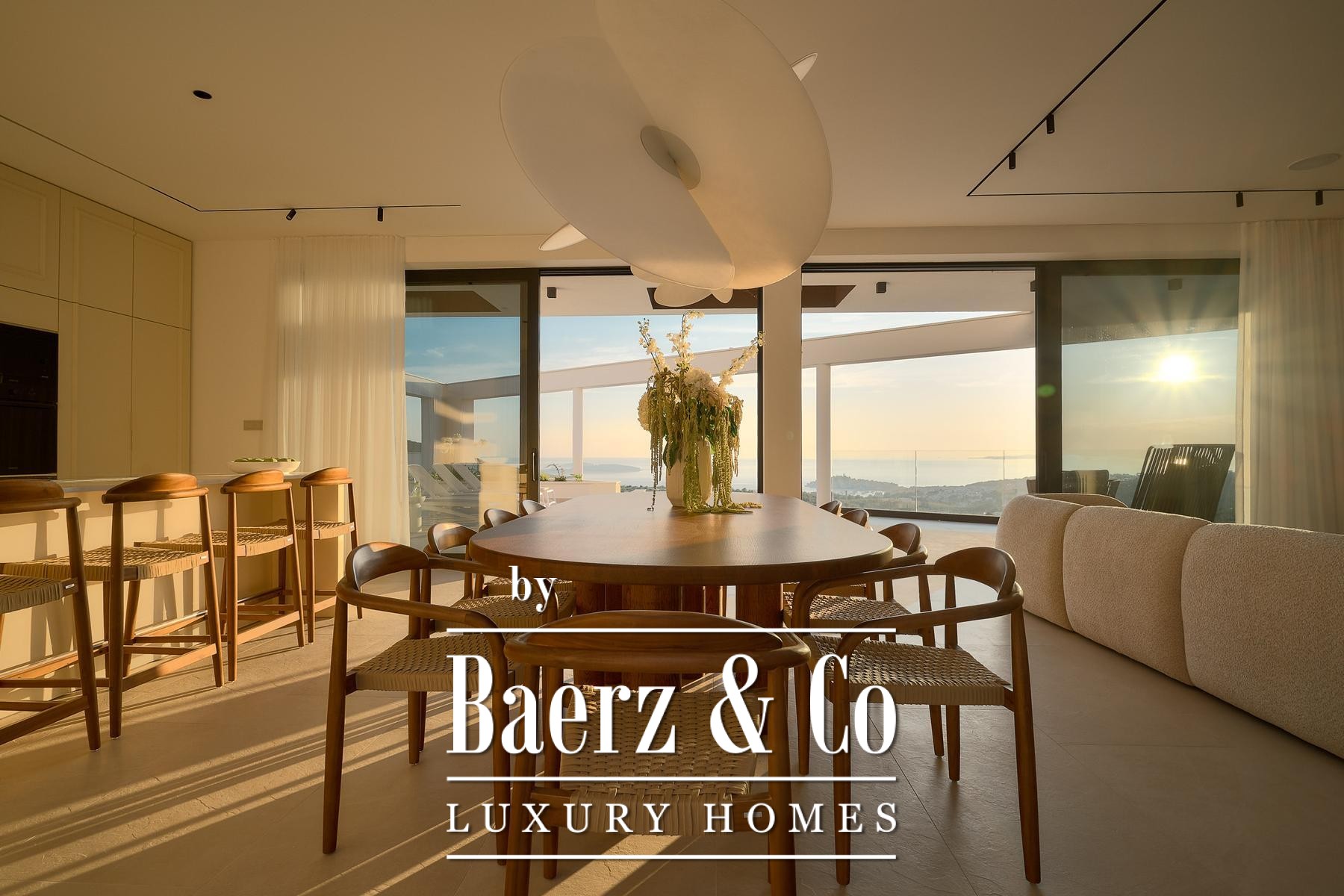 De begane grond verwelkomt u in een lichte, open woonkamer en eetruimte, naadloos verbonden met een moderne keuken, verrijkt met kamerhoge glazen wanden die zorgen voor veel daglicht en een soepele overgang tussen binnen en buiten. De ruime terrassen bieden zones voor ontspanning en gastvrijheid, waaronder een buitenkeuken en barbecue naast het infinity zwembad en een zonneterras.