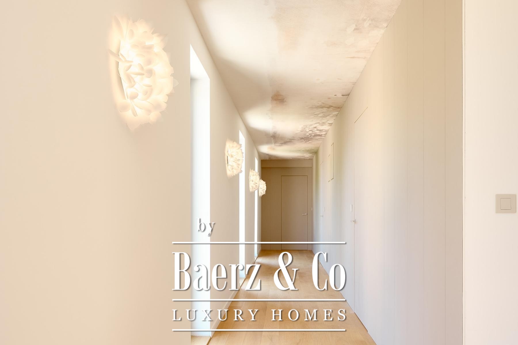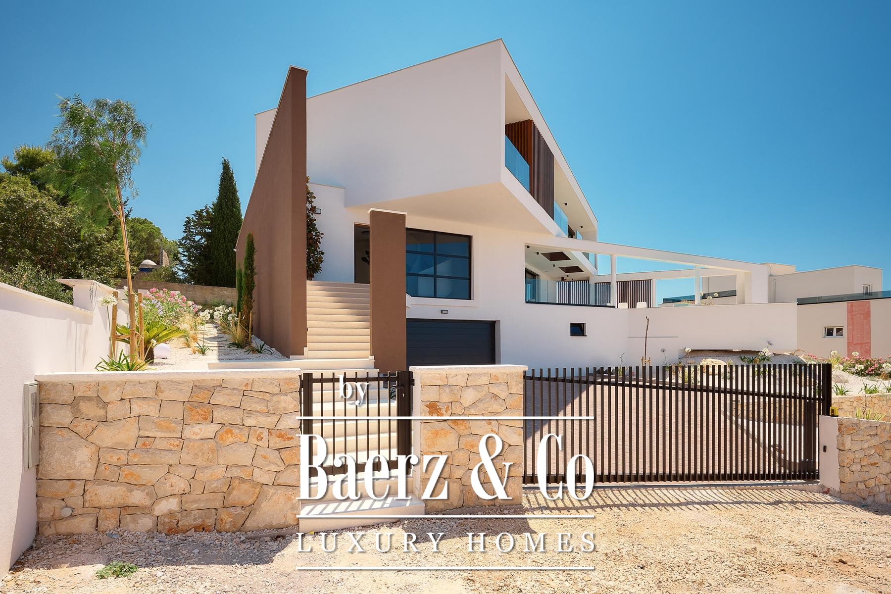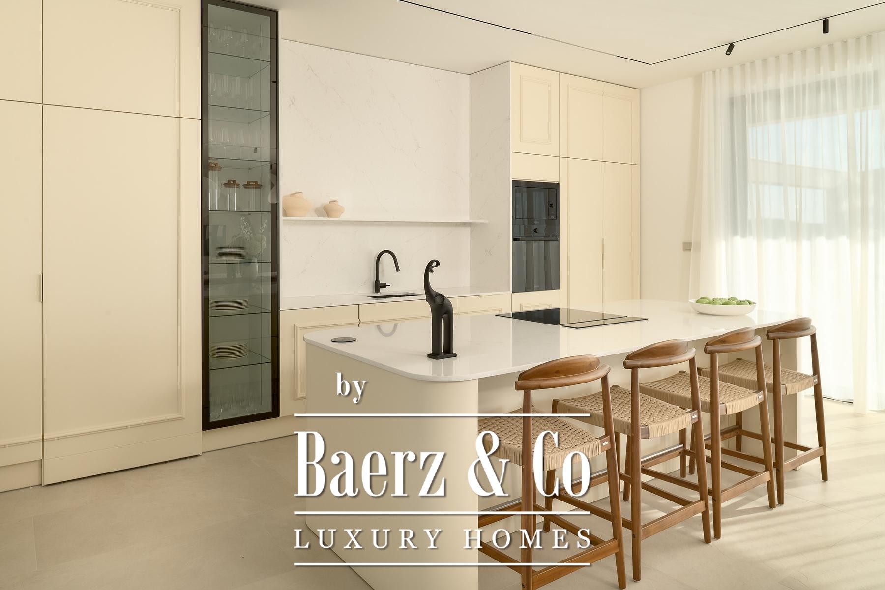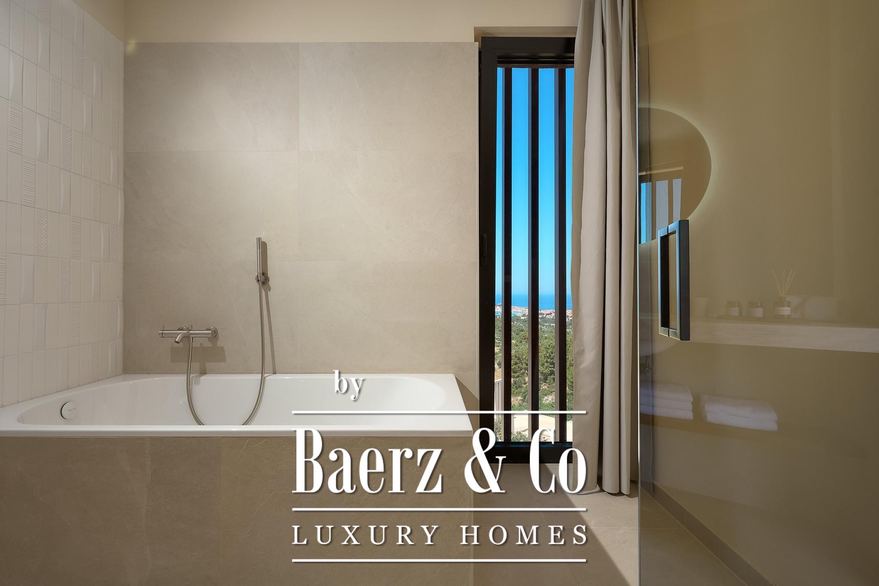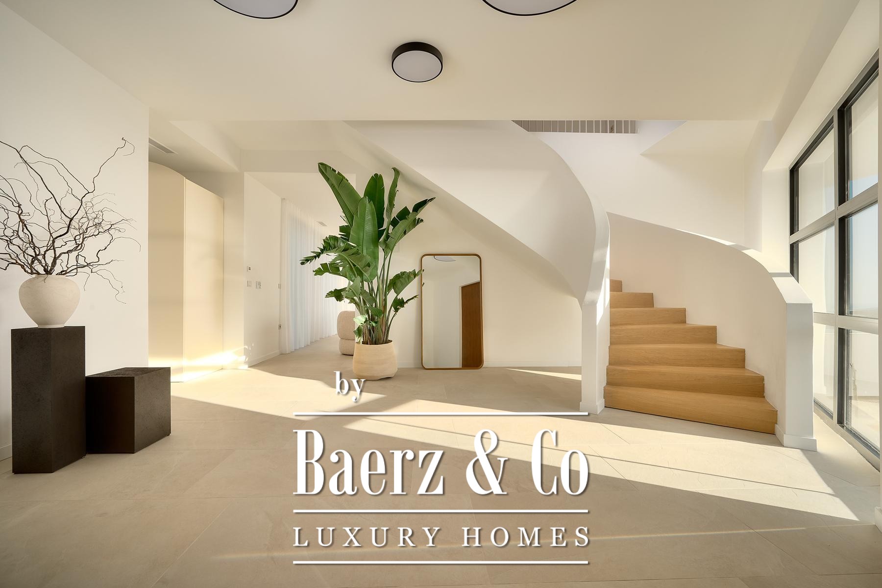 De begane grond verwelkomt u in een lichte, open woonkamer en eetruimte, naadloos verbonden met een moderne keuken, verrijkt met kamerhoge glazen wanden die zorgen voor veel daglicht en een soepele overgang tussen binnen en buiten. De ruime terrassen bieden zones voor ontspanning en gastvrijheid, waaronder een buitenkeuken en barbecue naast het infinity zwembad en een zonneterras.