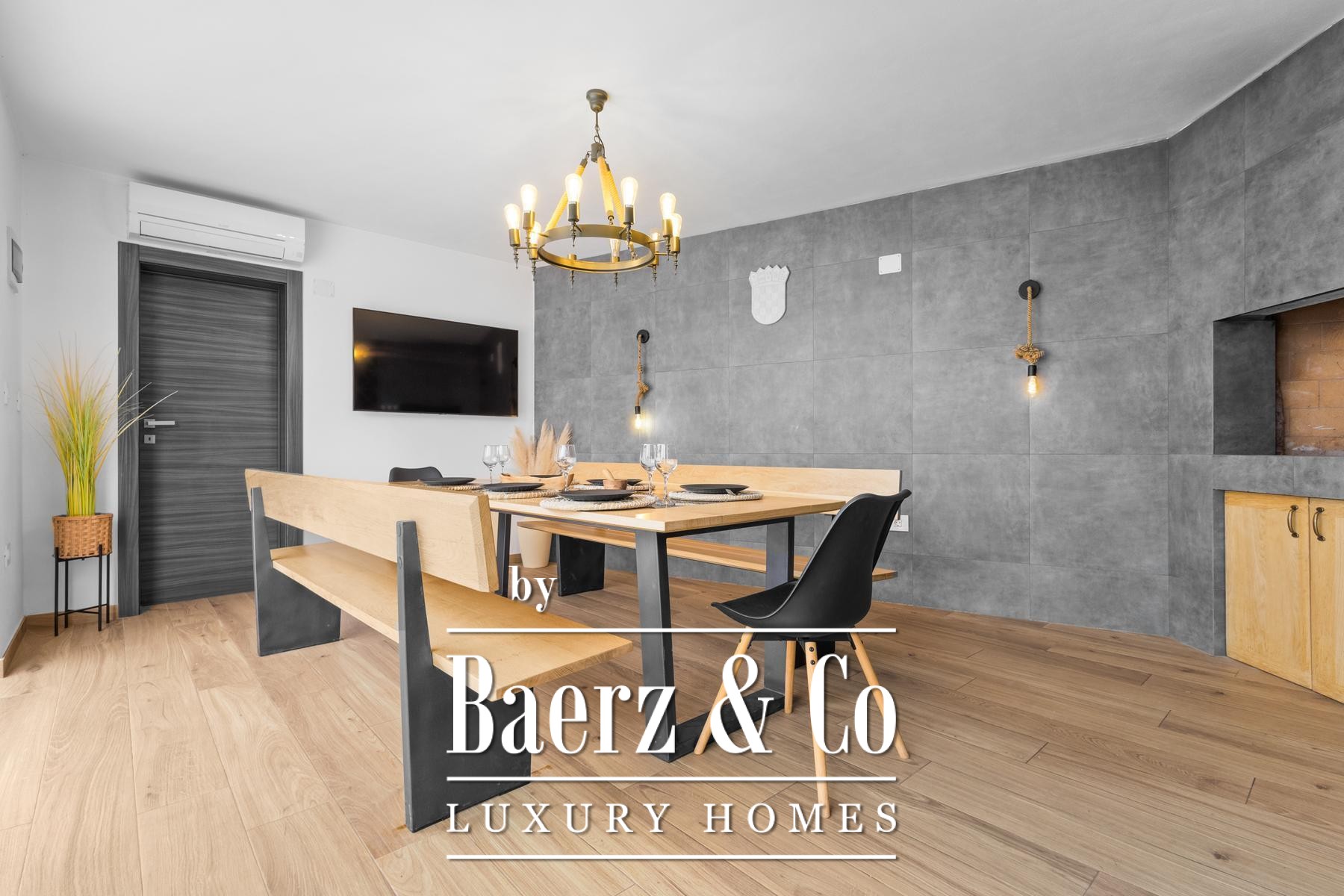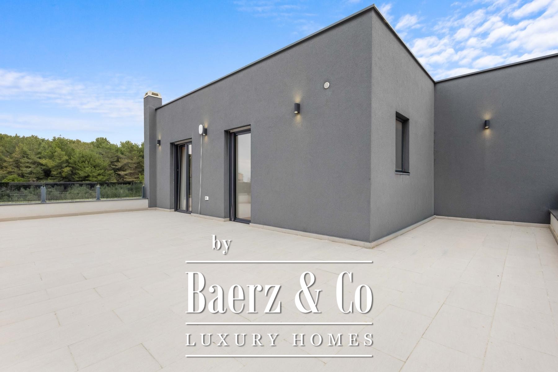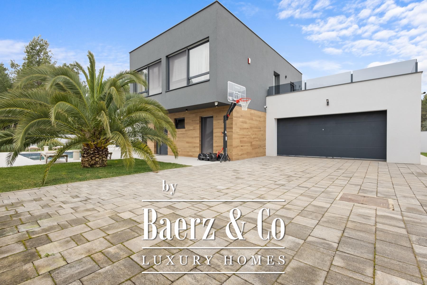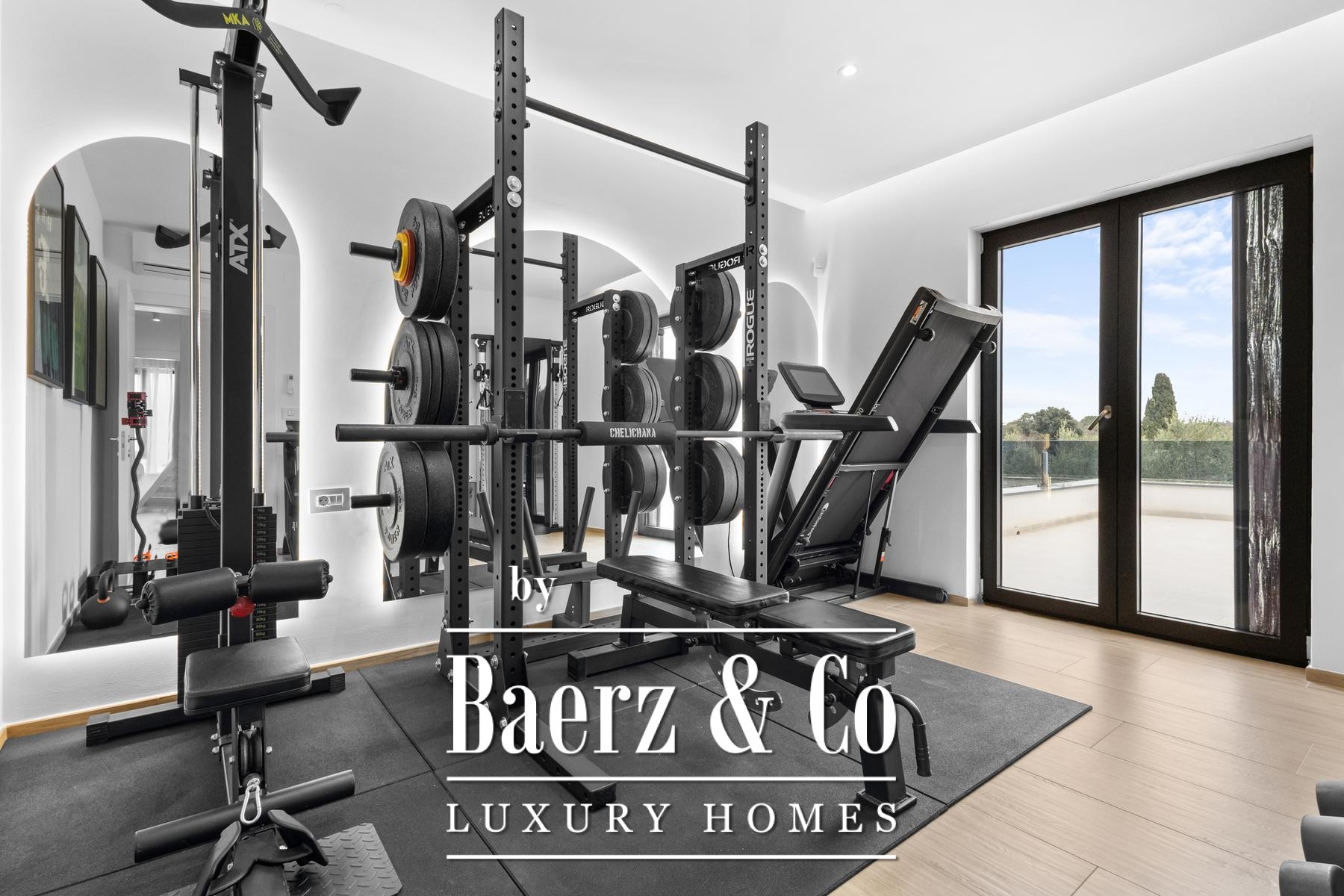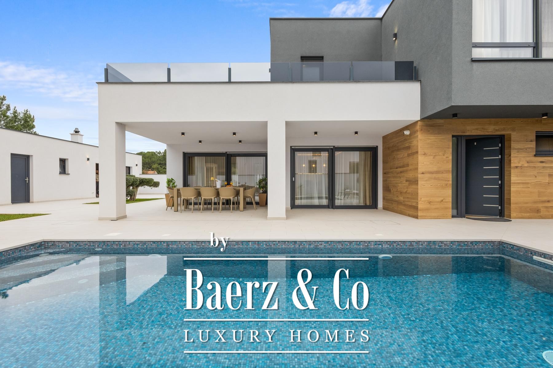 Buiten wacht een verwarmd zwembad van 32 m² met zoutwatersysteem, een fraai aangelegd zonneterras en een taverne van 25 m² met open haard; een privé domein voor rust of ingetogen samenzijn. Extra comfort wordt geboden door een garage van 35 m², drie extra parkeerplaatsen, videobewaking en alarmsysteem. Technische verfijning blijkt uit vloerverwarming, volledige airconditioning en maatwerk meubilair. Deze luxe villa te koop in Pula verenigt hedendaags design en werkelijk comfort in een serene setting.