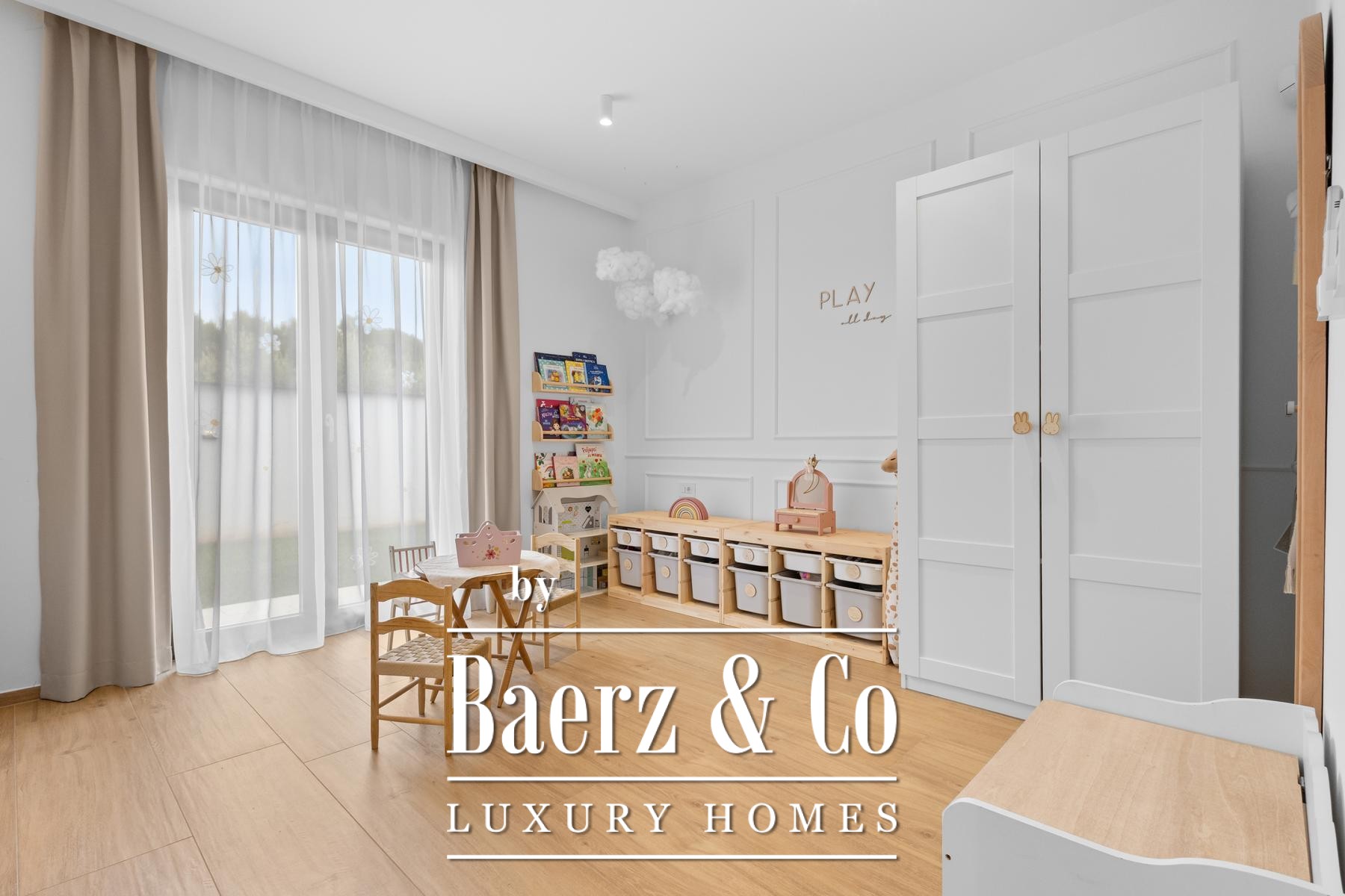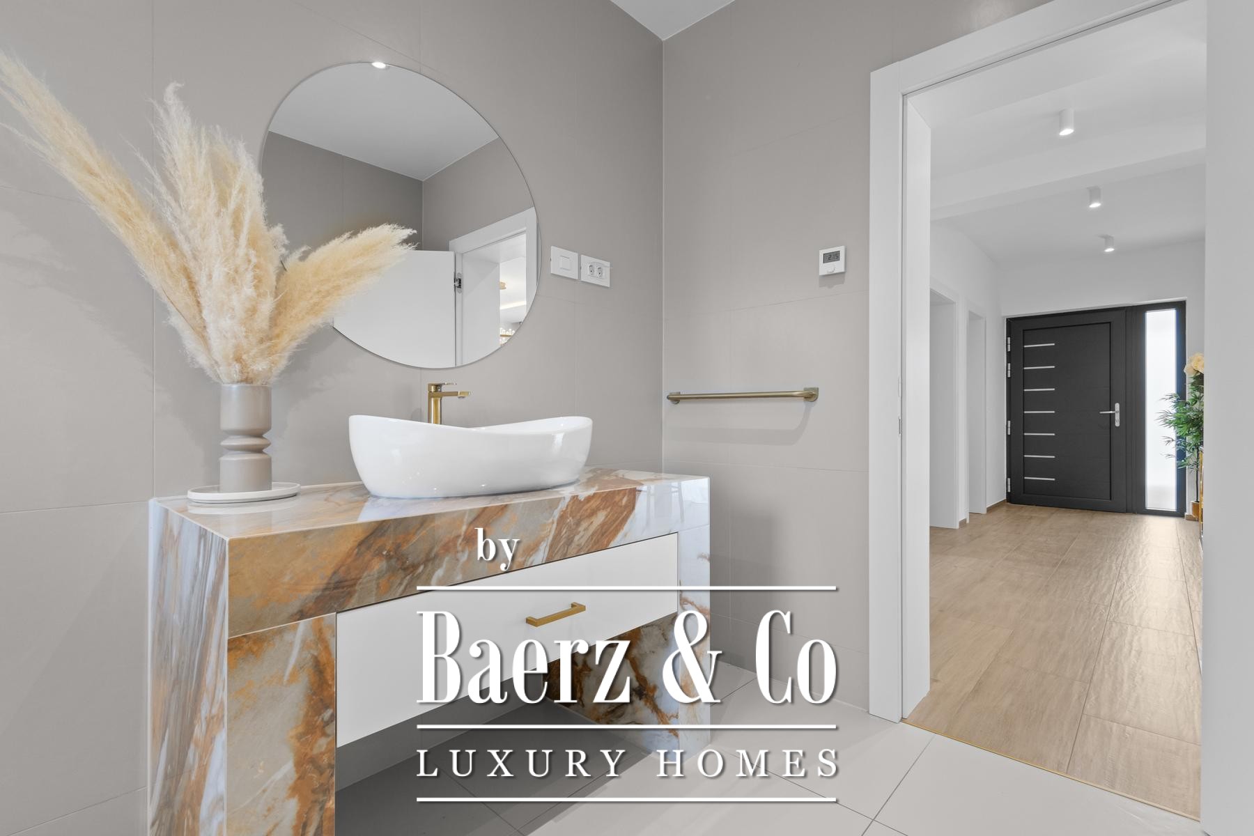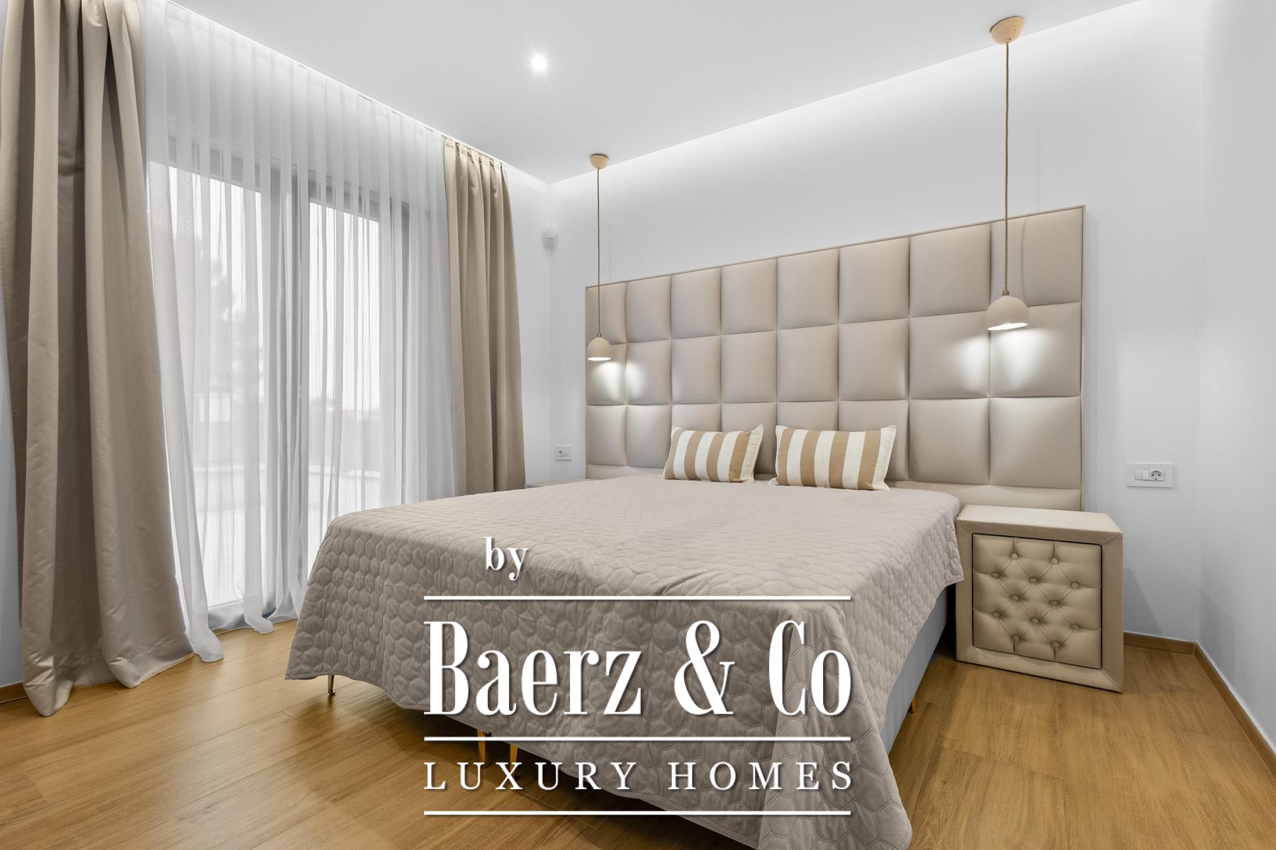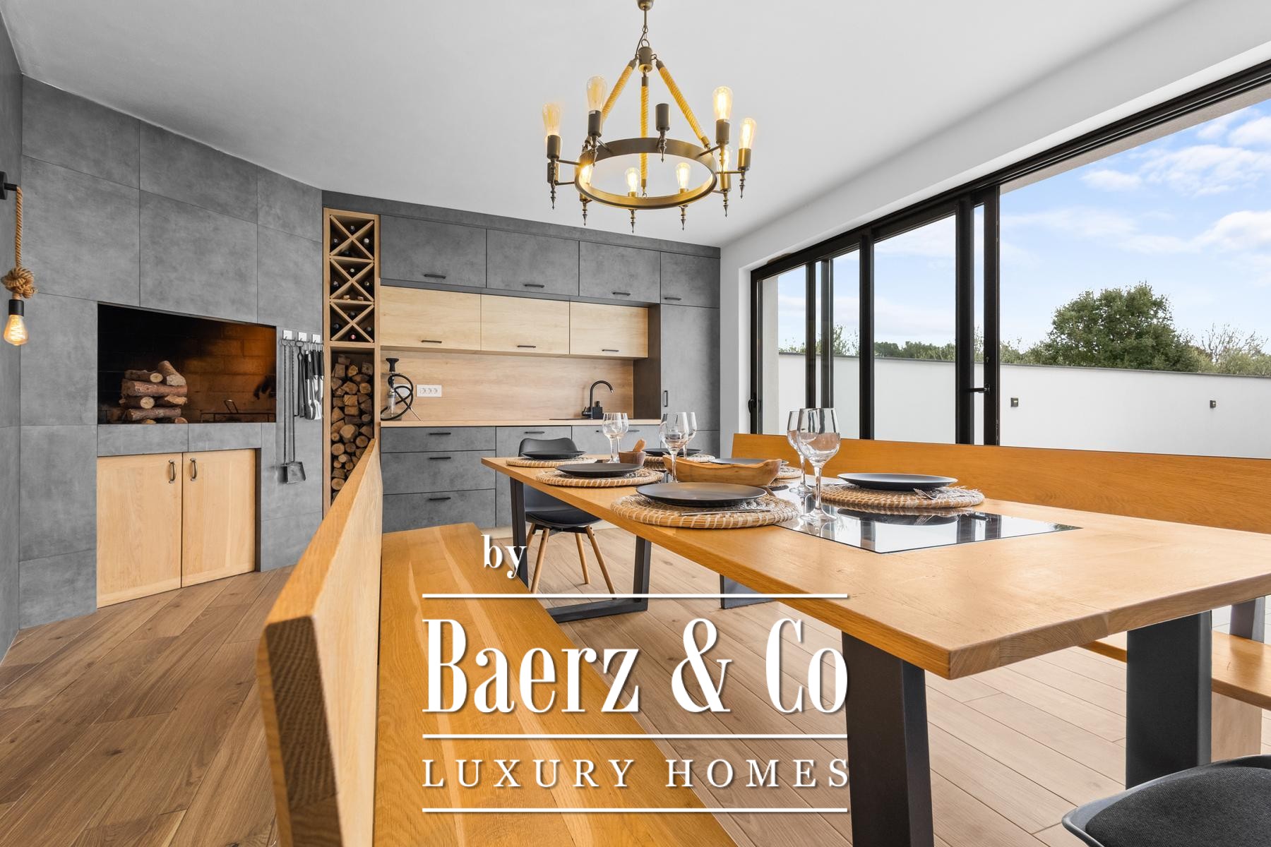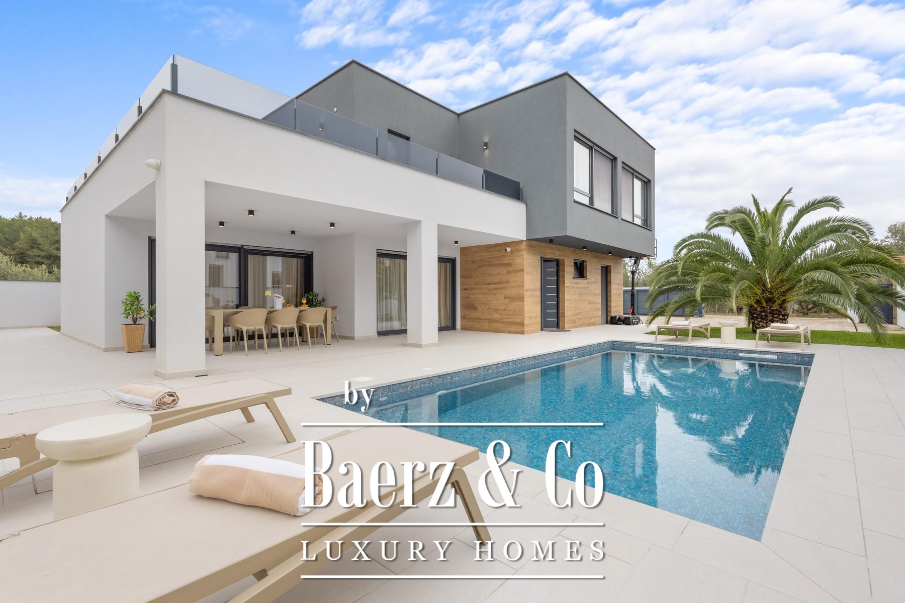 Buiten wacht een verwarmd zwembad van 32 m² met zoutwatersysteem, een fraai aangelegd zonneterras en een taverne van 25 m² met open haard; een privé domein voor rust of ingetogen samenzijn. Extra comfort wordt geboden door een garage van 35 m², drie extra parkeerplaatsen, videobewaking en alarmsysteem. Technische verfijning blijkt uit vloerverwarming, volledige airconditioning en maatwerk meubilair. Deze luxe villa te koop in Pula verenigt hedendaags design en werkelijk comfort in een serene setting.