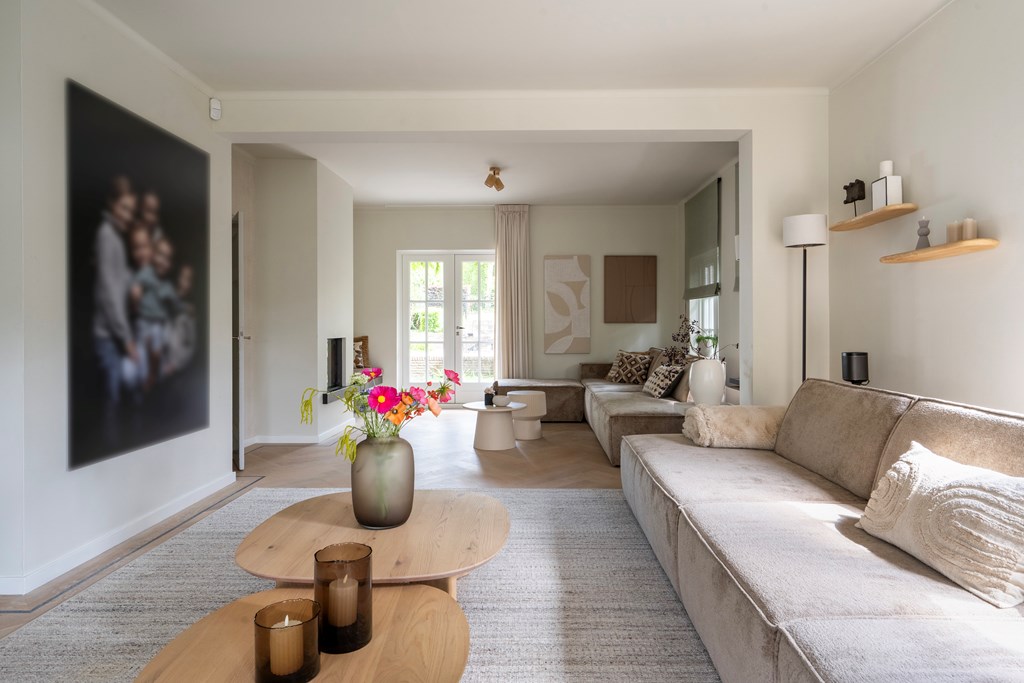 De woonkamer is een ware blikvanger met zijn visgraatvloer en elegante inrichting. Deze riante ruimte is slim ingedeeld en biedt meerdere gezellige zitplekken, waardoor u kunt genieten van de verschillende hoeken en uitzichten in de kamer. De overvloed aan ramen zorgt voor een prachtige lichtinval gedurende de dag, wat bijdraagt aan een lichte en open sfeer. Hier kunt u ontspannen met een goed boek of gasten ontvangen in een stijlvolle setting.