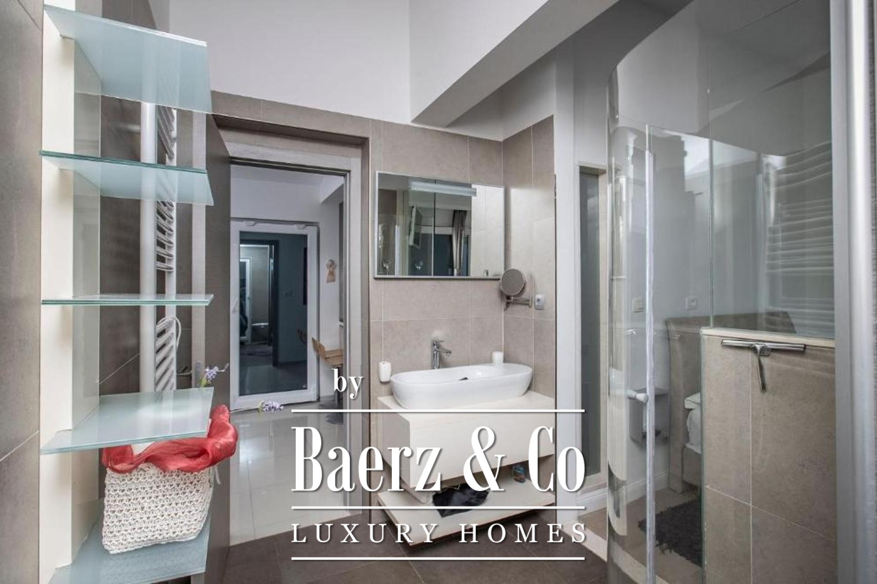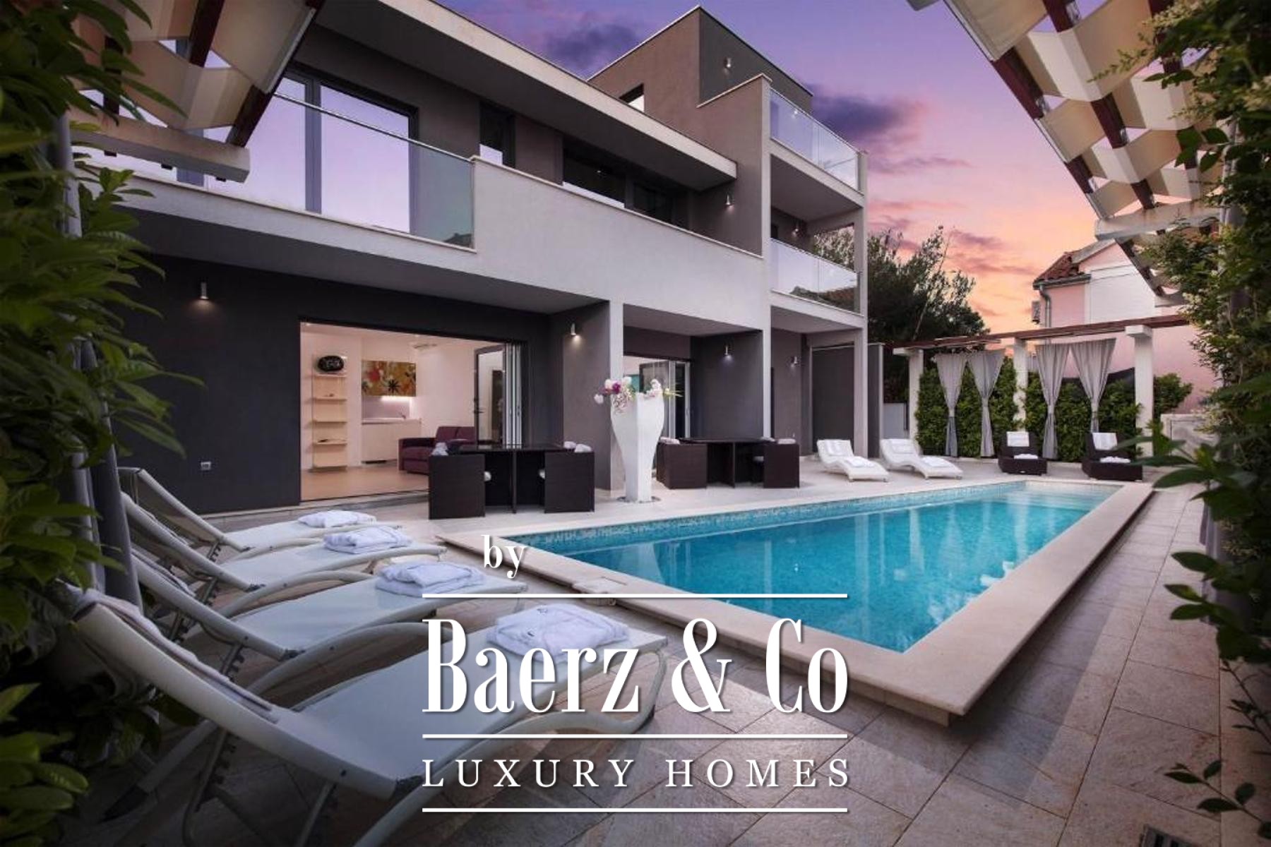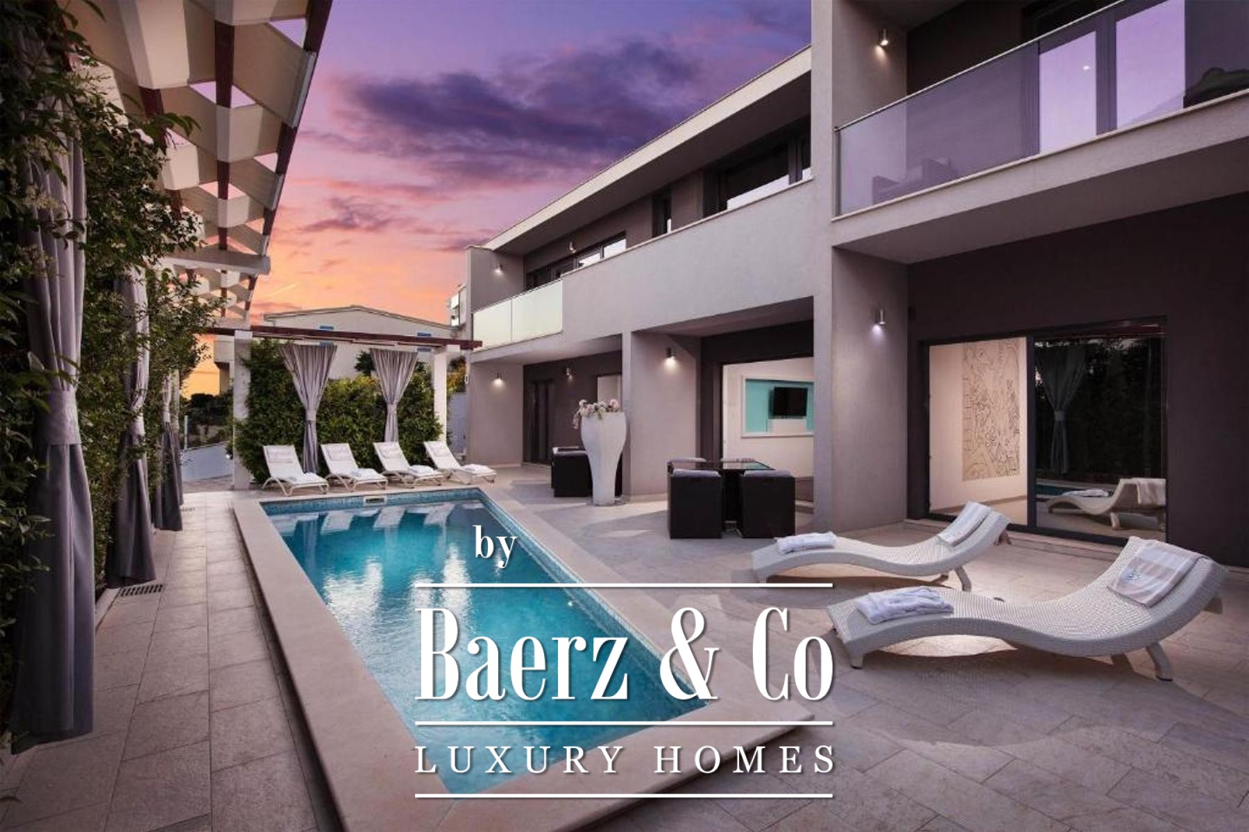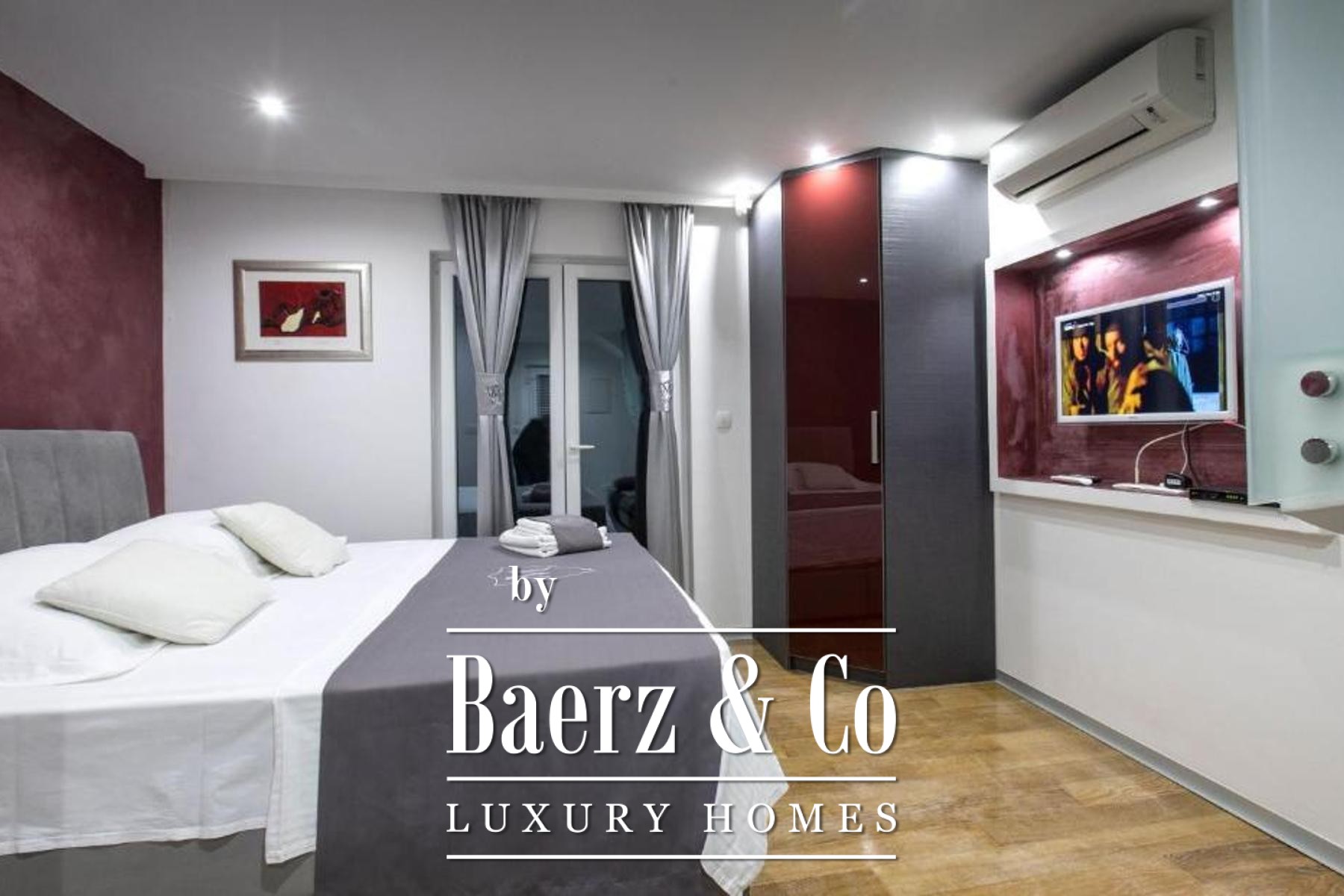 De bovenverdieping biedt een lichte leefruimte met keuken en eetgedeelte, twee slaapkamers en twee badkamers, waarbij elke hoofdruimte toegang biedt tot balkons met uitzicht op zee en zwembad. Flexibiliteit staat centraal, want de eerste verdieping kan worden gescheiden in zelfstandige appartementen om tegemoet te komen aan diverse woonwensen of voor eventuele gastverblijven. Verfijnde afwerkingen en hoogwaardige inrichting kenmerken elk detail, terwijl doordachte voorzieningen zoals een taverne met barbecue, een uitnodigende eet- en ontmoetingsruimte en een zonnige tuin bijdragen aan het wooncomfort. Drie parkeerplaatsen maken het geheel compleet, voor ontspanning en mogelijkheden aan de prachtige Kroatische kust.