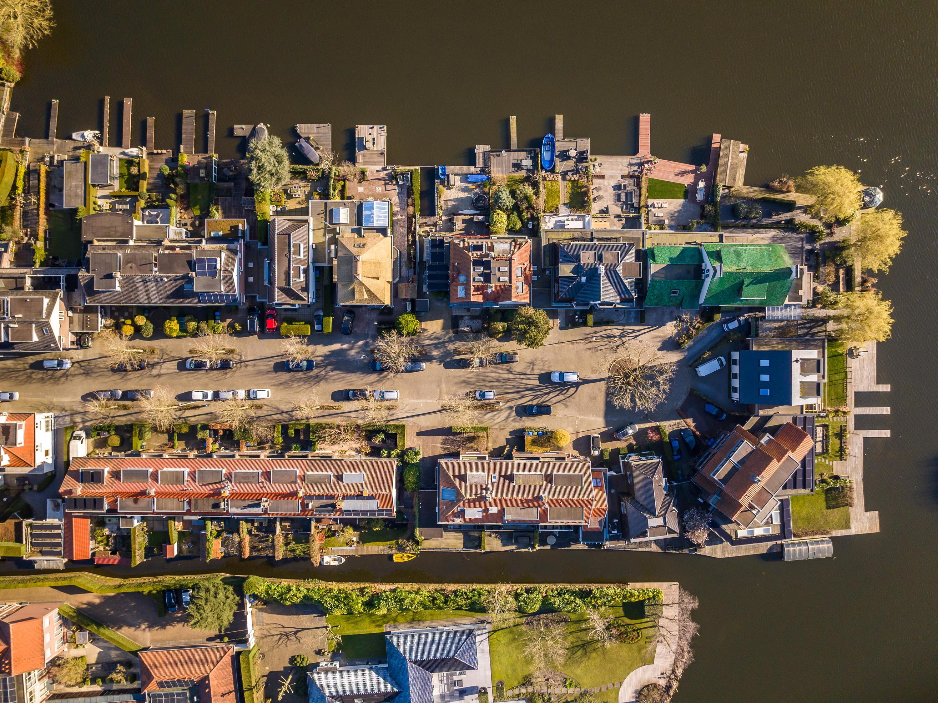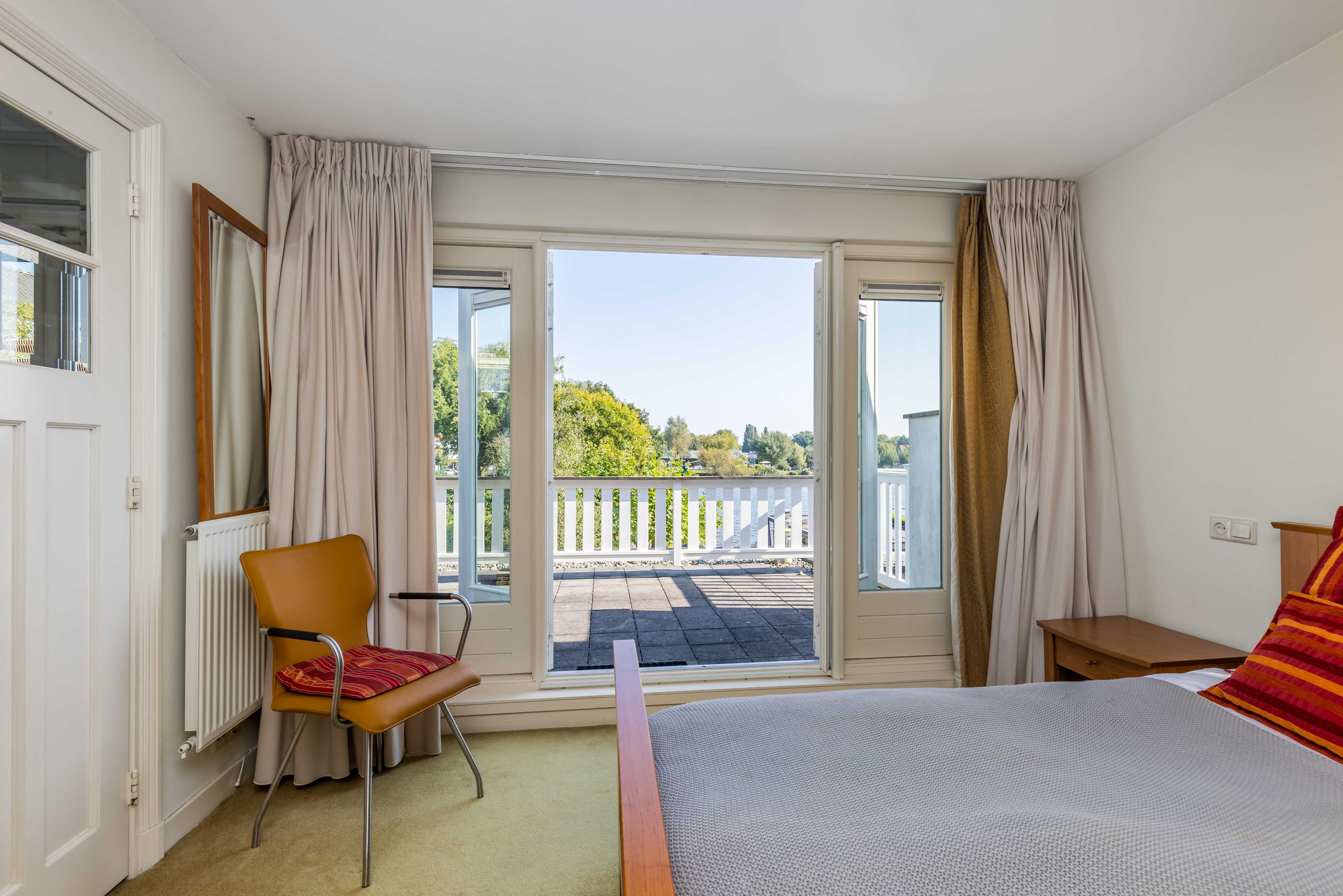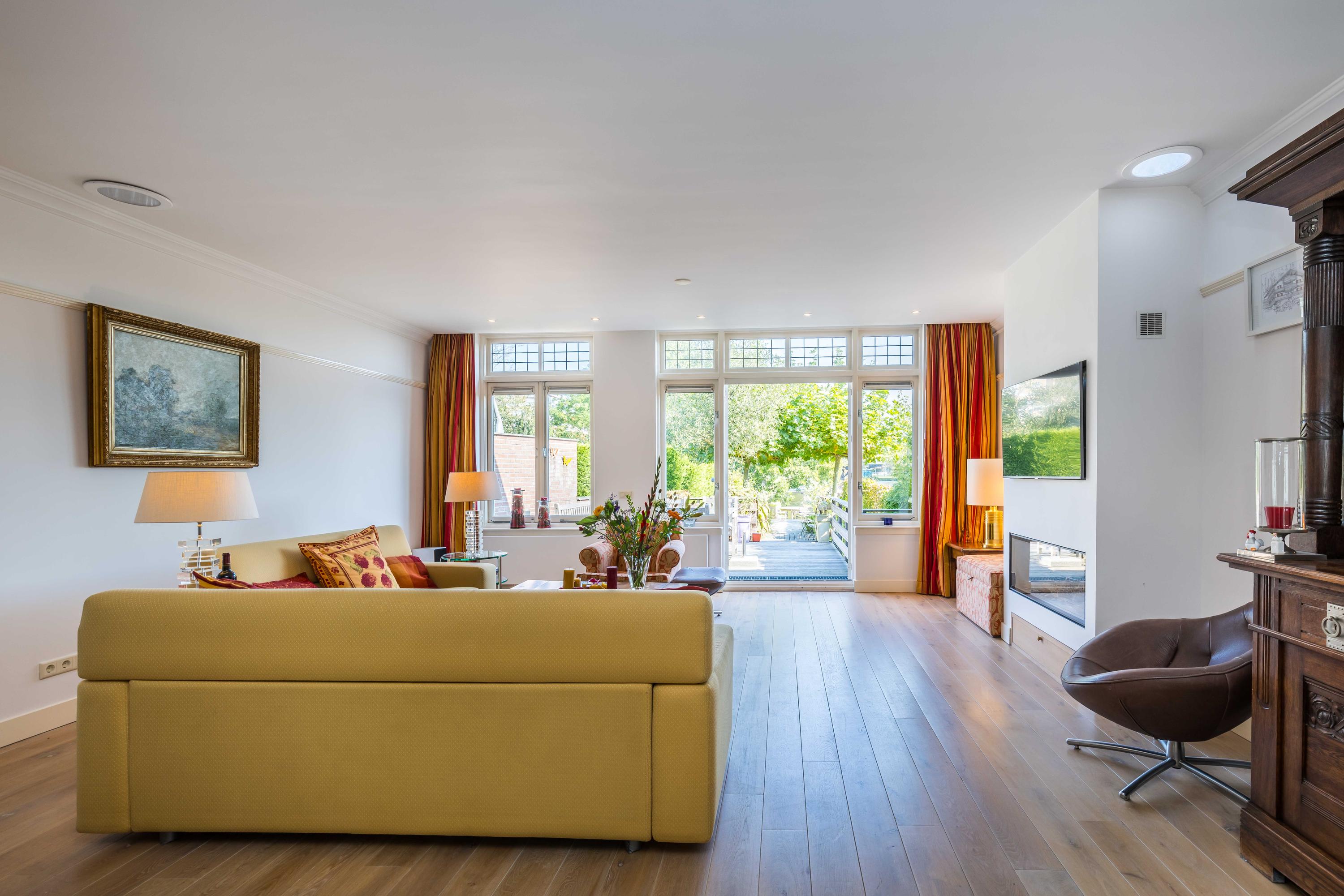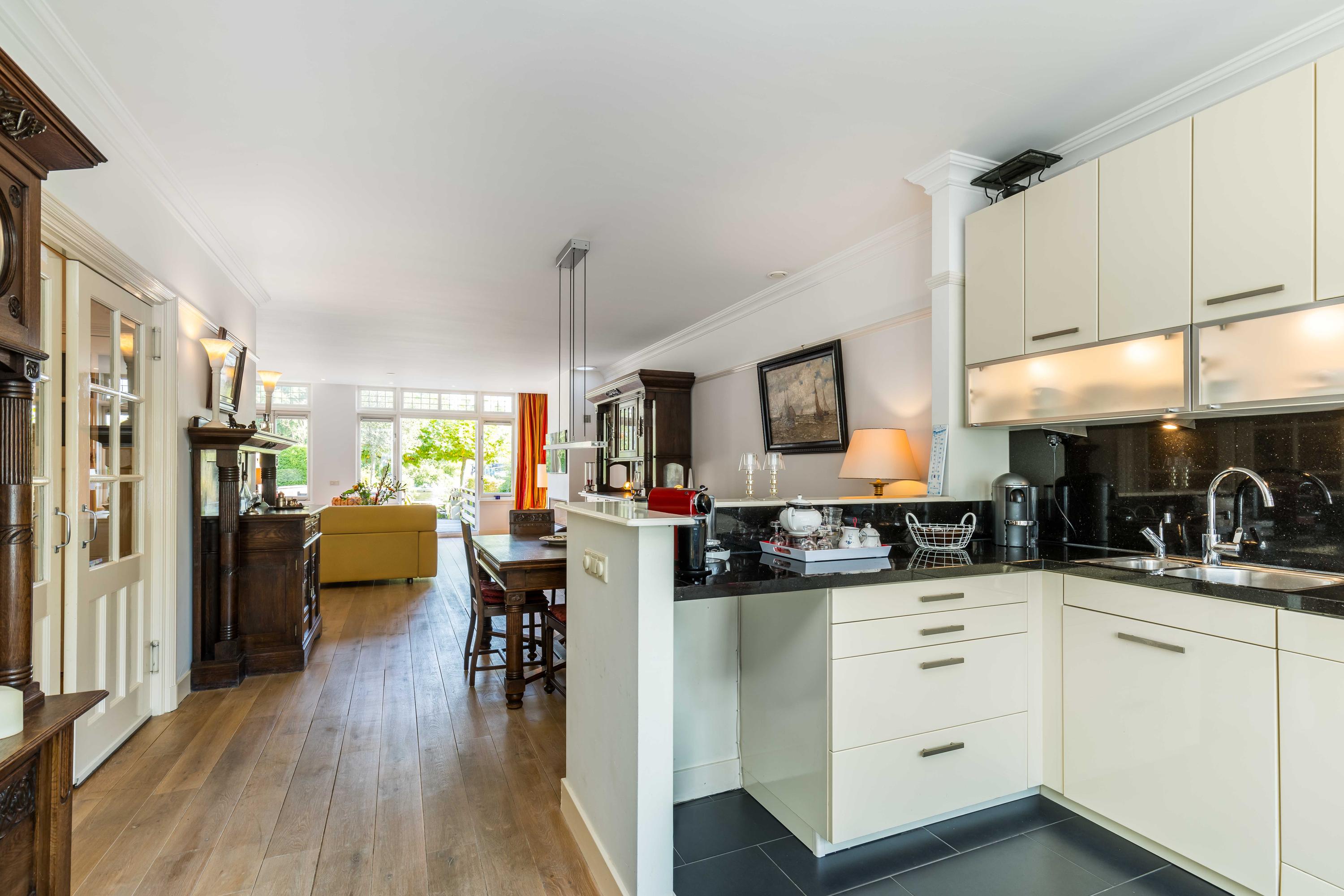 begane grond: entree, vestibule met originele marmeren lambrisering, granitovloer en glas-in-lood-raampjes en tochtdeur, hal met trapopgang, extra ruime toiletruimte met WC en fonteintje, dubbele deuren naar de living en woonkeuken, oorspronkelijk zat de keuken aan de achterzijde, maar thans bevindt de open keuken zich aan de voorzijde, waardoor de uitgebouwde woonkamer een breedte van bijna 6 meter heeft over de gehele breedte van het huis, de woonkamer is voorzien van een goed gepositioneerde gashaard waar je lekker omheen kunt zitten. Middels 2 Sola-tubes komt er verrassend veel extra daglicht in de woonkamer. Vanuit de zitkamer geven openslaande deuren toegang tot het onderheide terras en de achtertuin (eveneens grotendeels onderheid) met o.a. een terras/vlonder aan het water waar je heerlijk kunt vertoeven. aan de steiger is er plek voor 1 sloep/boot.