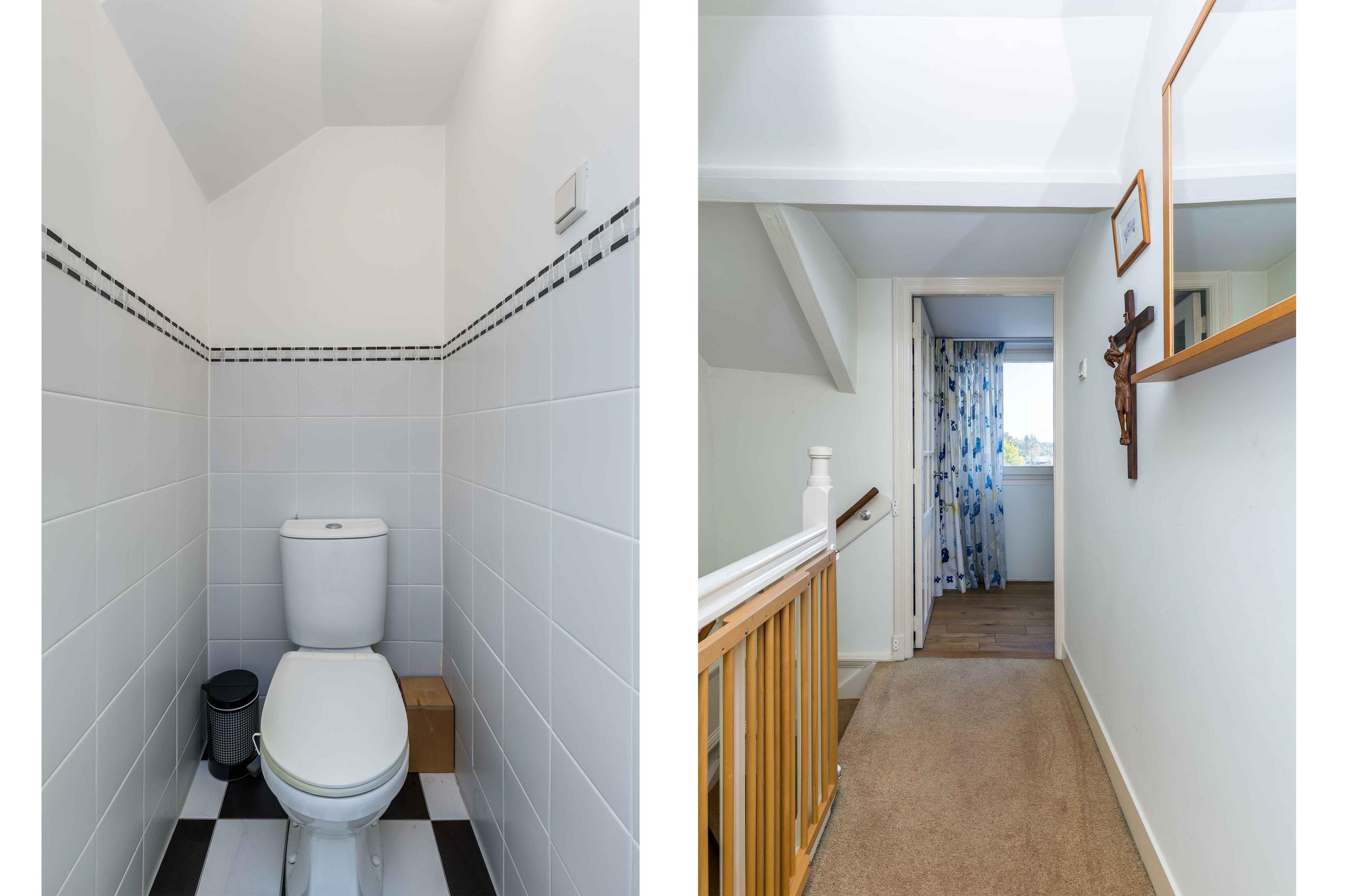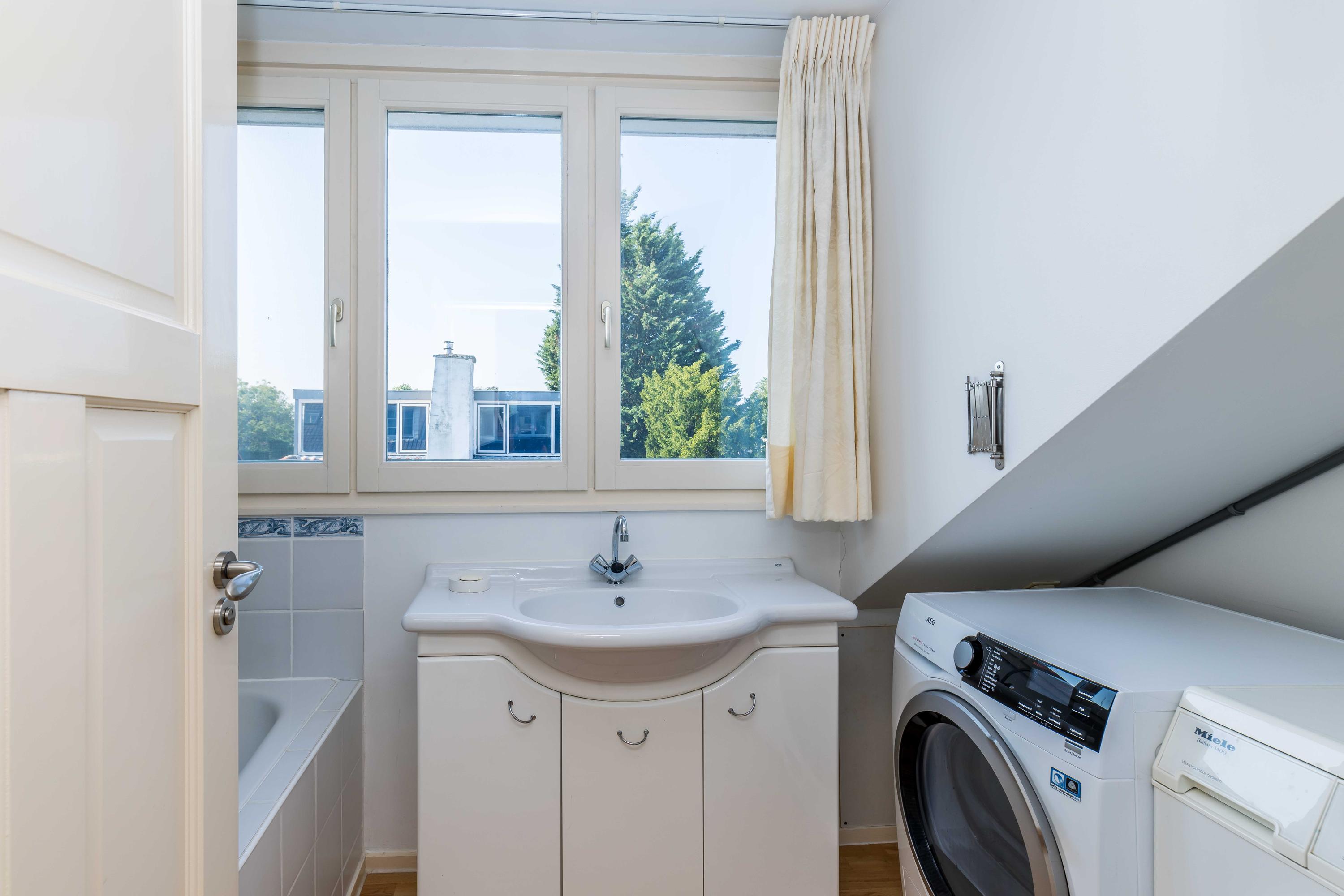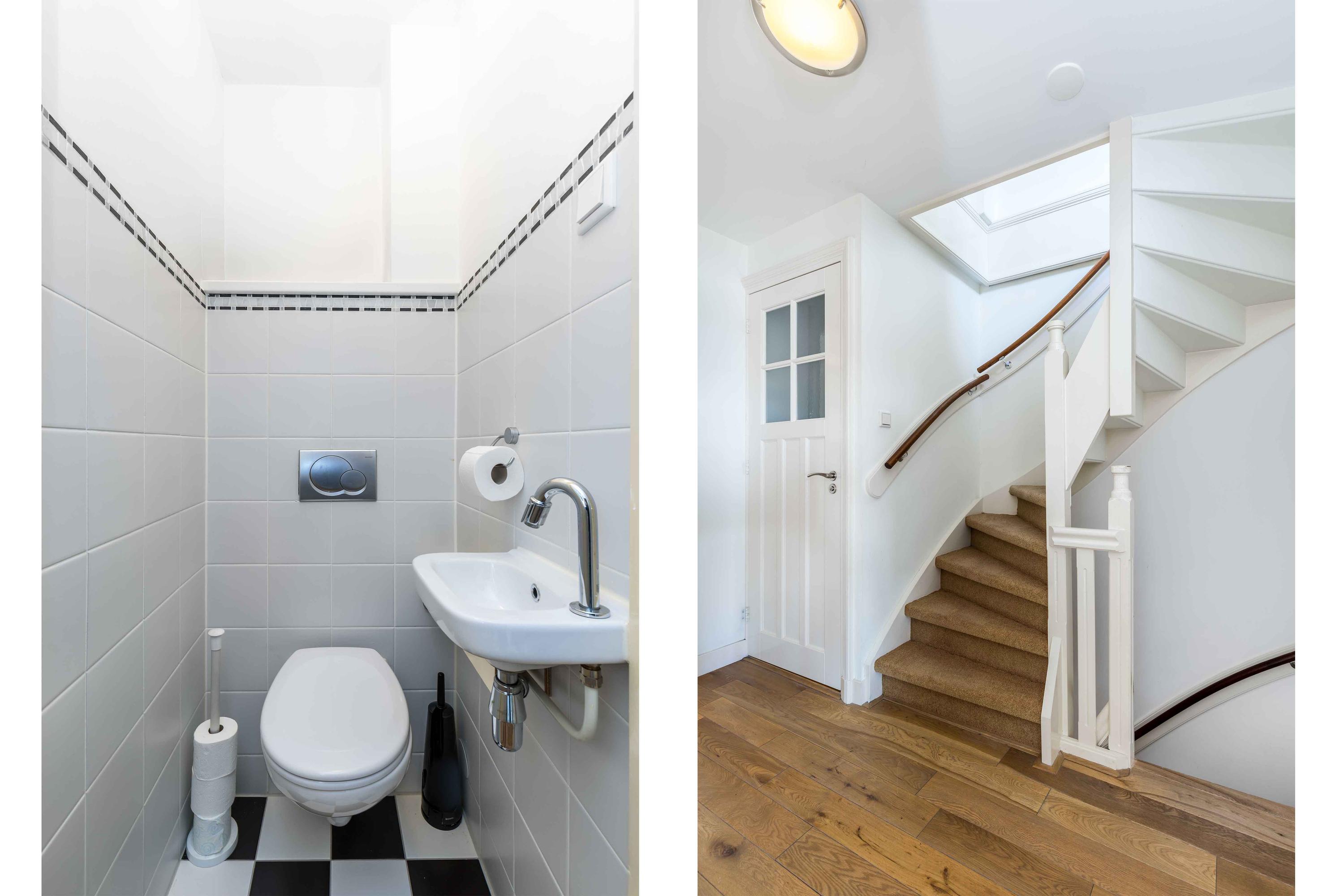 2e verdieping: overloop met eveneens een separaat toilet, slaapkamer achterzijde voorzien van dakkapel en kastenwand waar zich tevens de CV bevindt, slaapkamer voorzijde met dakkapel, 2e badkamer v.v. ligbad met douche, wastafelmeubel en plaats voor een wasmachine en droger naast elkaar.