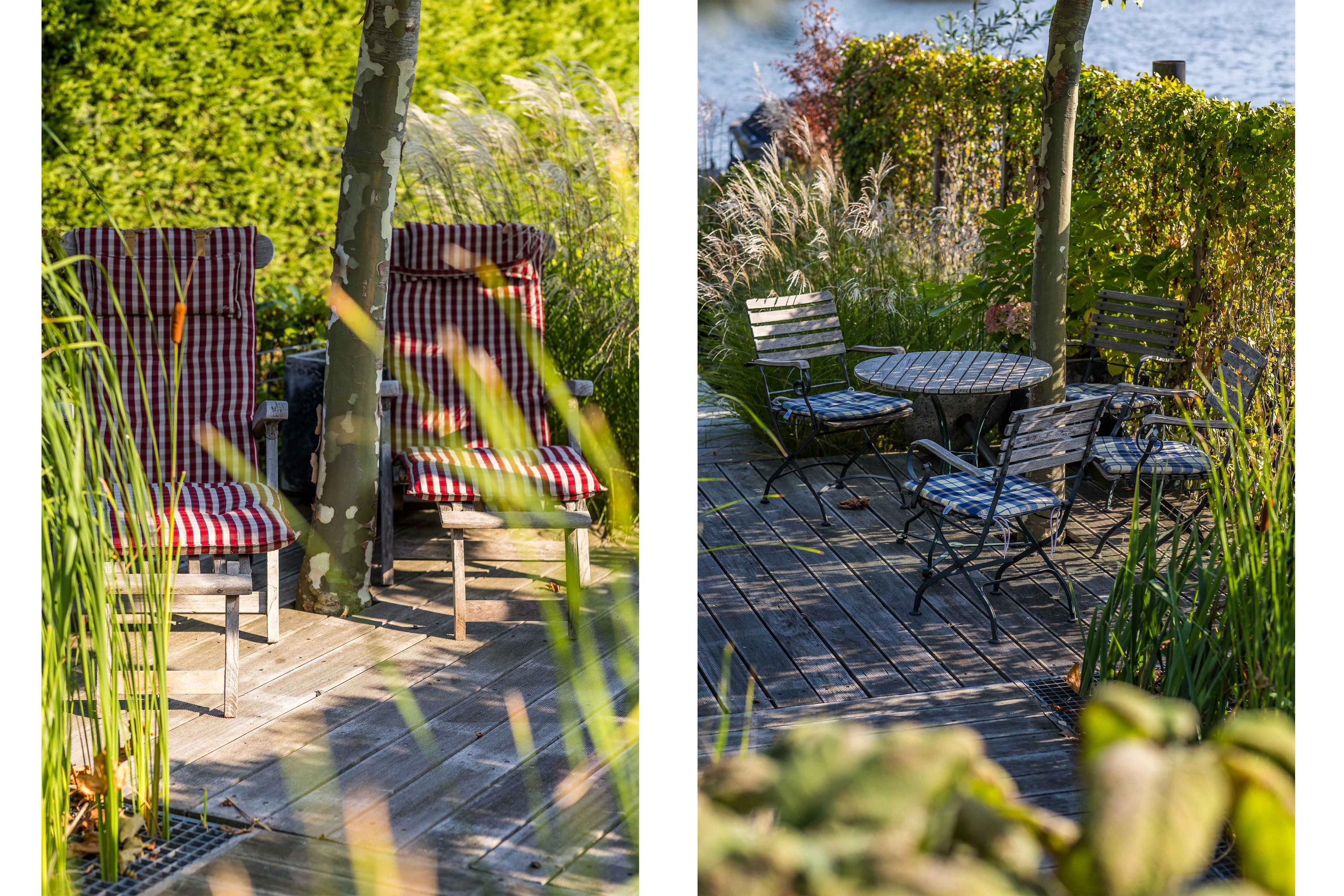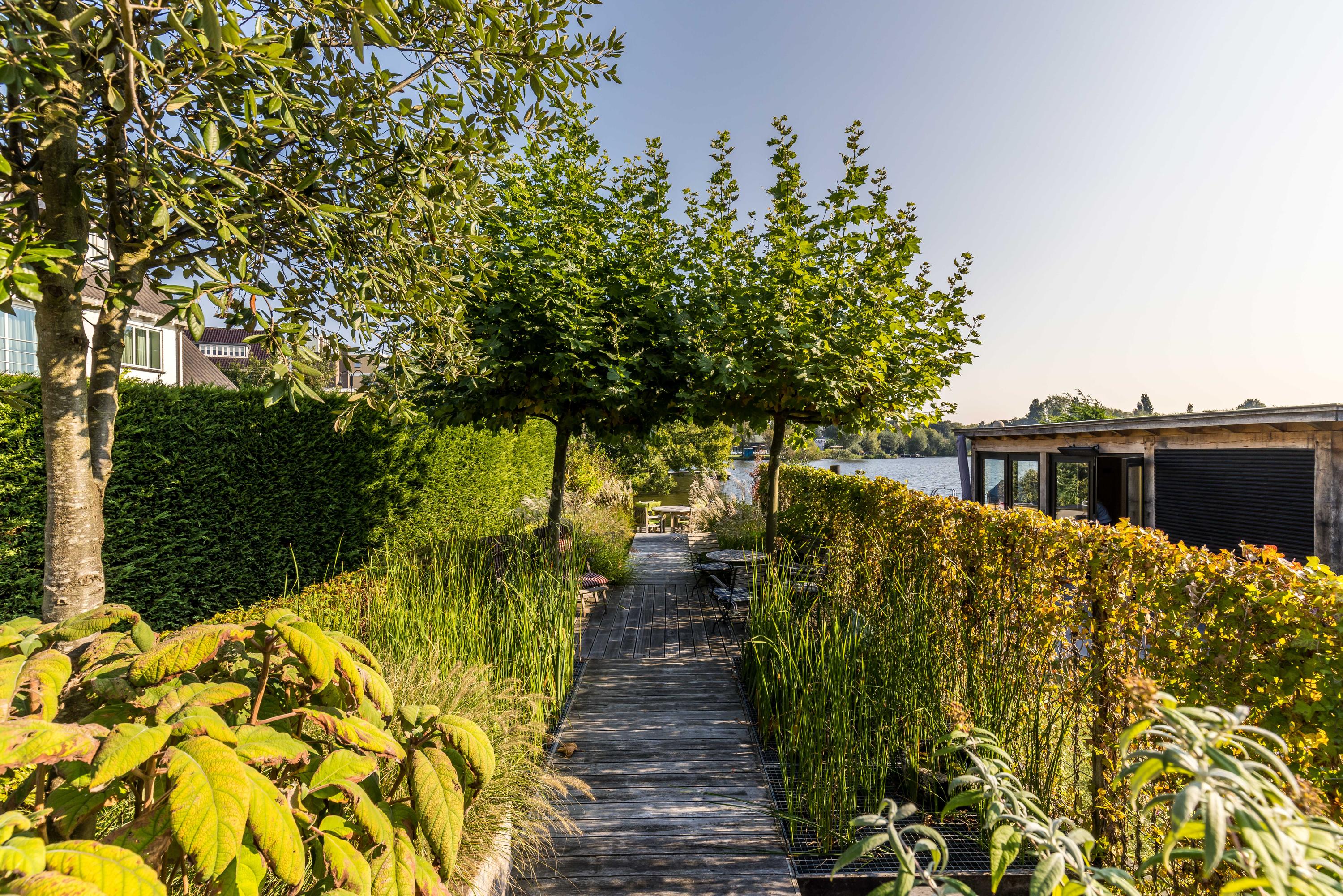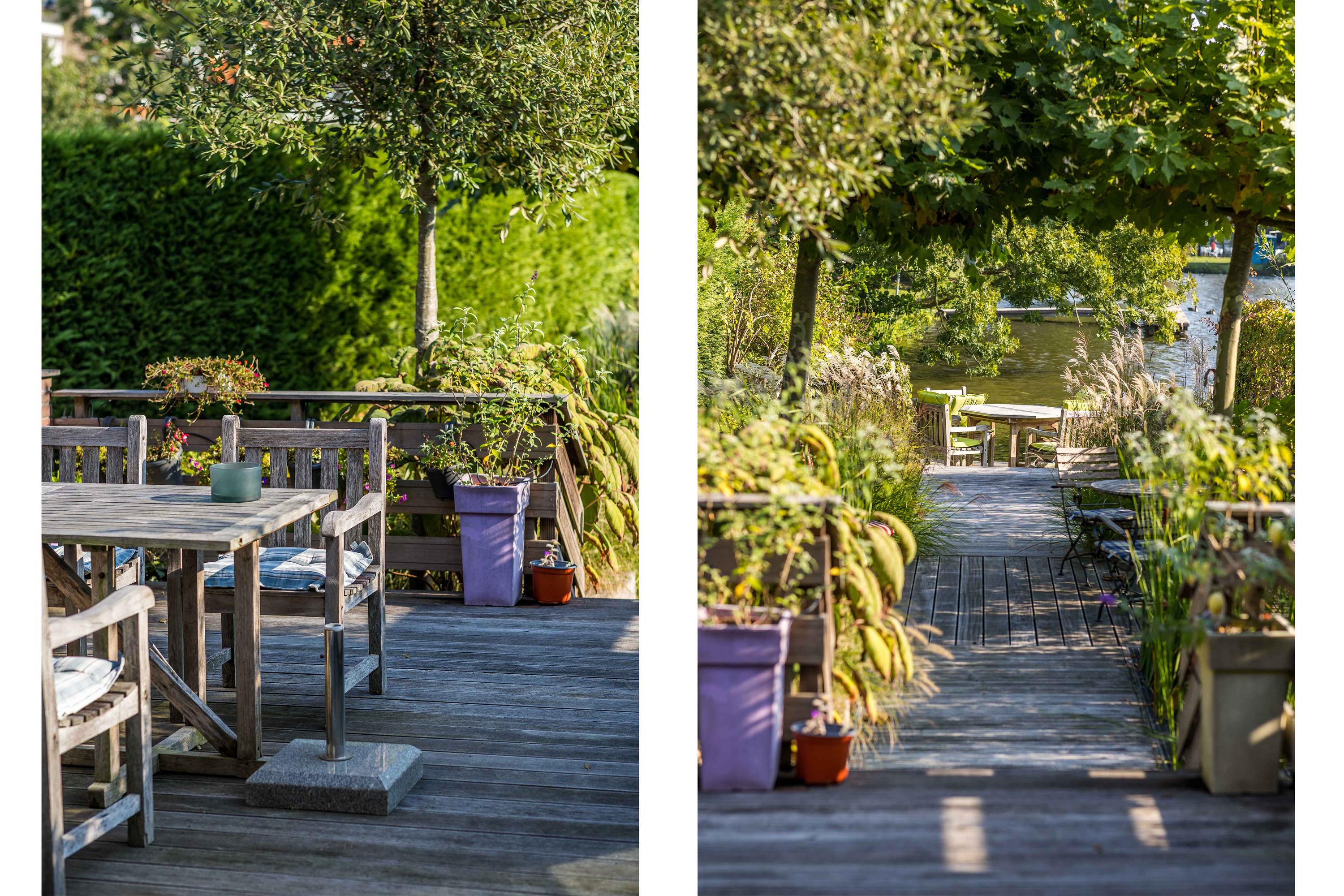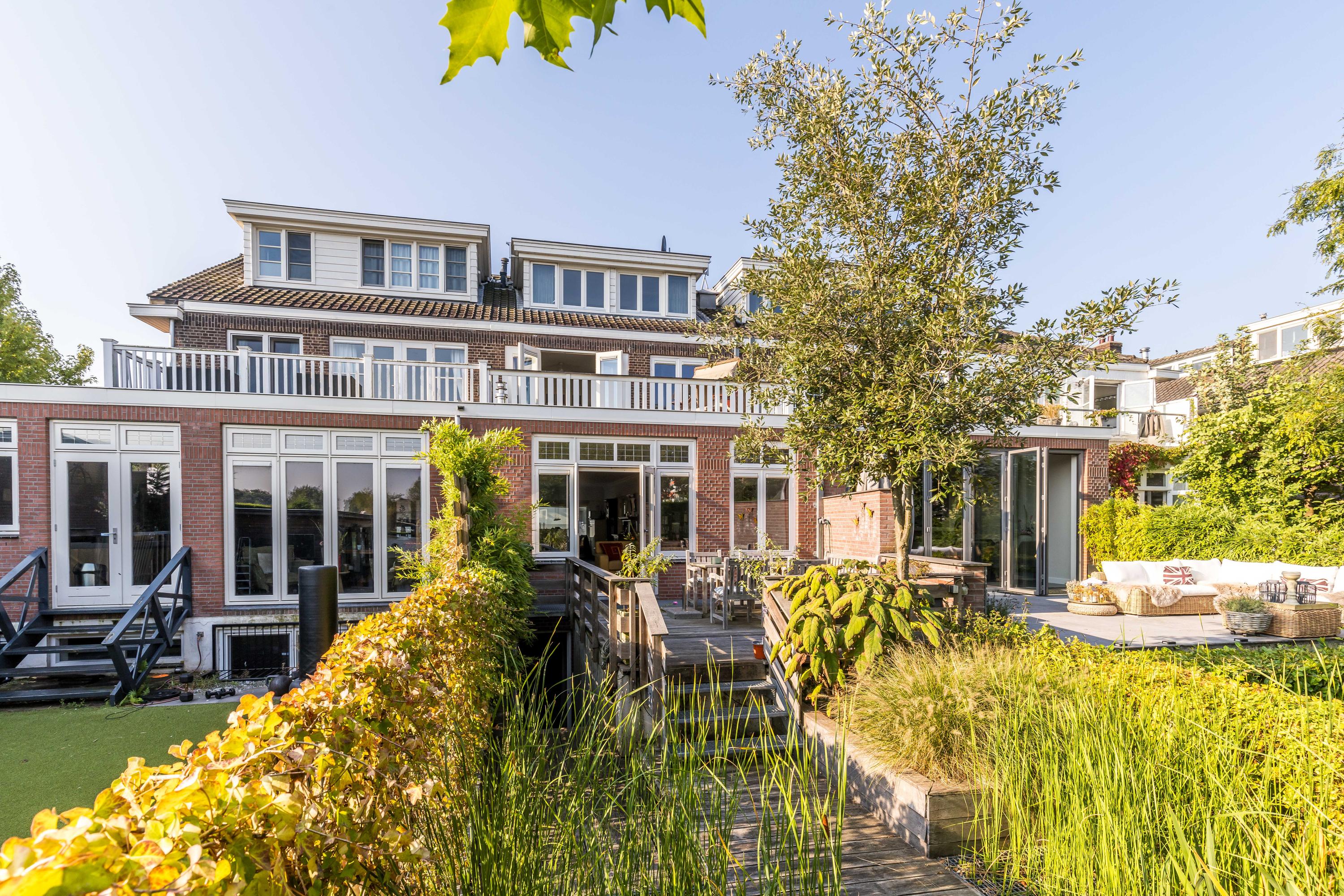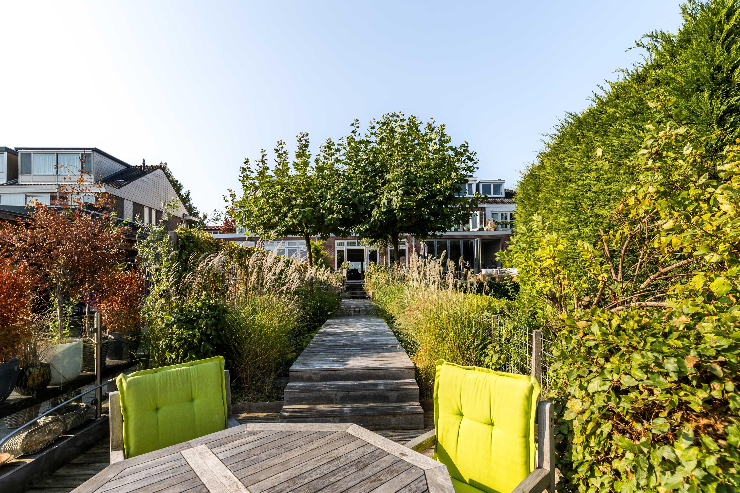Achtertuin: gelegen op het noordoosten, maar vanwege de diepte van ruim 20 meter vanaf de uitbouw begane grond biedt de tuin het overgrote deel van de dag zon. De achtertuin loopt wat tabs toe, begint bij het huis met een breedte van ca. 6 meter en bij de waterkant ca. 3 meter.
