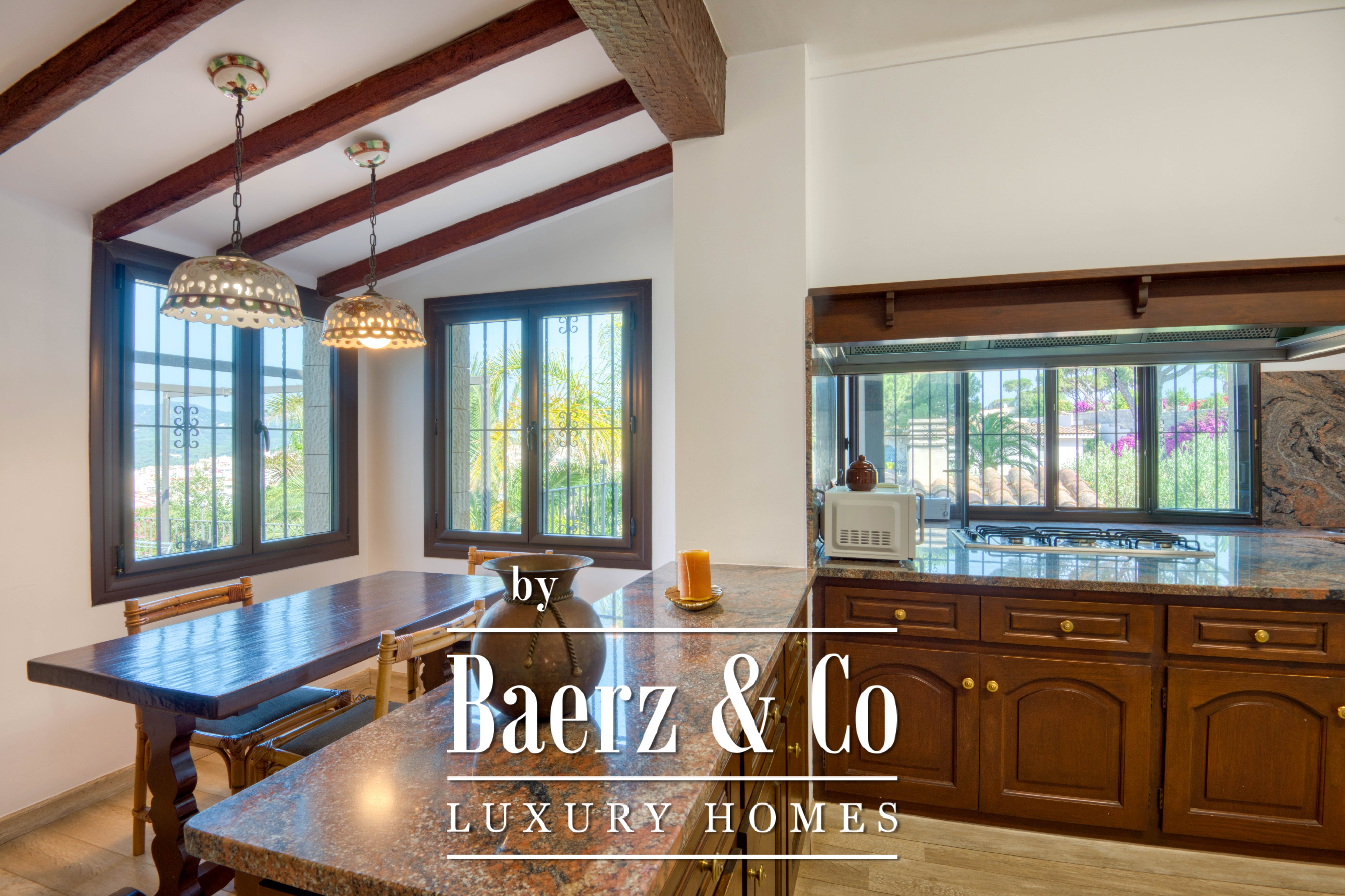 Het hart van de woning bestaat uit een royale woonkamer met open haard die doorloopt in een ruime eetkamer—een natuurlijke plek voor samenzijn maar ook voor rust. De aparte, volledig uitgeruste keuken biedt alle faciliteiten voor culinaire creativiteit en kijkt uit op levendige tuinen. Overdekte veranda’s en terrassen, ideaal gesitueerd voor de zonsondergang, vormen uitnodigende plekken om te genieten van het buitenleven en reflectie, terwijl de privétuin met mediterrane beplanting het huis omringt met rust.