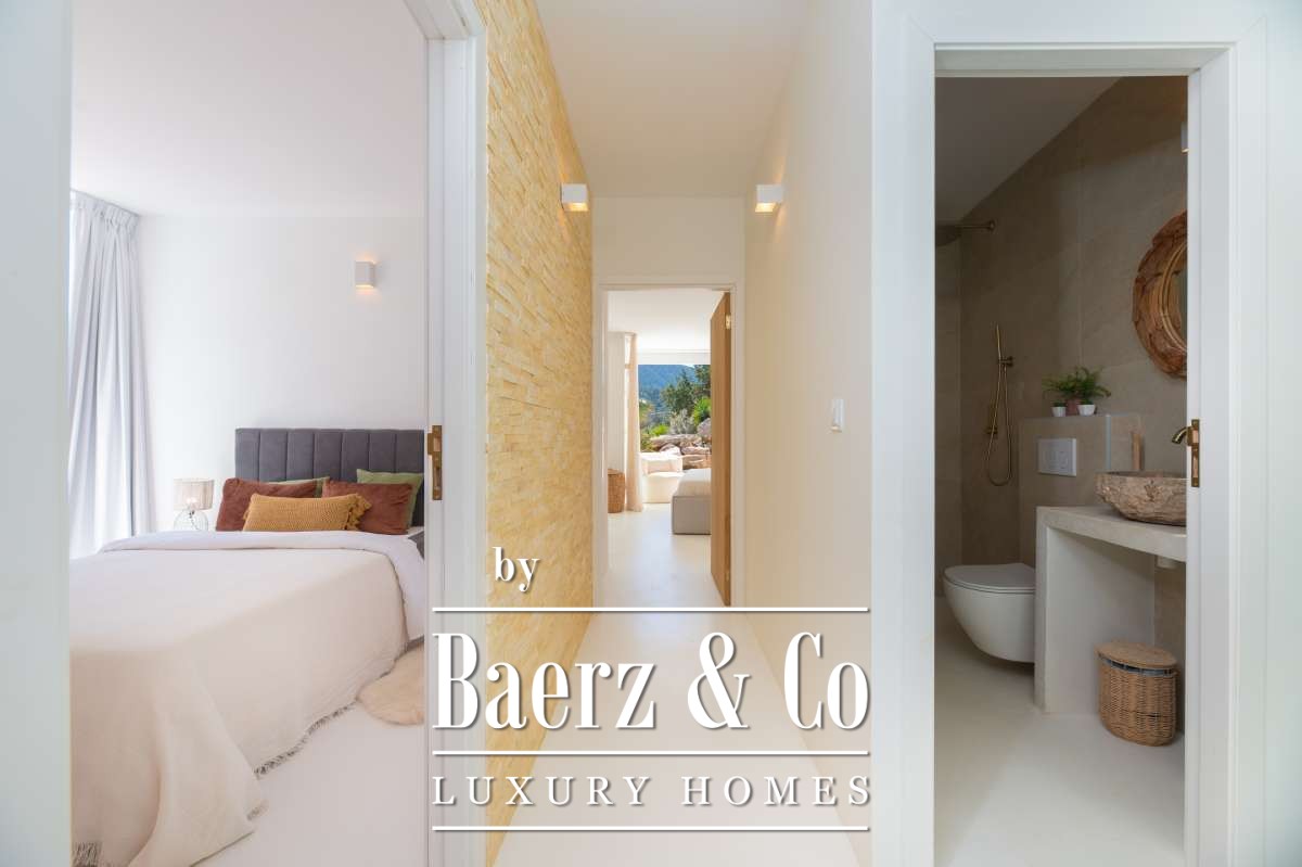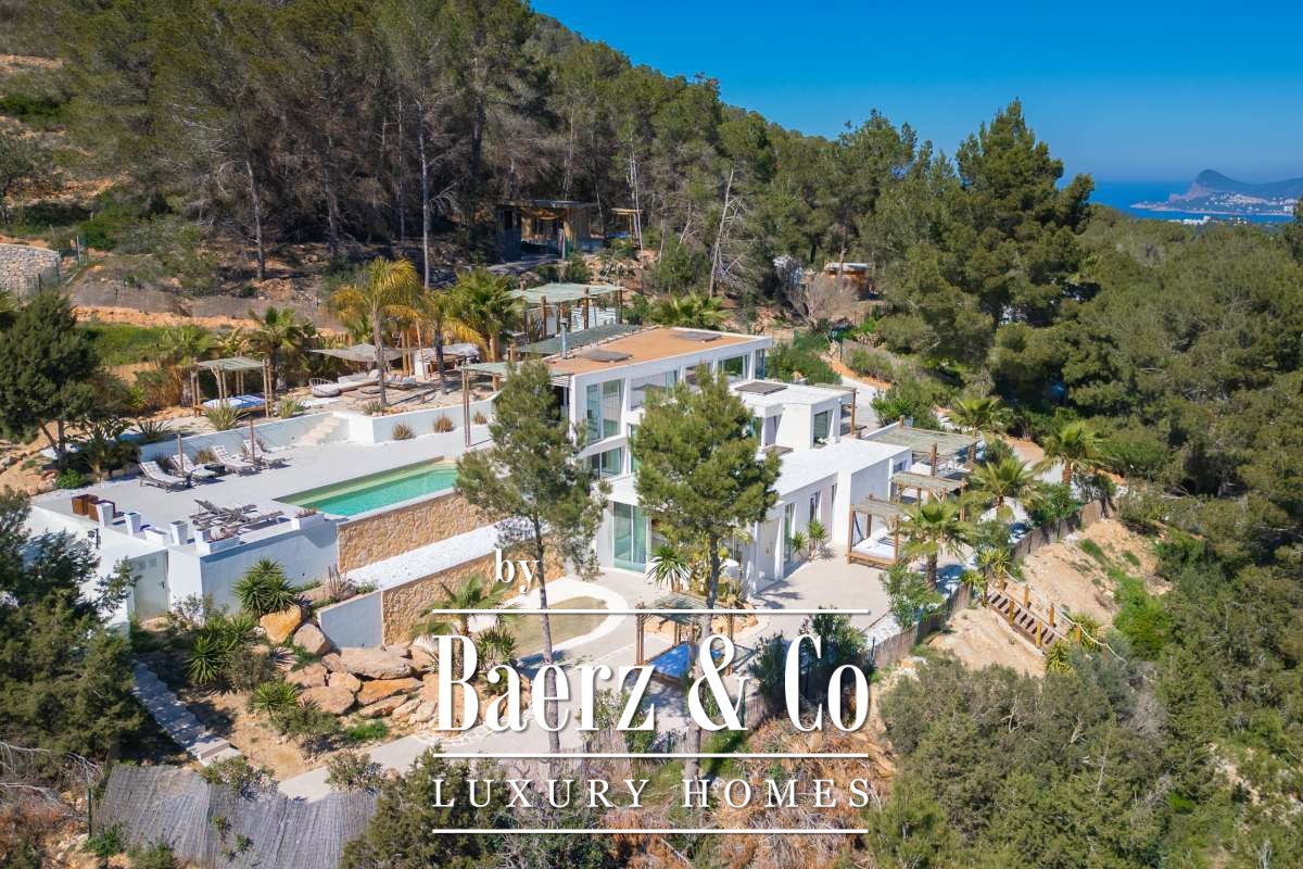 De omgevingVerscholen in de groene heuvels van het westen van Ibiza biedt deze villa een zeldzame combinatie van rust, ruimte en indrukwekkende vergezichten. Gelegen op een royaal perceel van maar liefst 19.600 m² geniet u hier van absolute privacy, omringd door mediterrane natuur en glooiende heuvels. Vanaf verschillende plekken op het terrein kijkt u uit over het landschap met in de verte zelfs een glimp van de zee. Tegelijkertijd liggen het charmante San José en enkele van Ibiza’s mooiste stranden, zoals Cala Tarida, Cala Conta en Cala Bassa, op korte rijafstand.De villaDe villa beschikt over een totale woonoppervlakte van circa 330 m², inclusief een ruim souterrain van ongeveer 120 m², en combineert comfort, ruimte en privacy op een unieke manier. Met vier slaapkamers en drie badkamers is de woning perfect ingericht voor zowel familie als gasten, terwijl de royale opzet zorgt voor een ontspannen en luxe woonervaring. Grote raampartijen laten het daglicht rijkelijk binnenstromen en creëren een prachtige verbinding tussen de binnenruimtes en het omliggende landschap. Het comfortniveau ligt hoog: vloerverwarming en airconditioning in alle ruimtes zorgen het hele jaar door voor een aangenaam klimaat. Daarnaast beschikt de villa over diverse luxe voorzieningen zoals een indoor gym, sauna, jacuzzi en een wijnkelder van circa 20 m². Ook technisch is de woning uitstekend uitgerust met zonnepanelen, een batterijopslag van 32 kW en een watertank die wordt gevuld via een gemeenschappelijke bron.De buitenruimtesDe buitenruimtes vormen het hart van deze villa en zijn ontworpen om optimaal te genieten van het mediterrane buitenleven. Rondom de woning liggen meerdere terrassen met een totale oppervlakte van circa 300 m², waar zon, uitzicht en privacy samenkomen. Het infinity zwembad van ongeveer 30 m² met natuurlijke waterval vormt het stralende middelpunt en lijkt naadloos over te vloeien in het omliggende landschap. Daarnaast beschikt het terrein over een stijlvolle outdoor living van circa 100 m², een perfecte setting voor lange zomerdagen, diners onder de sterren en ontspannen momenten met vrienden en familie. Verspreid over het perceel bevinden zich verschillende loungeplekken en een buiten gym van circa 30 m². Binnen de huidige vraagprijs behoort tevens de mogelijkheid tot het plaatsen van een mobiele padelbaan. Ook is er een charmant houten gastenverblijf van circa 20 m² met eigen terras en een carport van circa 40 m². Dankzij het royale perceel en de uitzonderlijke privacy voelt deze villa als een privéresort midden in de natuur.