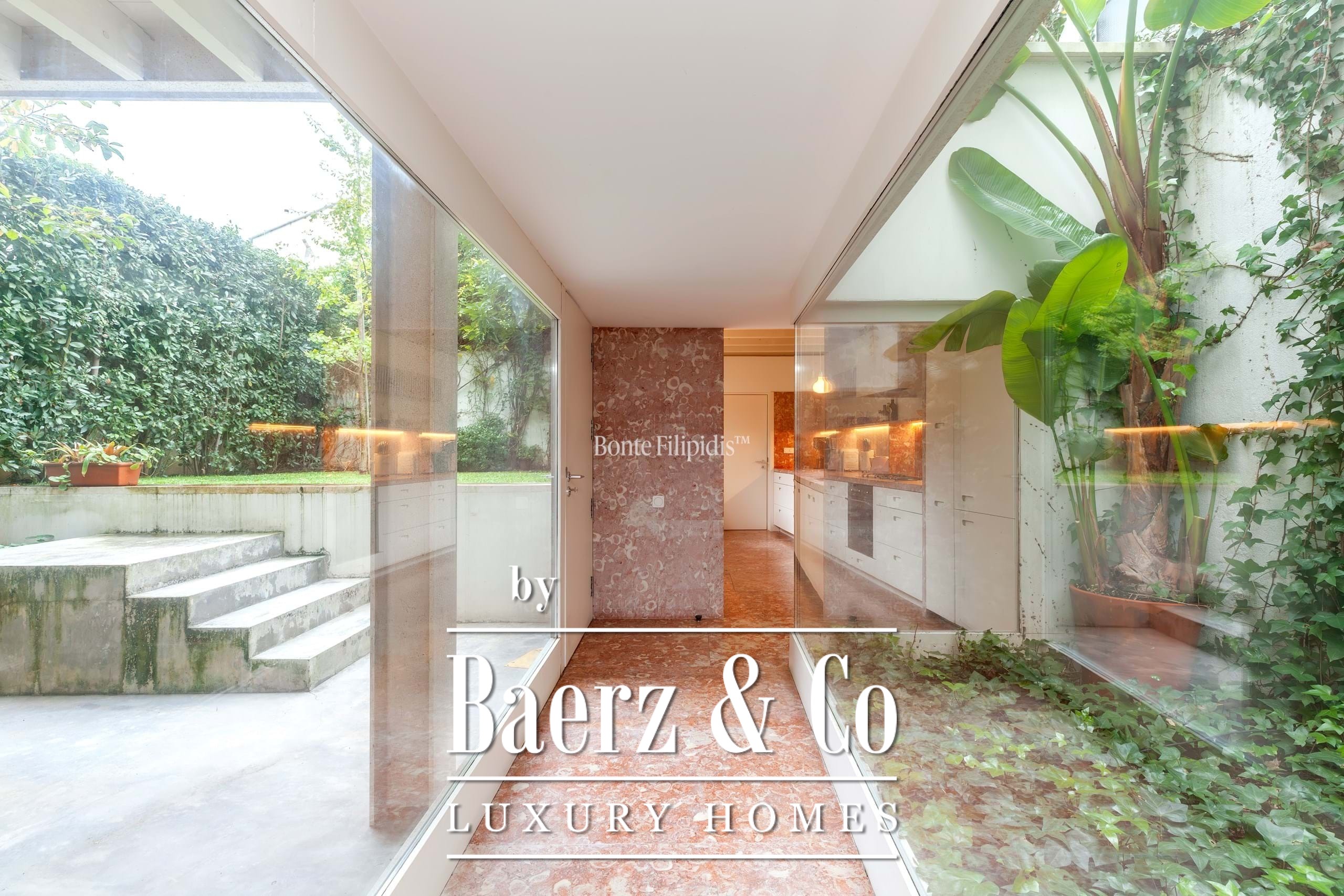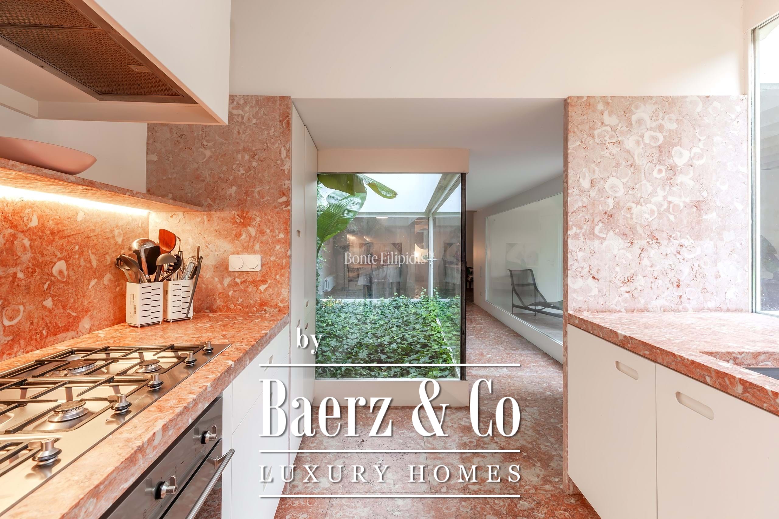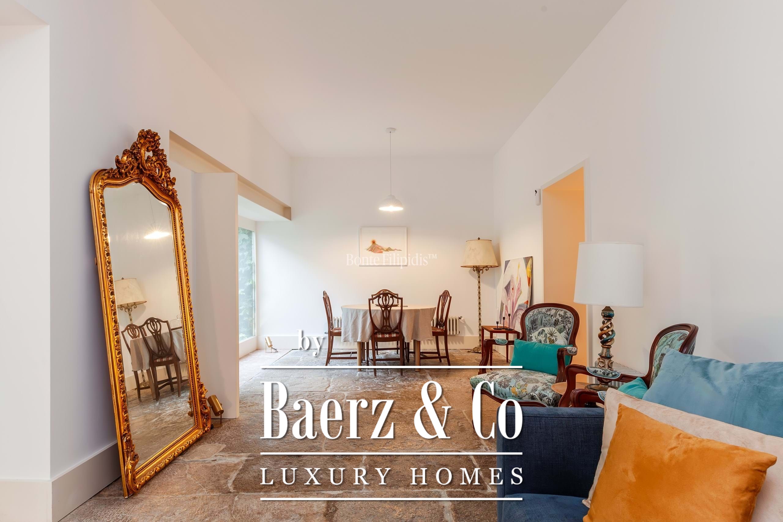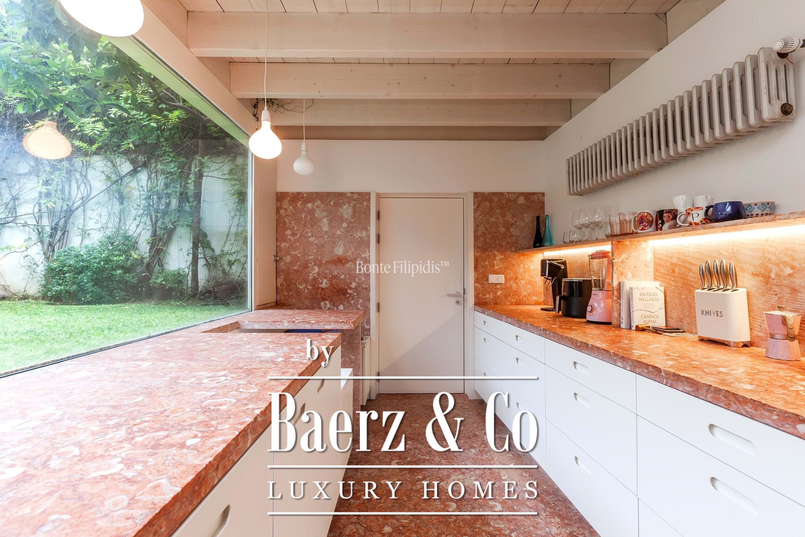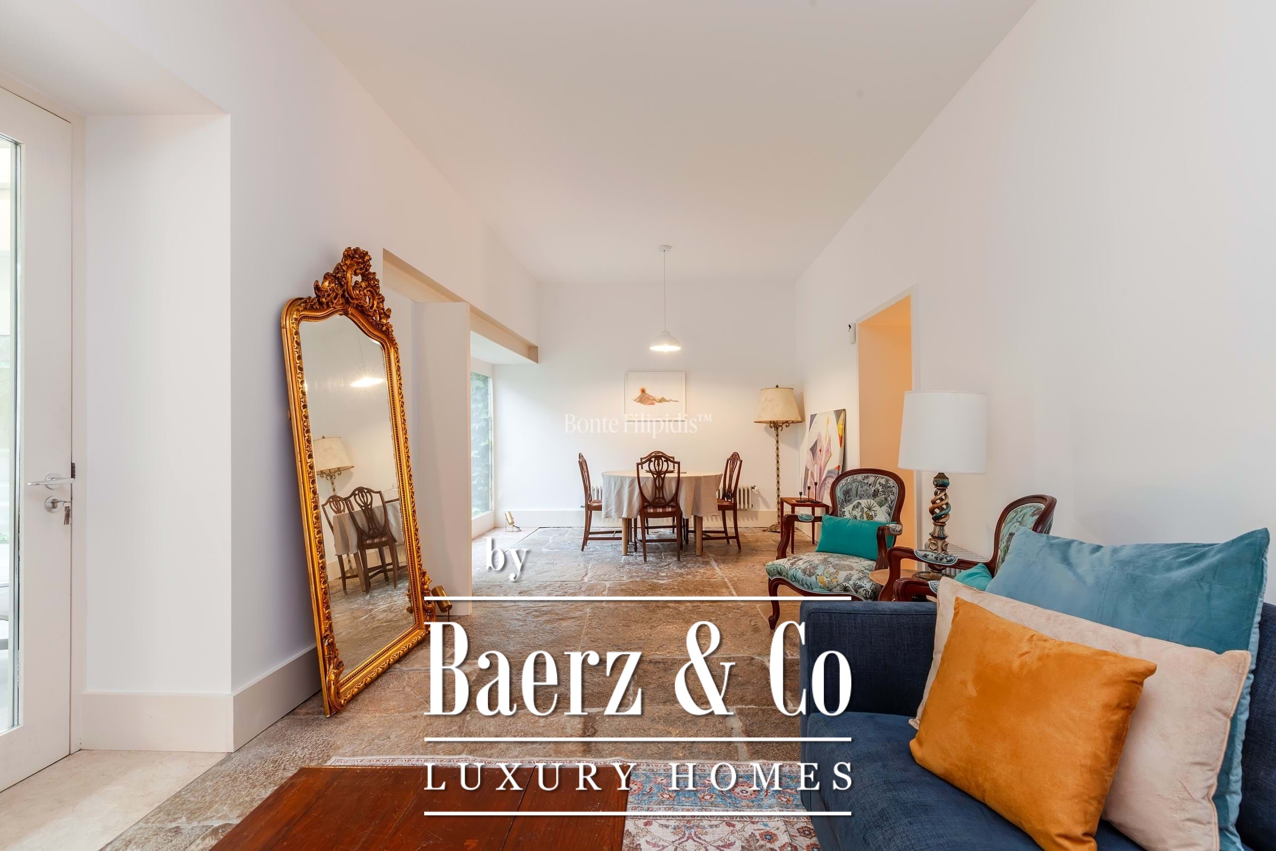 De belangrijkste leefruimtes worden gekenmerkt door originele stenen vloeren en subtiel vintage accenten, terwijl grote panoramische ramen overvloedig daglicht binnenlaten in het open woonconcept. De zit- en eetgedeeltes lopen vloeiend over in een privé tuin van 80 m², een rustige oase omringd door volwassen groen voor stille momenten of intieme bijeenkomsten. Geselecteerde materialen en verfijnde detaillering zorgen voor een ingetogen elegantie in elke ruimte.