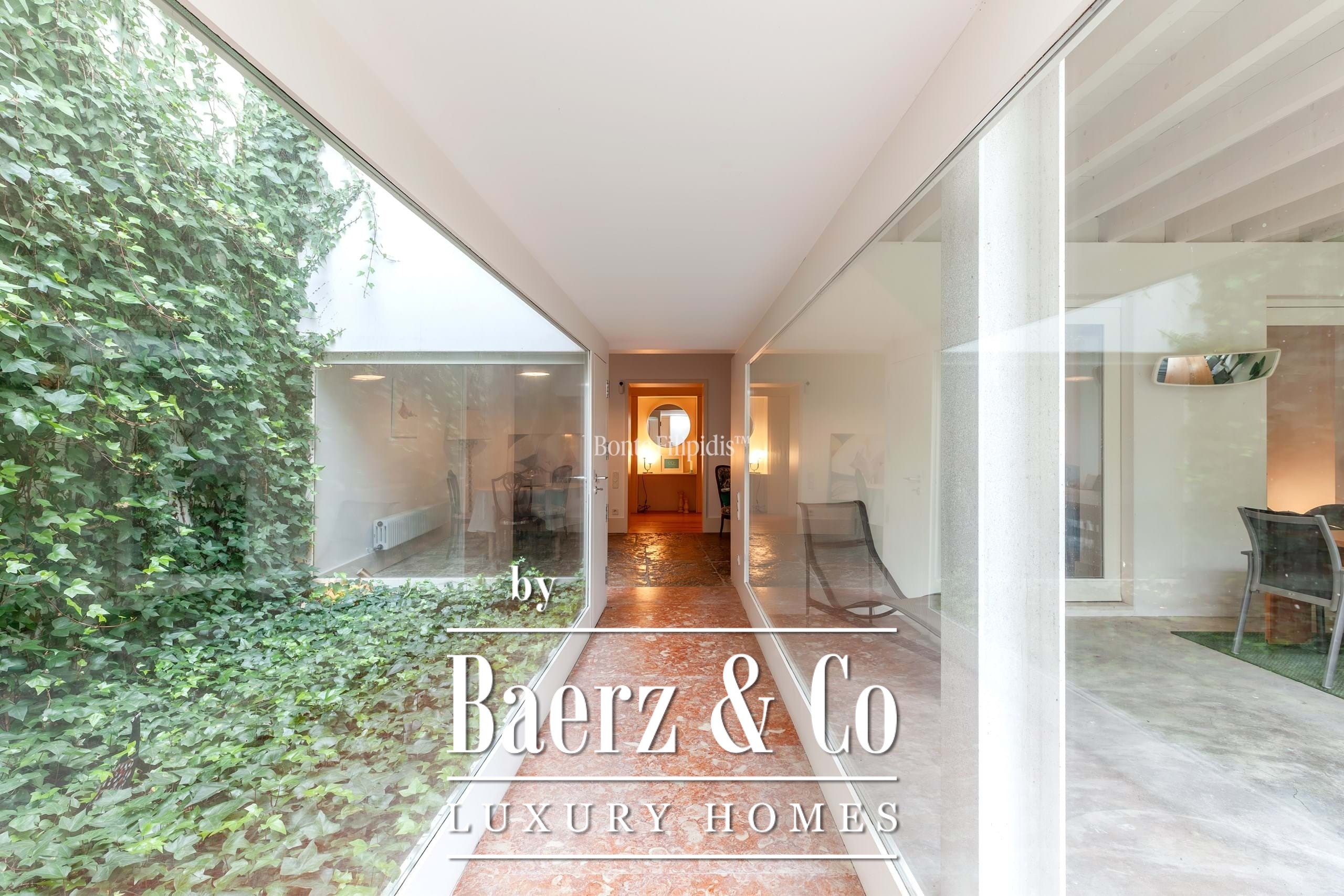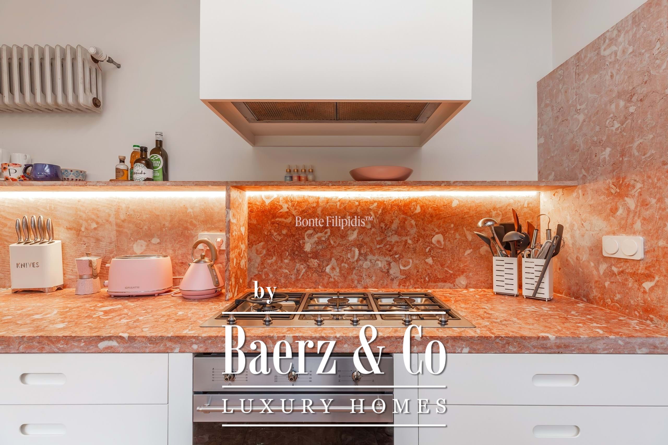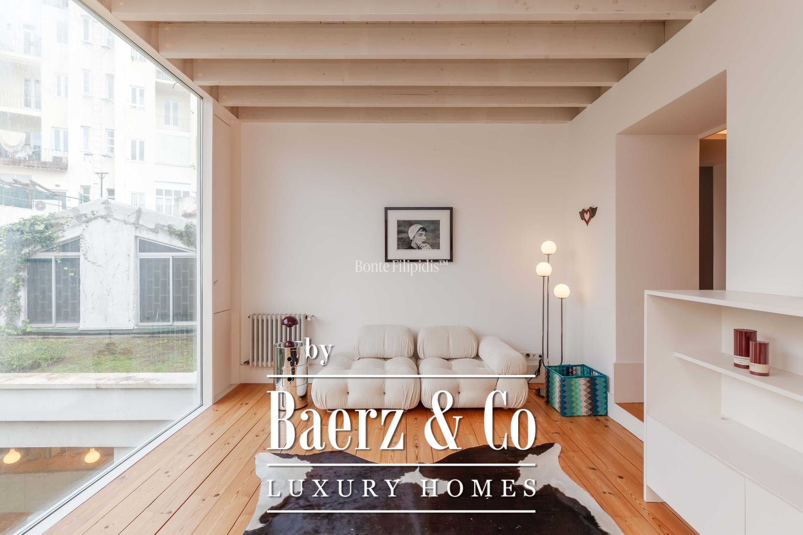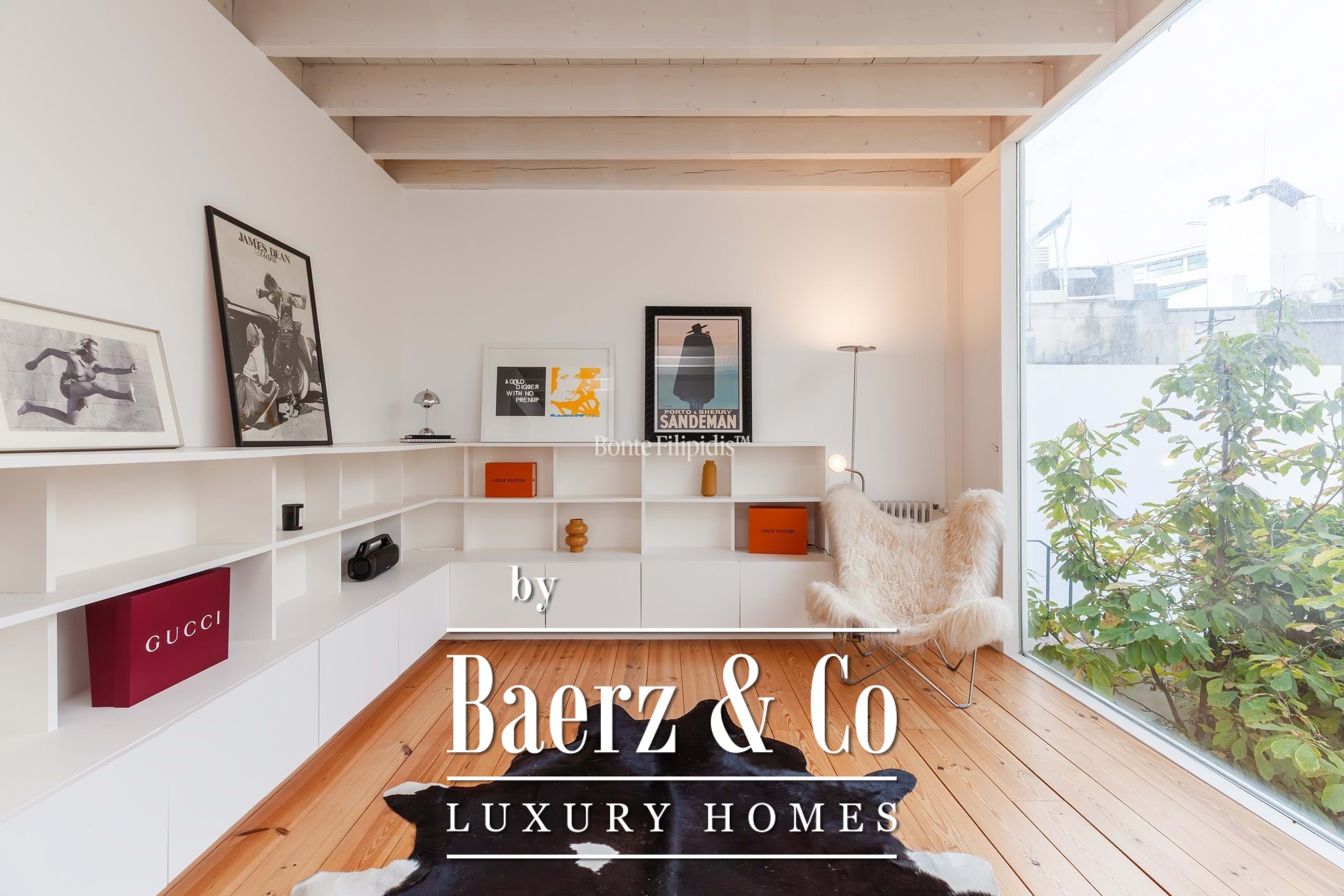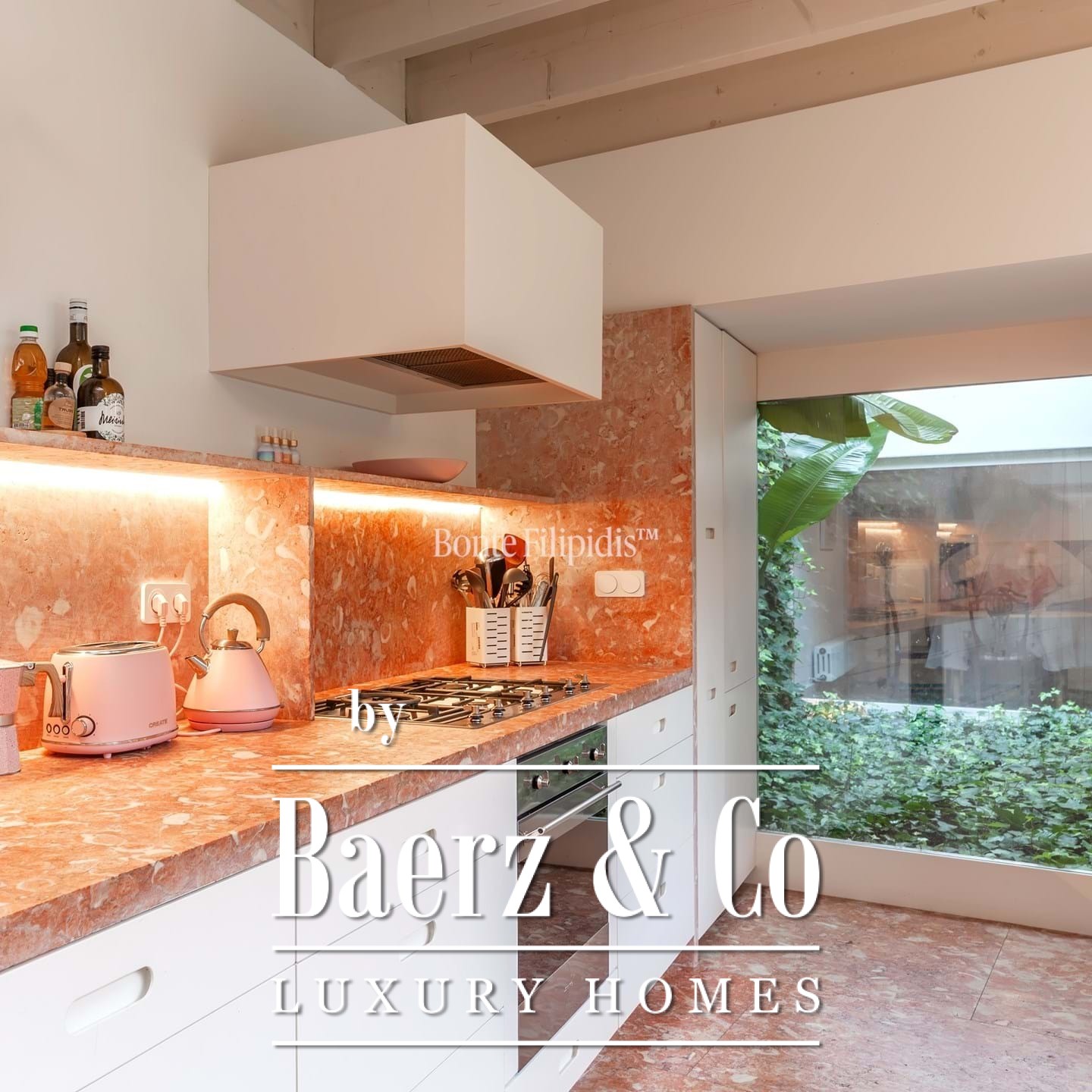 De belangrijkste leefruimtes worden gekenmerkt door originele stenen vloeren en subtiel vintage accenten, terwijl grote panoramische ramen overvloedig daglicht binnenlaten in het open woonconcept. De zit- en eetgedeeltes lopen vloeiend over in een privé tuin van 80 m², een rustige oase omringd door volwassen groen voor stille momenten of intieme bijeenkomsten. Geselecteerde materialen en verfijnde detaillering zorgen voor een ingetogen elegantie in elke ruimte.