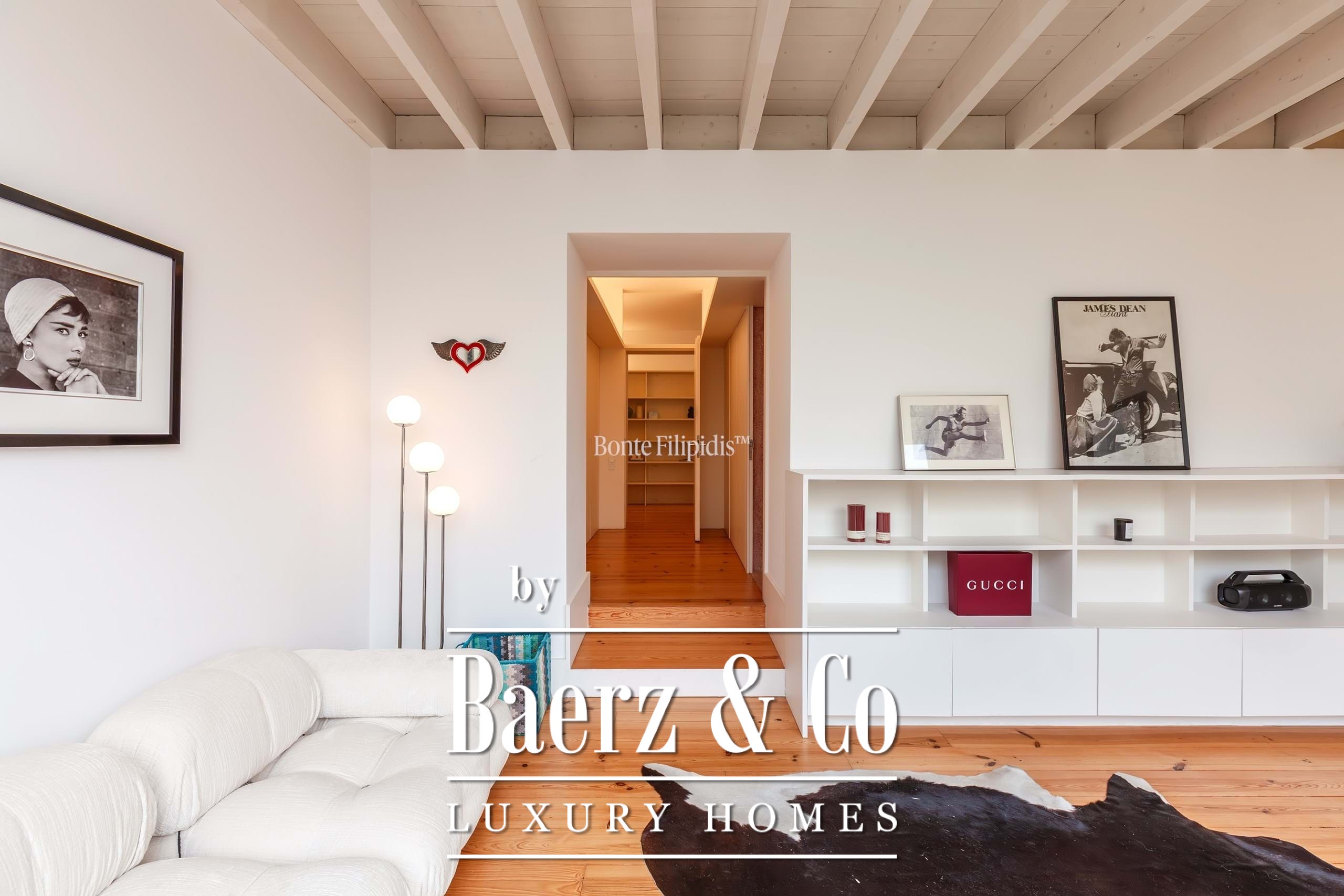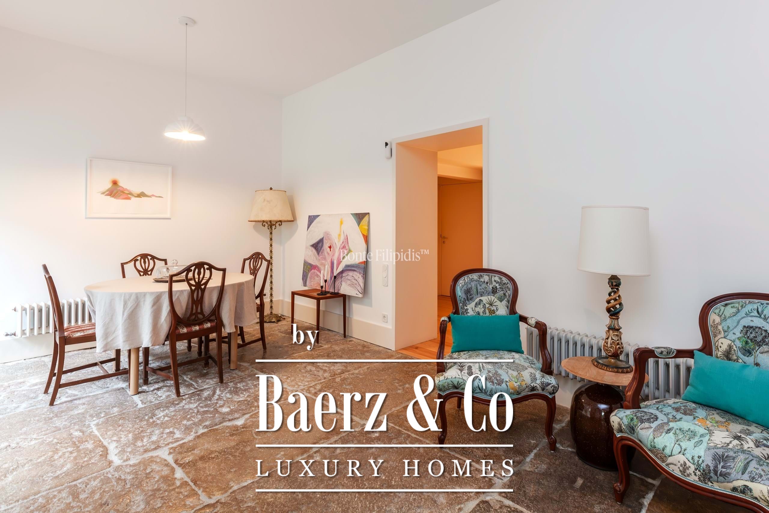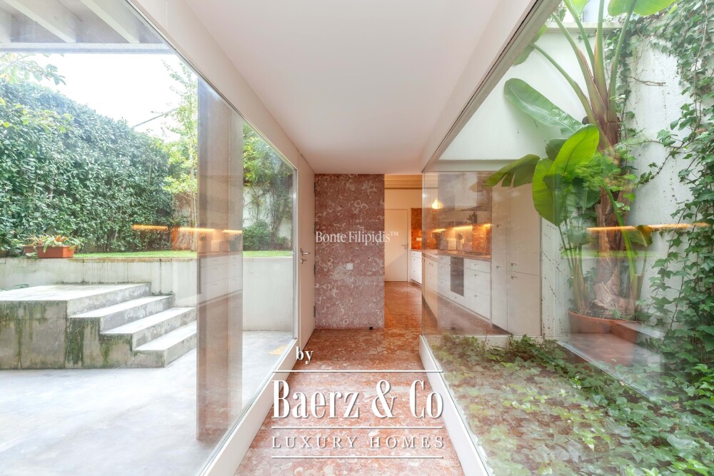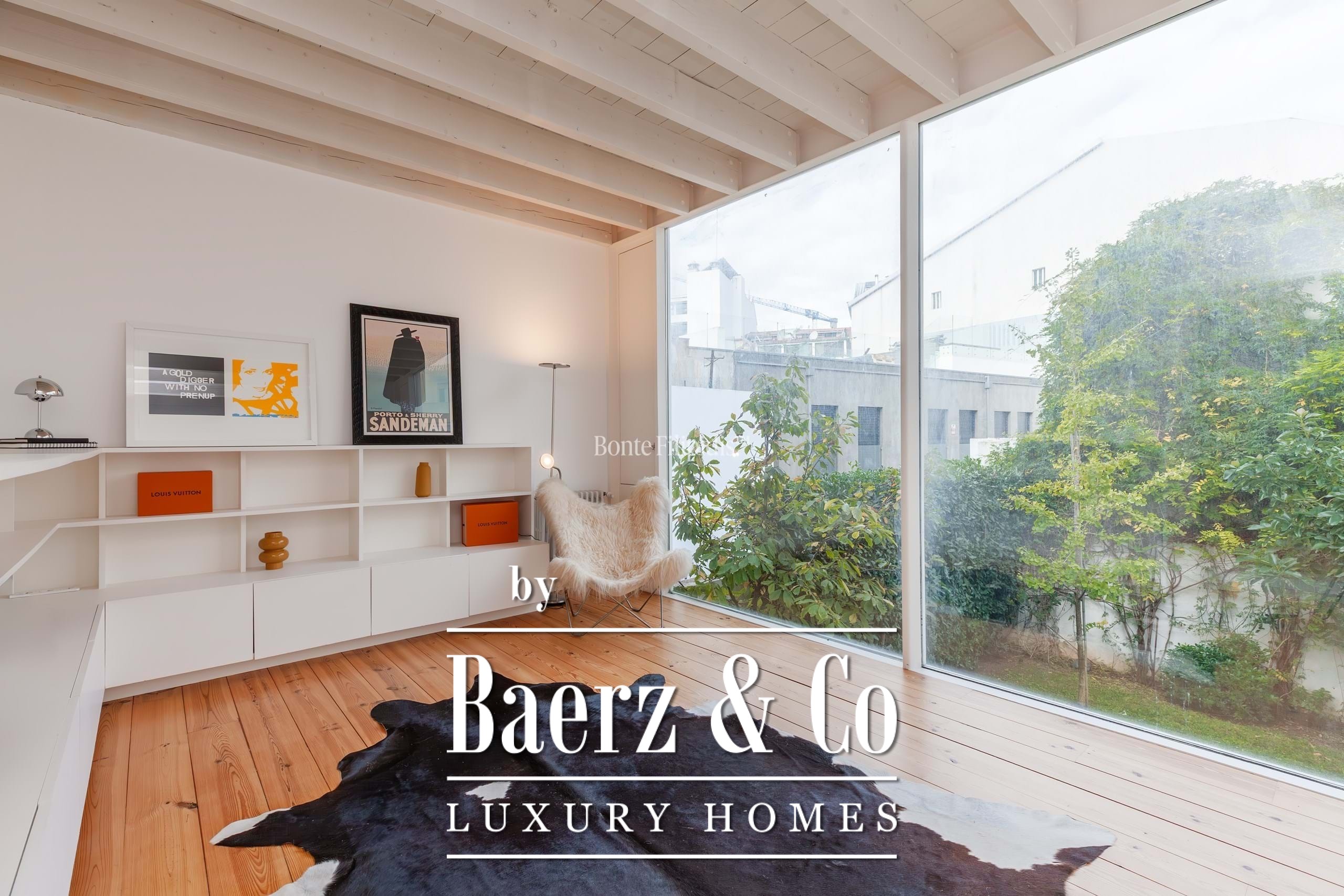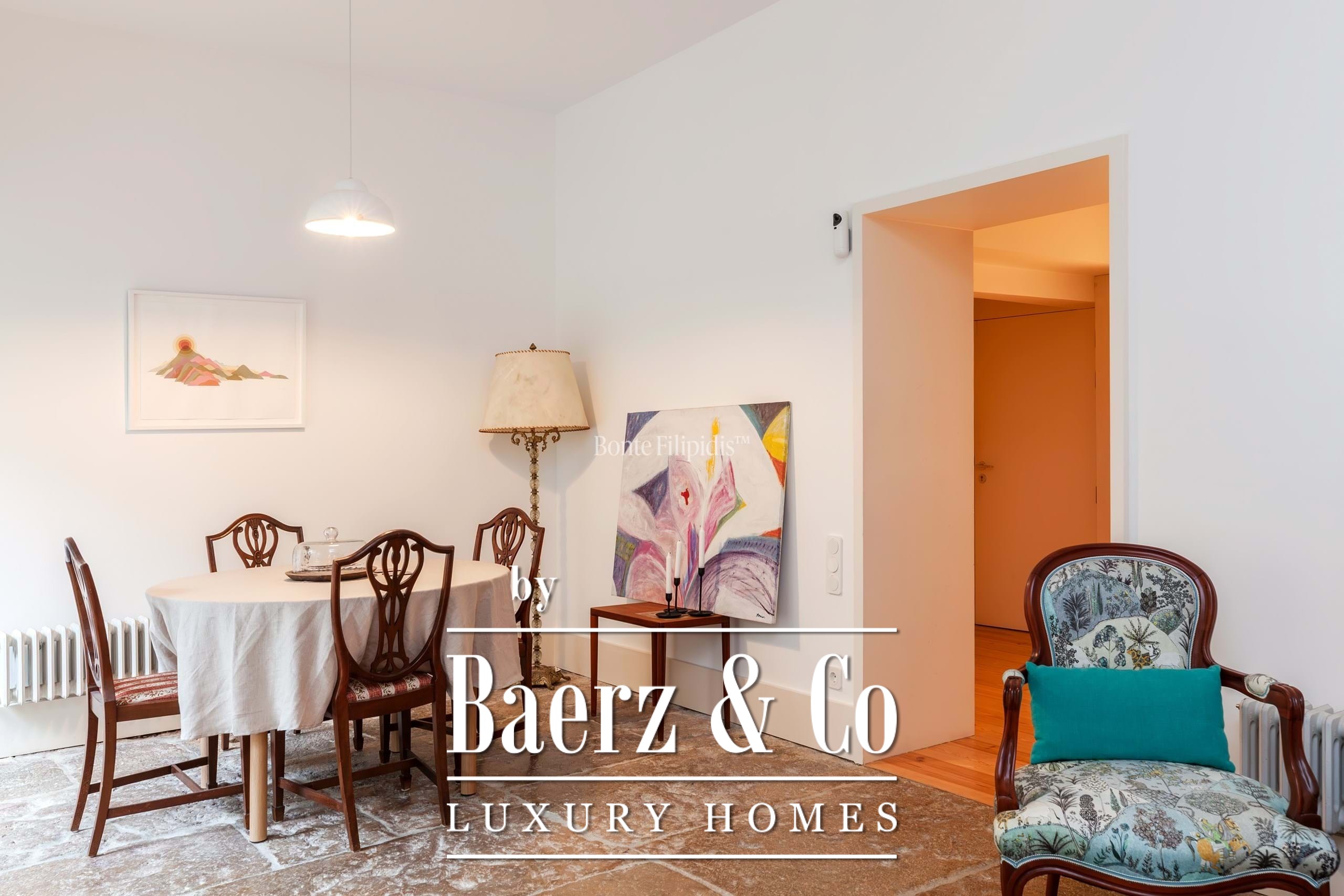 De belangrijkste leefruimtes worden gekenmerkt door originele stenen vloeren en subtiel vintage accenten, terwijl grote panoramische ramen overvloedig daglicht binnenlaten in het open woonconcept. De zit- en eetgedeeltes lopen vloeiend over in een privé tuin van 80 m², een rustige oase omringd door volwassen groen voor stille momenten of intieme bijeenkomsten. Geselecteerde materialen en verfijnde detaillering zorgen voor een ingetogen elegantie in elke ruimte.