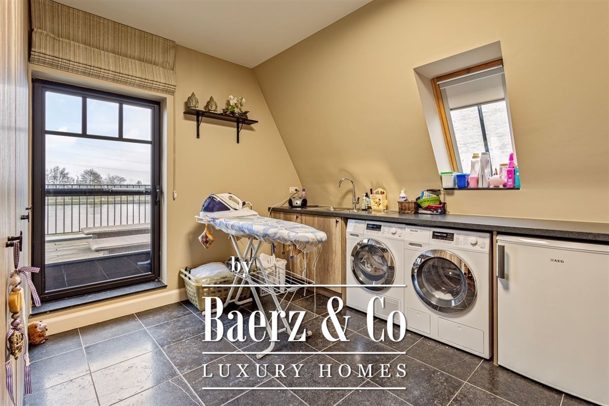 Op de bovenverdieping omvat de mastersuite een slaapkamer van 21 m² met toegang tot een zonneterras van 24 m² met panoramisch uitzicht over het water en het landschap, een privébadkamer, royale dressing en een ruime wasplaats. Twee bijkomende slaapkamers van 18 m² en 22 m² hebben parketvloeren; één kamer heeft eveneens toegang tot het terras. In het gehele duplexappartement in Schilde zijn details als vloerverwarming, airconditioning, automatische zonwering en vliegenramen aanwezig voor optimaal comfort, het hele jaar door.