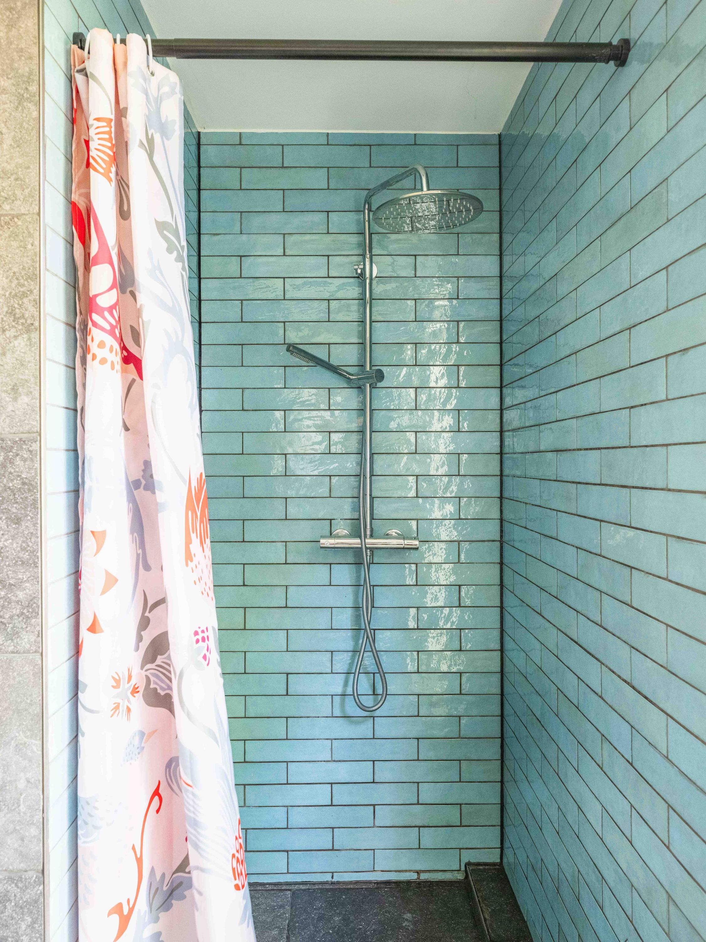 Op de verdieping vinden we naast de ruime overloop twee slaapkamers met vaste kasten en een moderne badkamer uitgevoerd in tadelakt-stuc, met toilet, ligbad, wastafel en douche. Prachtig ook om te zien hoe de balken in het zicht zijn gebleven.
