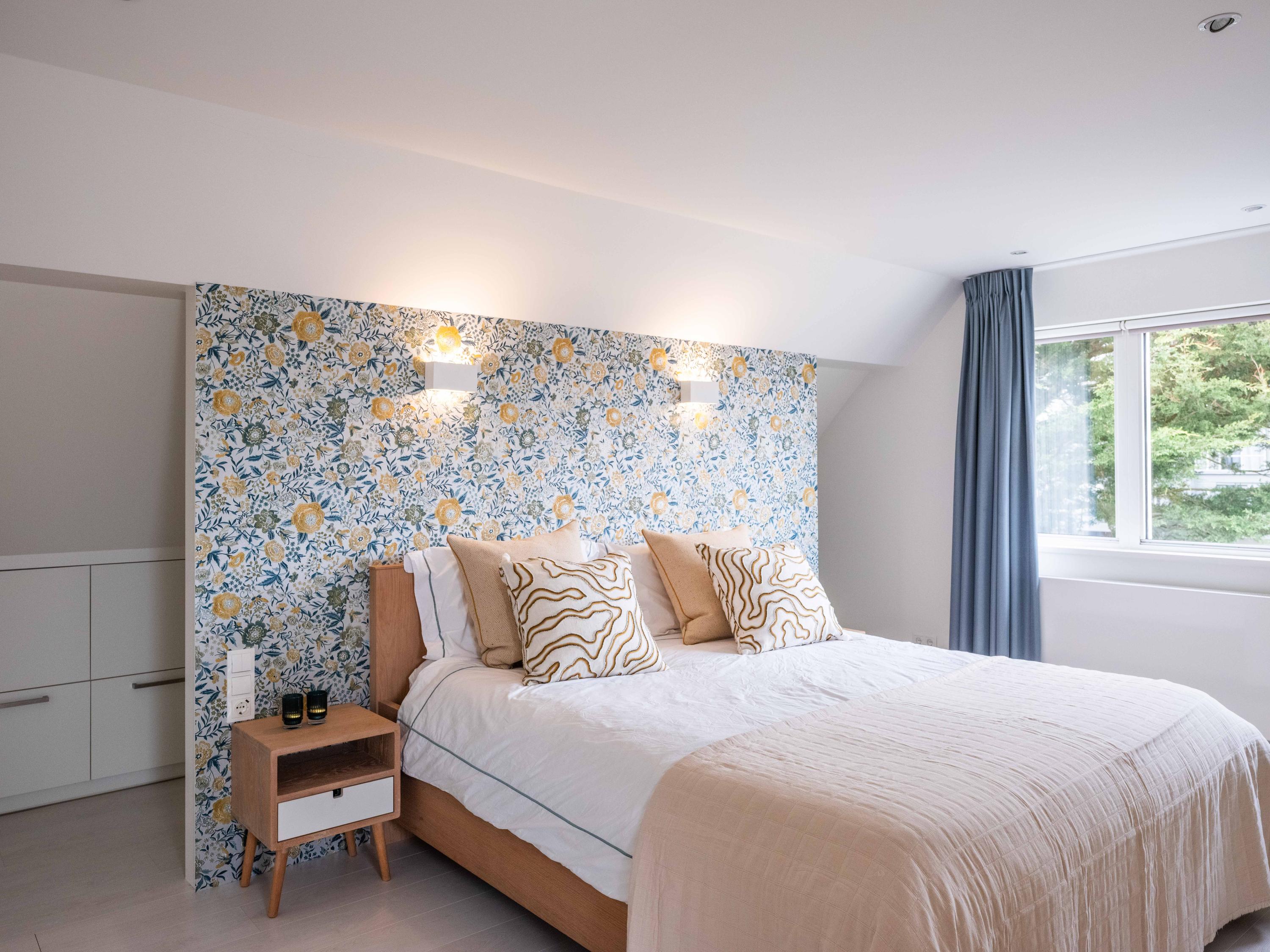 De open keuken is sfeervol ingericht en voorzien van een gezellige bar met zitplaatsen. Vanuit de keuken geniet je van een prachtig uitzicht over de tuin en is er directe verbinding met de woonkamer. Dankzij de open indeling en het overvloedige licht voelt alles ruim, fris en uitnodigend aan.