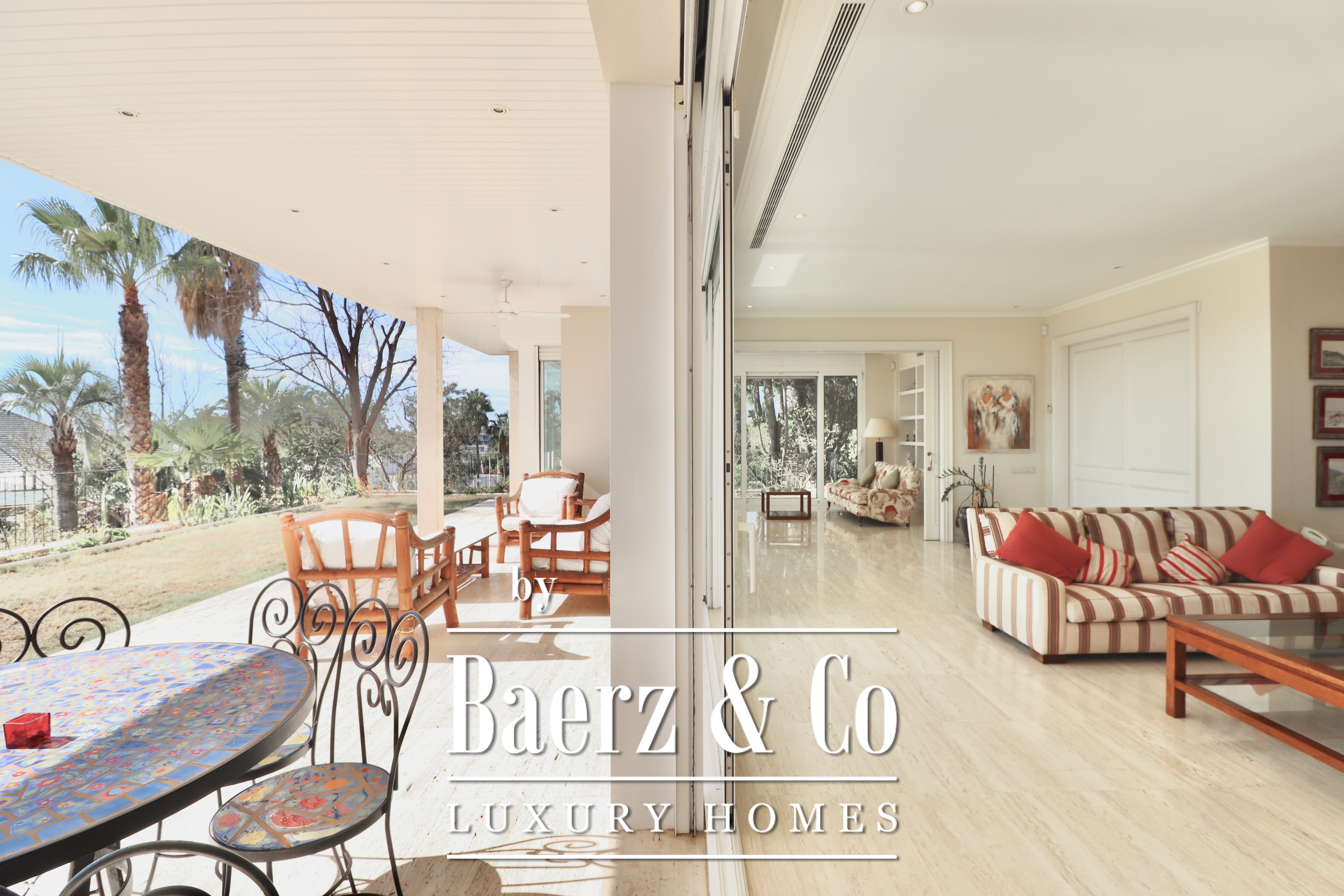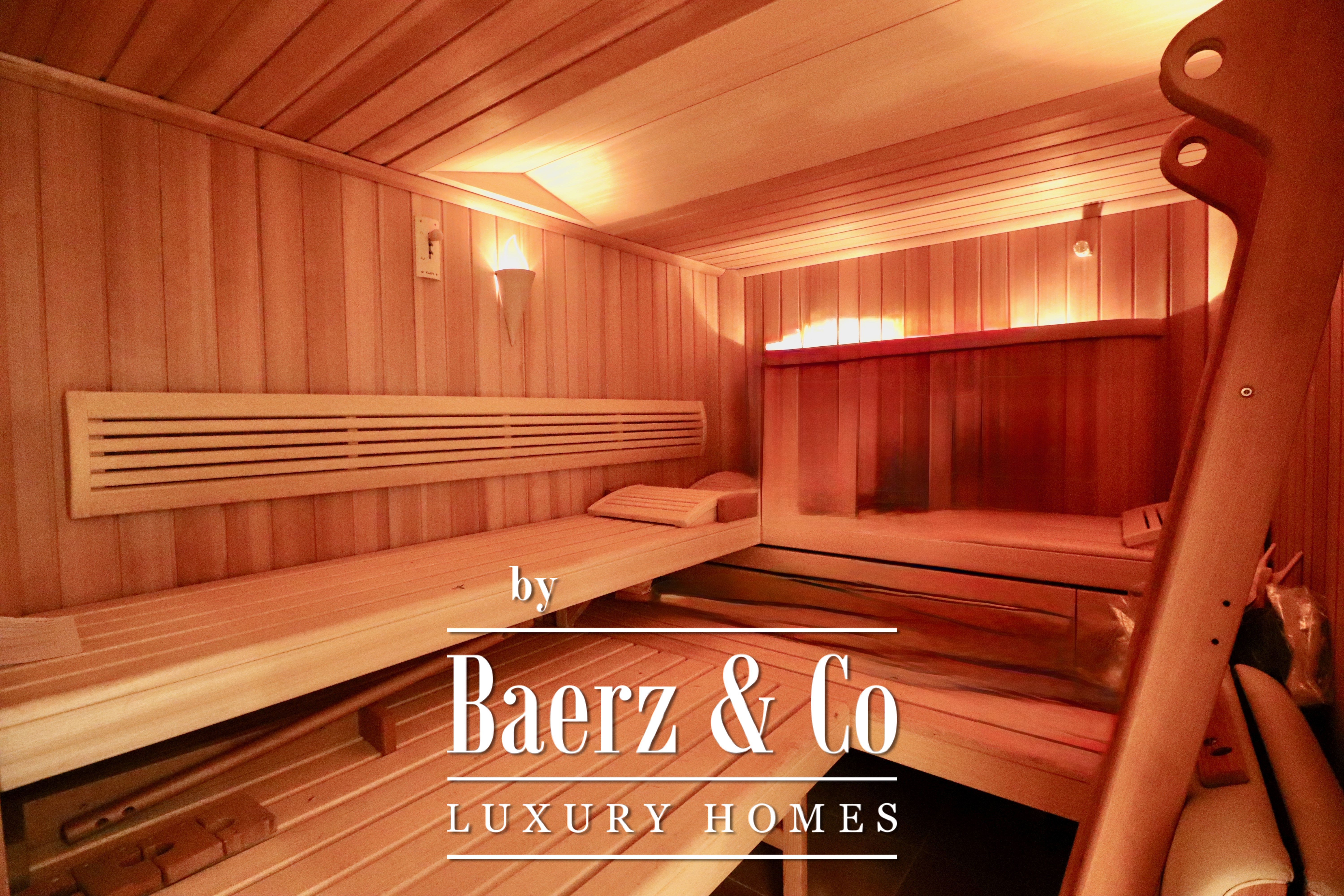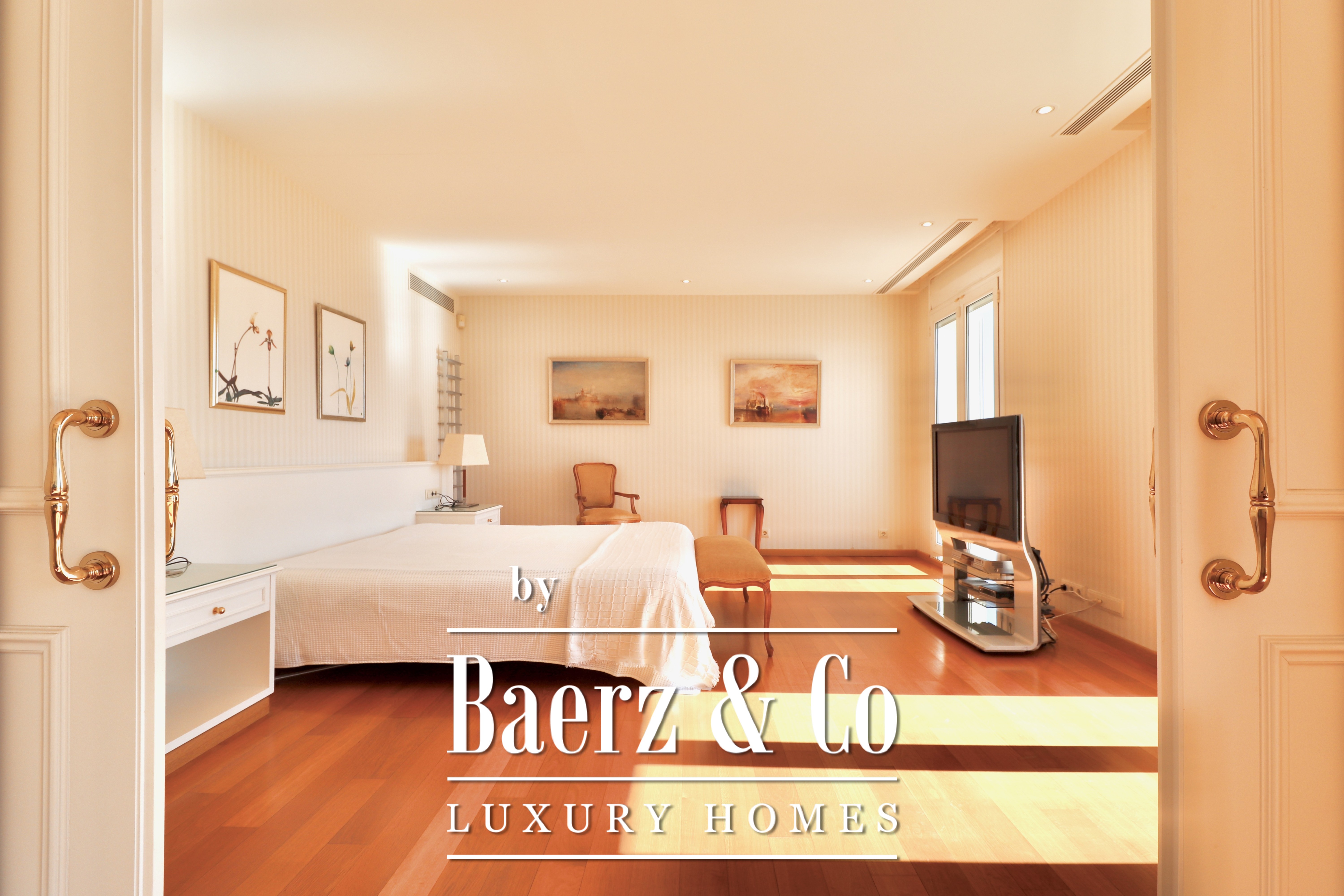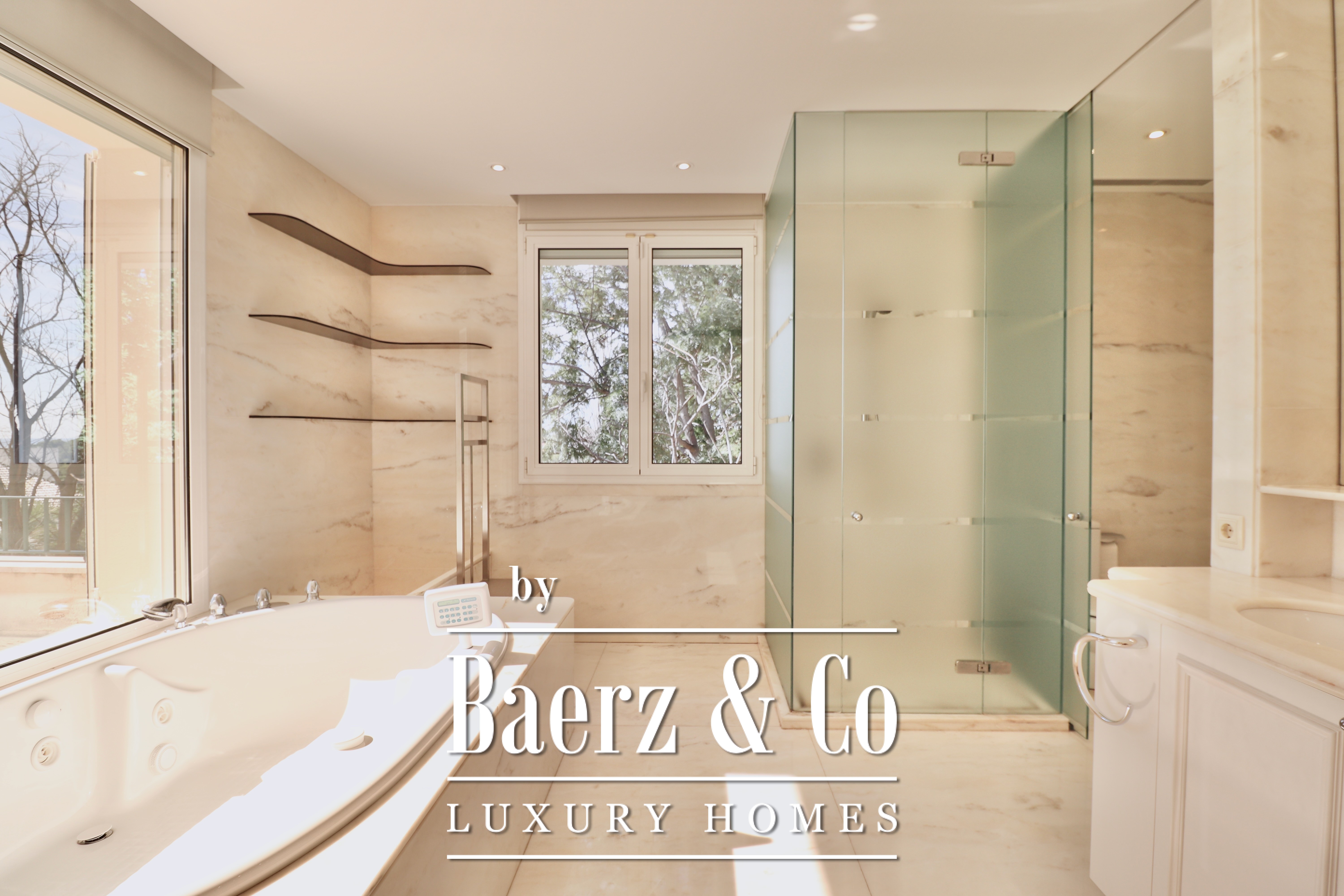 Ontworpen met oog voor discretie en comfort, spreidt de villa zich uit over drie verdiepingen, verbonden door een privé-lift. De hoofdverdieping begint met een stijlvolle entreehal en vloeit over in een open leefruimte met een salon en eetkamer, een mediaruimte, en een volledig uitgeruste keuken met aangrenzende bijkeuken en een dedicated kantoor. Vijf slaapkamers en acht badkamers bieden ruimte aan gezinsleven én grootschalig ontvangen.