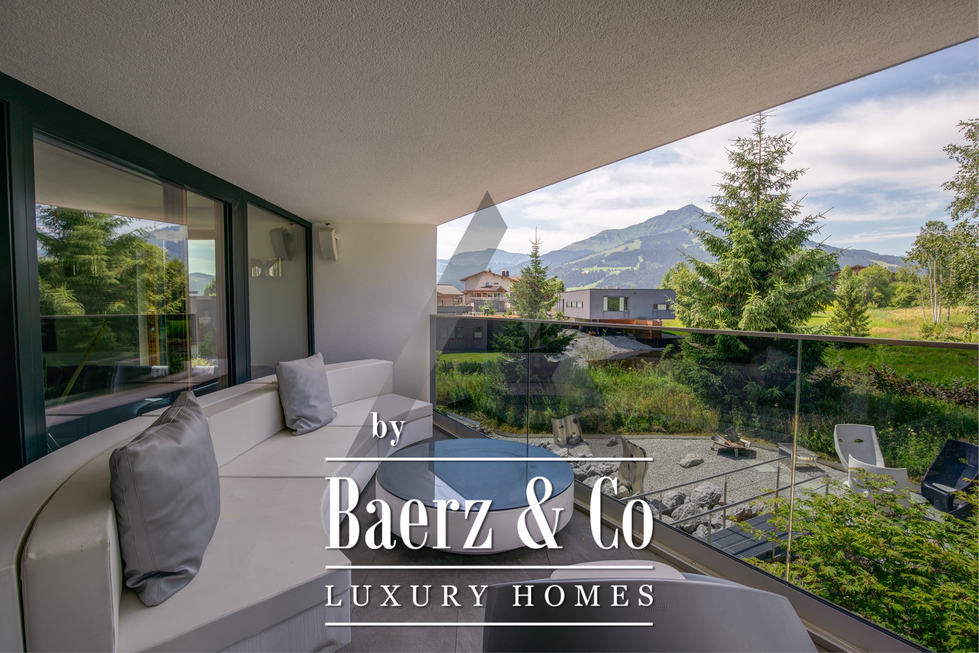 Binnen zorgen zichtbetonnen plafonds en gerecyclede eiken vloeren voor een subtiele verfijning. De open begane grond vormt het kloppend hart van de woning; panoramavensters vullen de woonkamer, eetkamer en de designkeuken van Miele met natuurlijk licht. Op de begane grond bevindt zich een mastersuite met dressing, een kinderkamer, ruime badkamers en praktische opbergruimte. Boven is een apart appartement met twee slaapkamers, een leefruimte met open haard en een dakterras met indrukwekkend bergzicht. Daarnaast is er op de verdieping een volledig geklimatiseerde fitnessruimte van 18 m² met toegang tot een eigen terras.