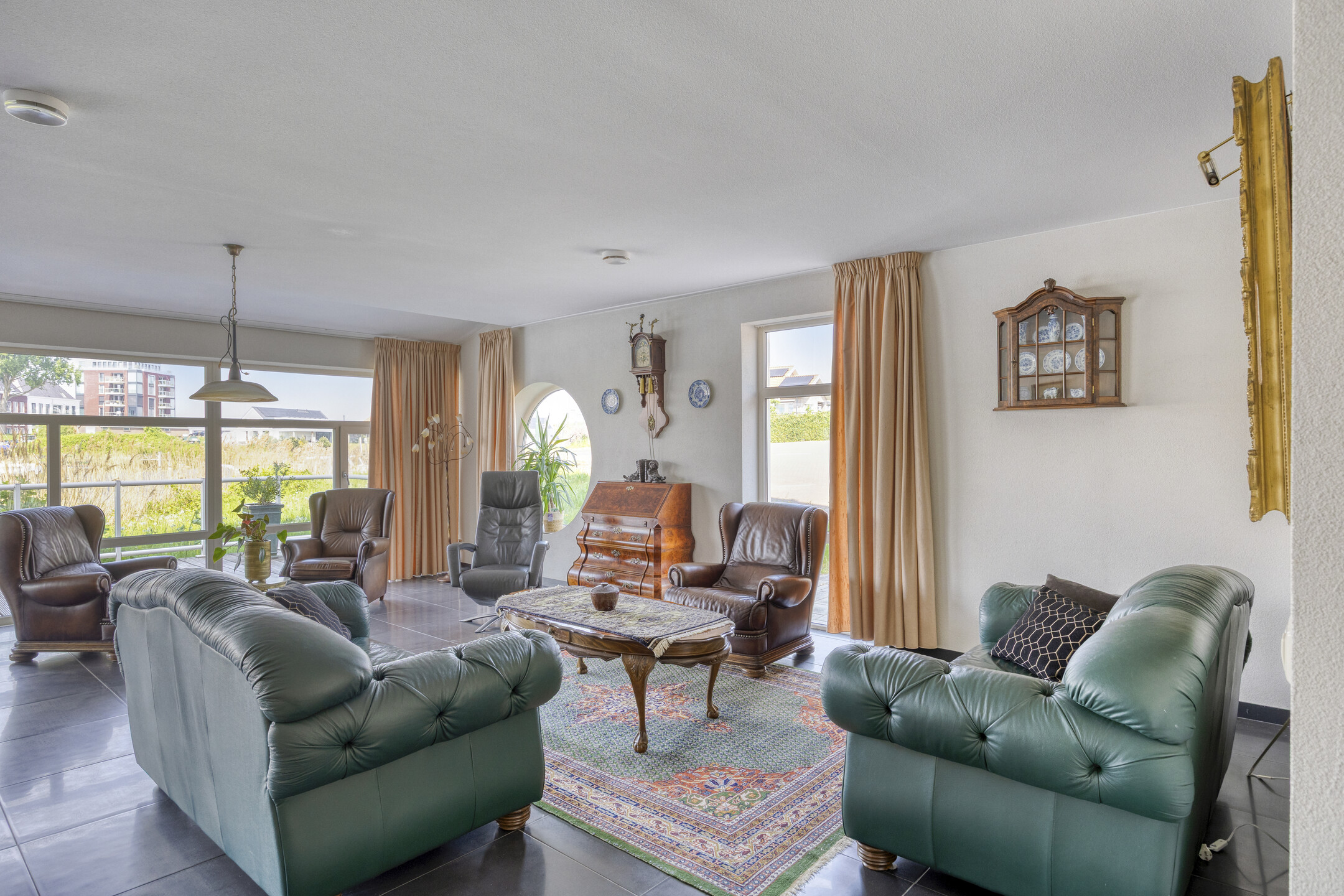woonkamer met zicht op de haven voorzien van een schuifpui naar het royale terras van 70 m², wandafwerking sierpleister, tegelvloer, plafond afgewerkt met spuitwerk;
