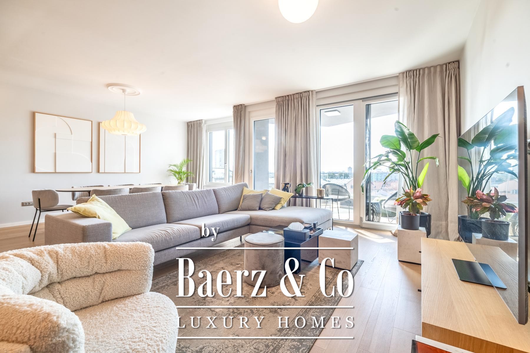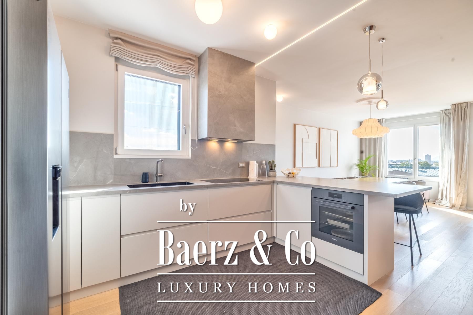 De indeling bestaat uit een lichte woonruimte, een eetgedeelte dat naadloos aansluit op een open keuken ingericht met Miele apparatuur, en twee slaapkamers. Door het gehele appartement ligt eiken parket. Het dagelijks leven wordt verrijkt door verfijnde details, zoals een op maat gemaakte wijnkoelkast en bar elegant geïntegreerd in de woonkamer, maatkasten en minimalistische badkamers afgewerkt met goudkleurig keramiek en hoogwaardige armaturen.