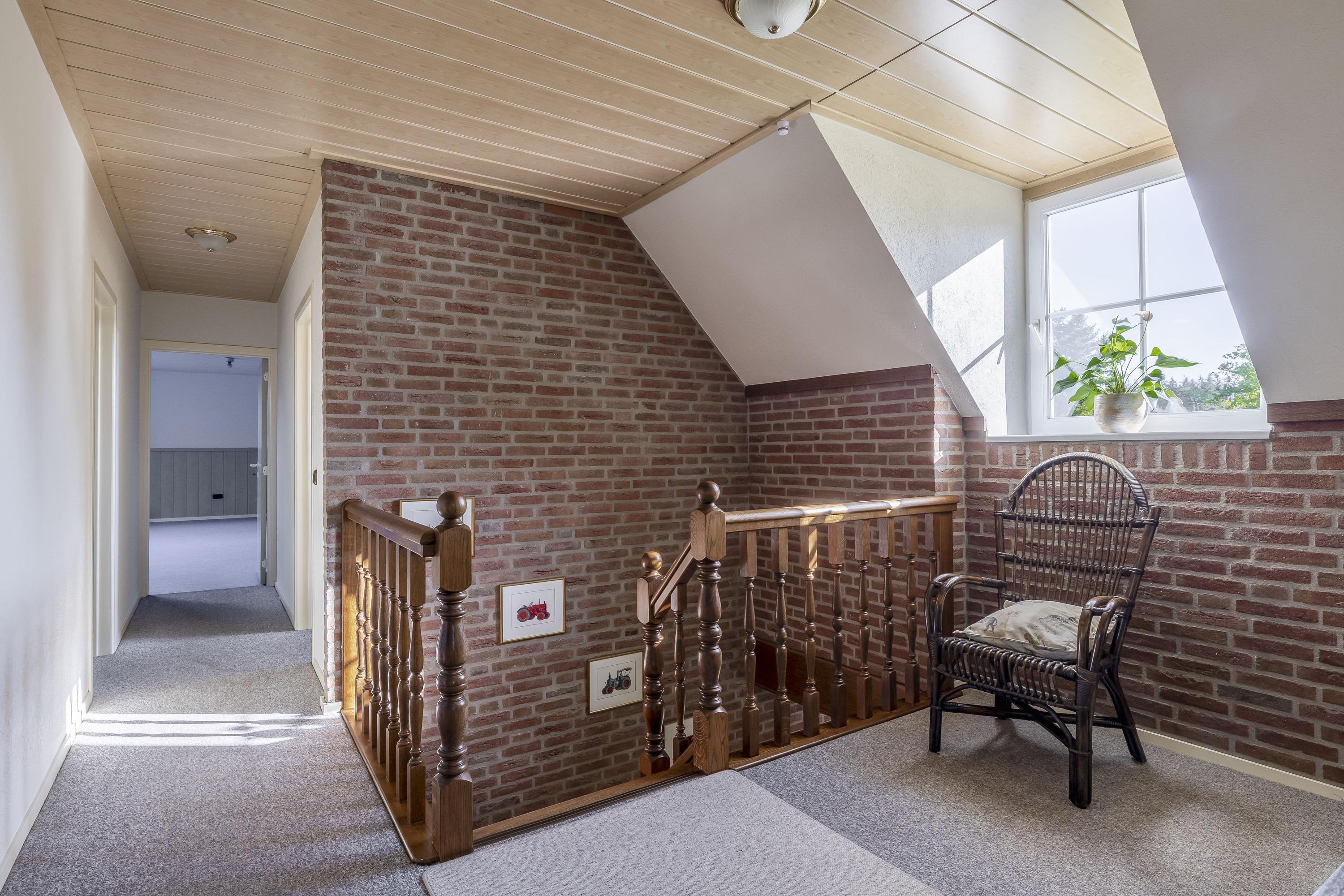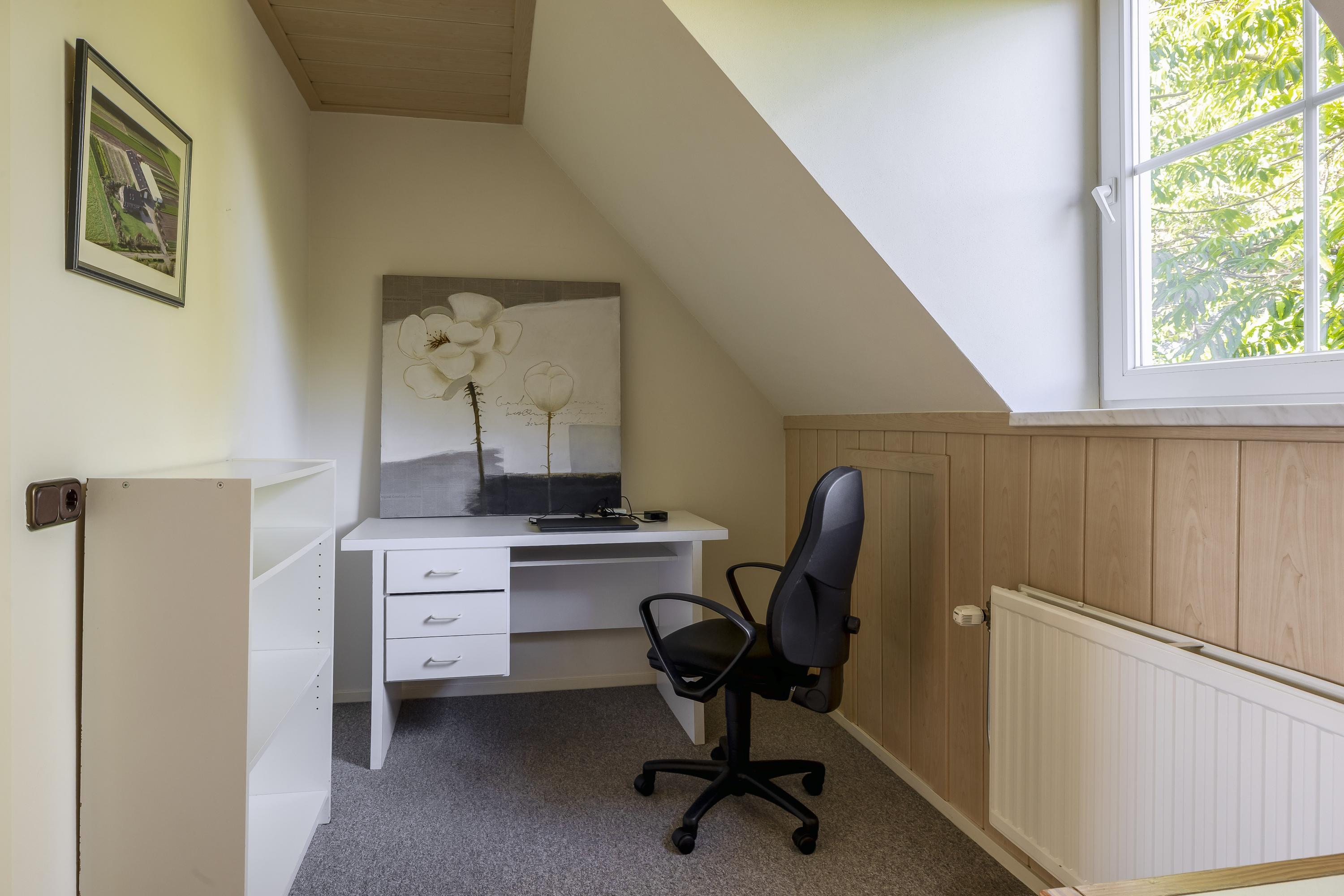 trap biedt toegang tot de 1e verdieping. De royale woonkamer is een heerlijke ruimte. De grote raampartijen en een schuifpui bieden een prachtig vrij uitzicht op de tuin. Het houten balken plafond en de schouw met gaskachel zorgen voor extra sfeer in de ruimte. Ook is er airconditioning aanwezig. De keukeninrichting in de leefkeuken is in een hoekopstelling geplaatst en uitgerust met een vaatwasser, spoelbak, keramische kookplaat, oven, magnetron en een koelkast. Vanuit de keuken bieden raampartijen ook zicht op de tuin. De bijkeuken is deels betegeld en uitgerust met de aansluitingen voor de wasapparatuur. Een loopdeur zorgt voor toegang tot de achtertuin. De badkamer is geheel betegeld en ingericht met een ligbad, een dubbele wastafel met meubel en een designradiator. Aangrenzend aan de badkamer is de slaapkamer gelegen.
