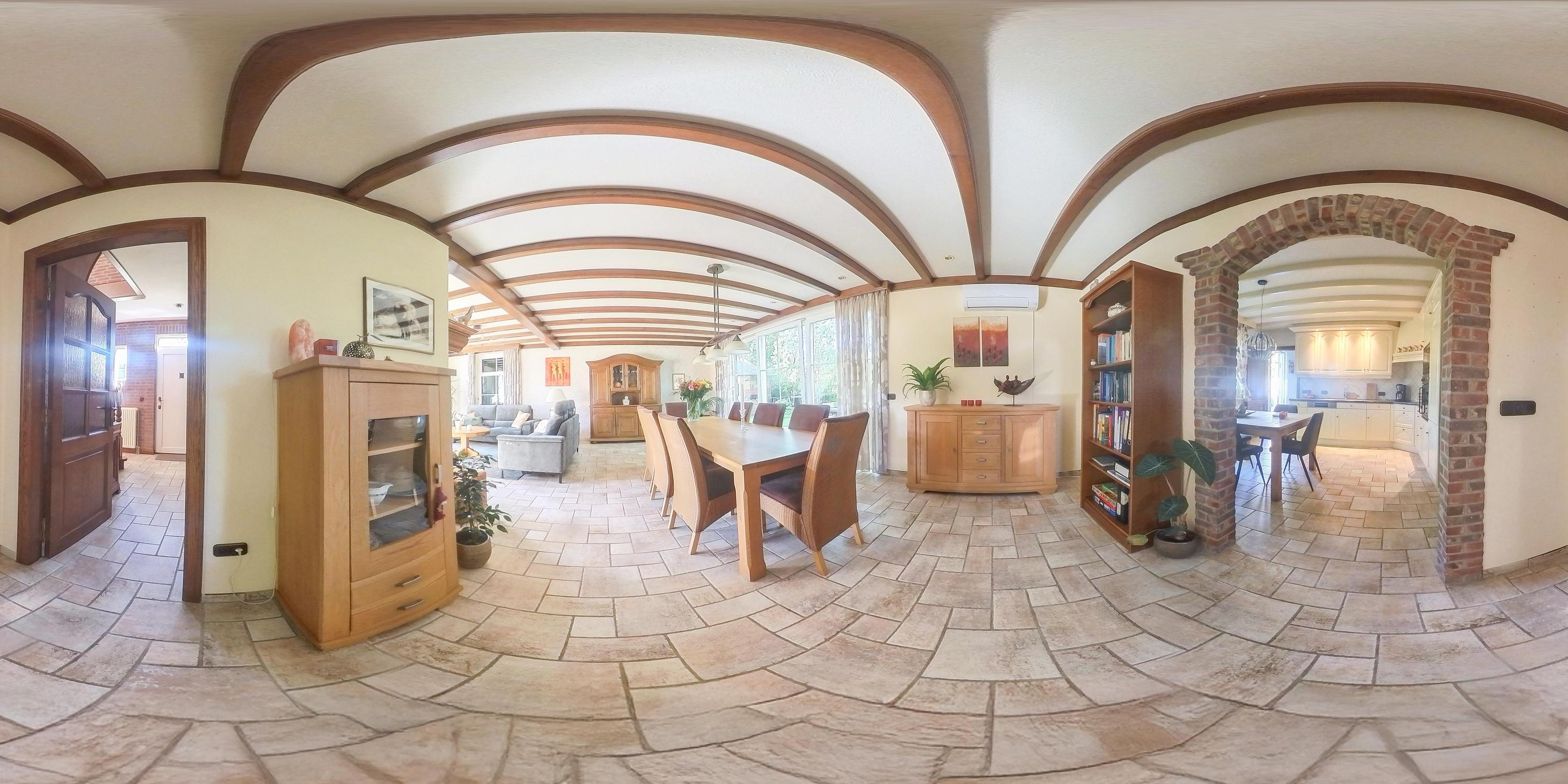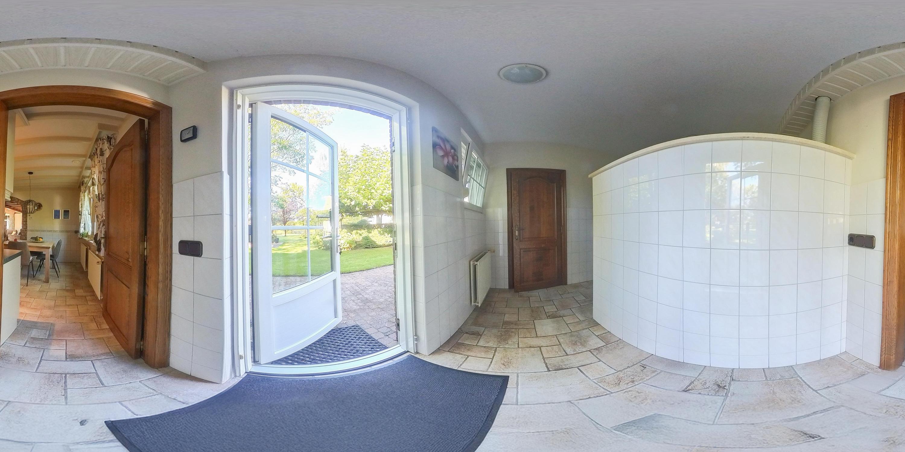 De ruime entreehal biedt toegang tot de woonkamer, toiletruimte, garderobe en de meterkast. Een fraaie houten