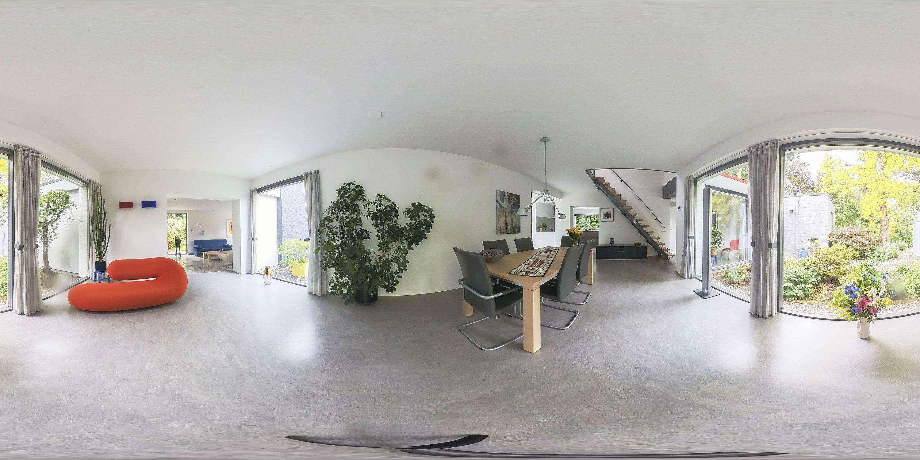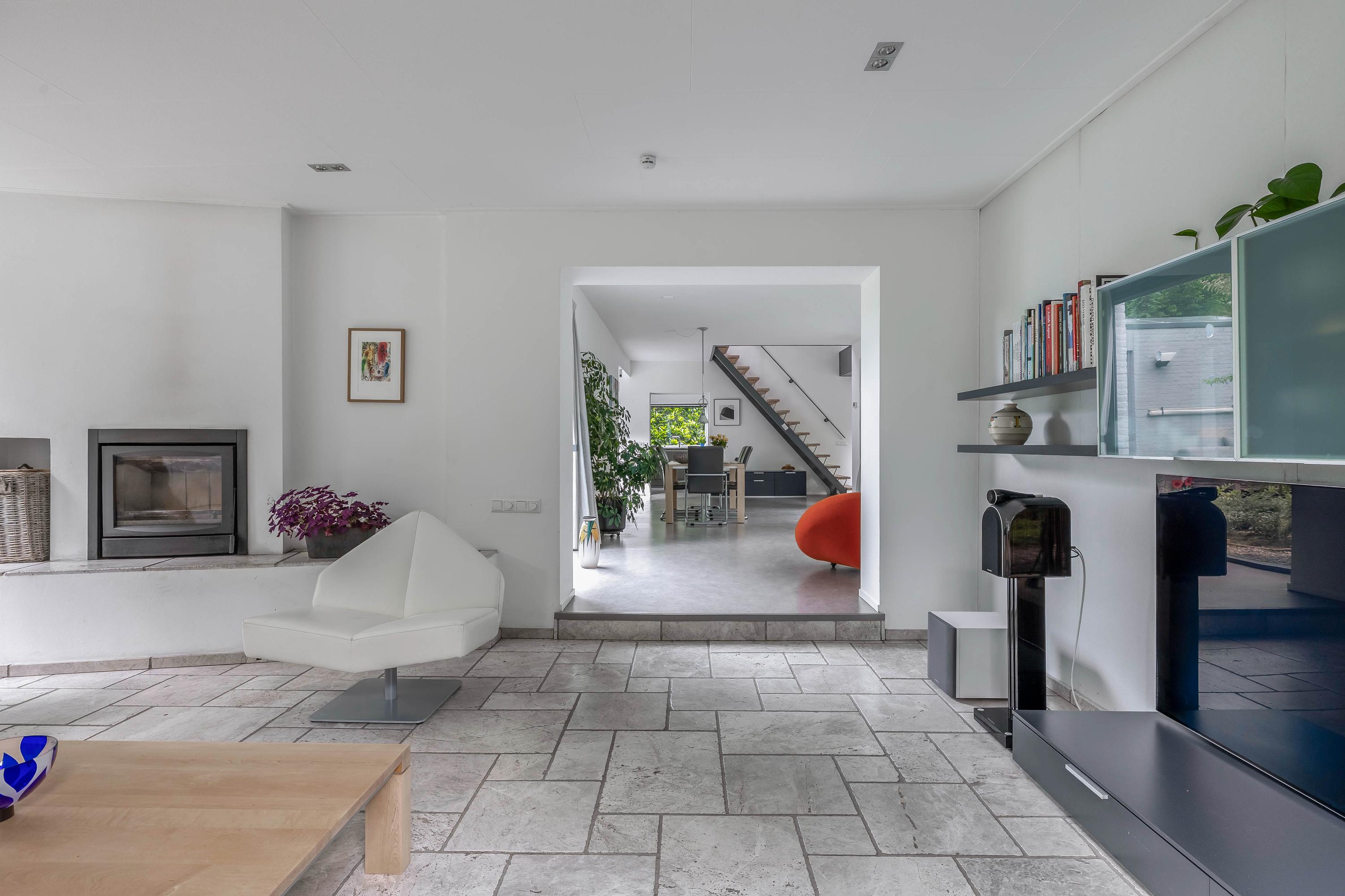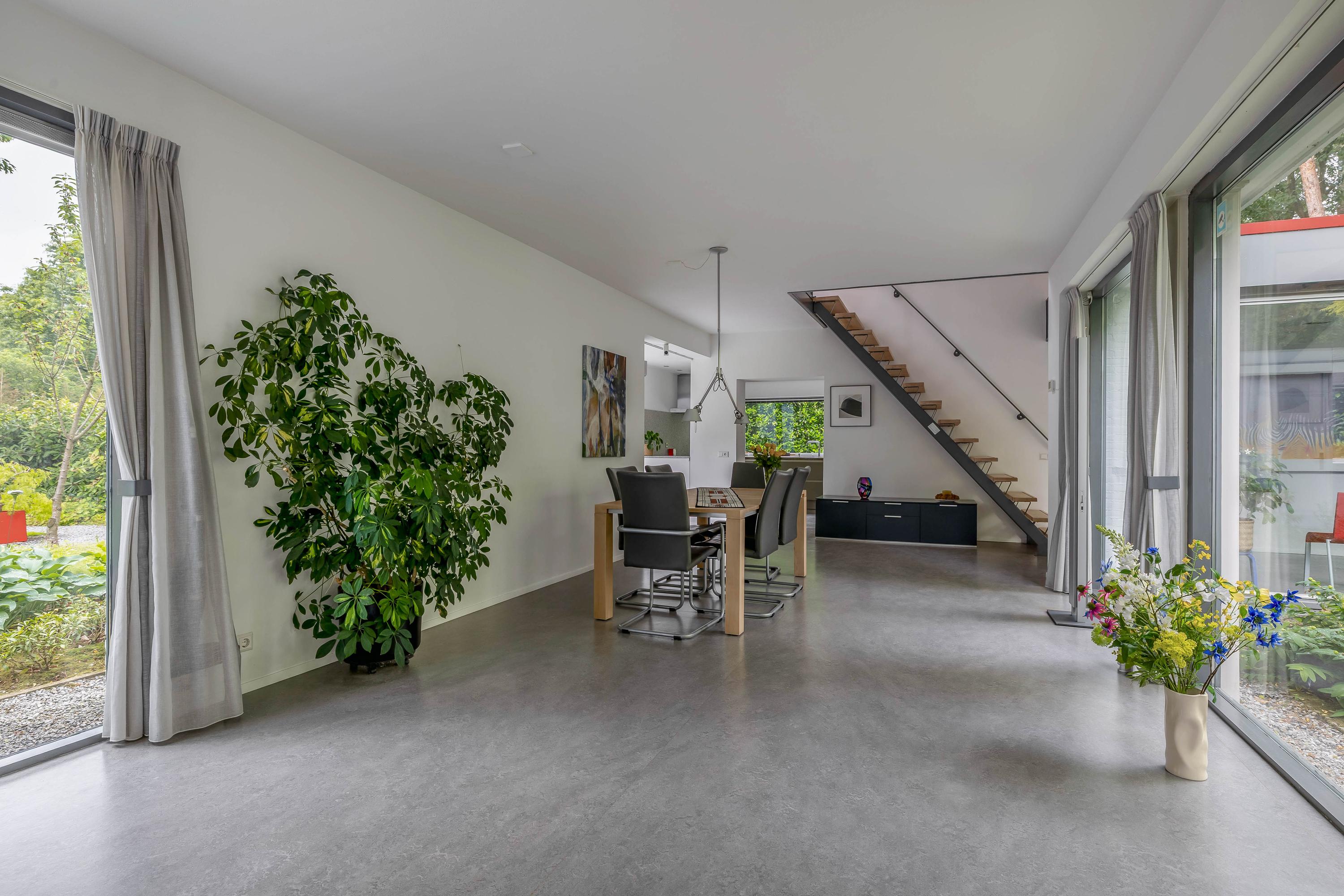 De open doorloop vanuit de entreehal leidt je naar de lichte en ruime woonkamer. Deze is afgewerkt met strak stucwerk op de wanden en de grote raampartijen tot vloerniveau bieden zicht op de patiotuin . Vloeren zijn uitgevoerd met vloerverwarming alsmede de mogelijkheid tot verkoeling, wat zorgt voor een aangenaam klimaat in elk seizoen. Een blikvanger in de woonkamer is de open trapopgang van esdoornhout en staal naar de verdieping.
