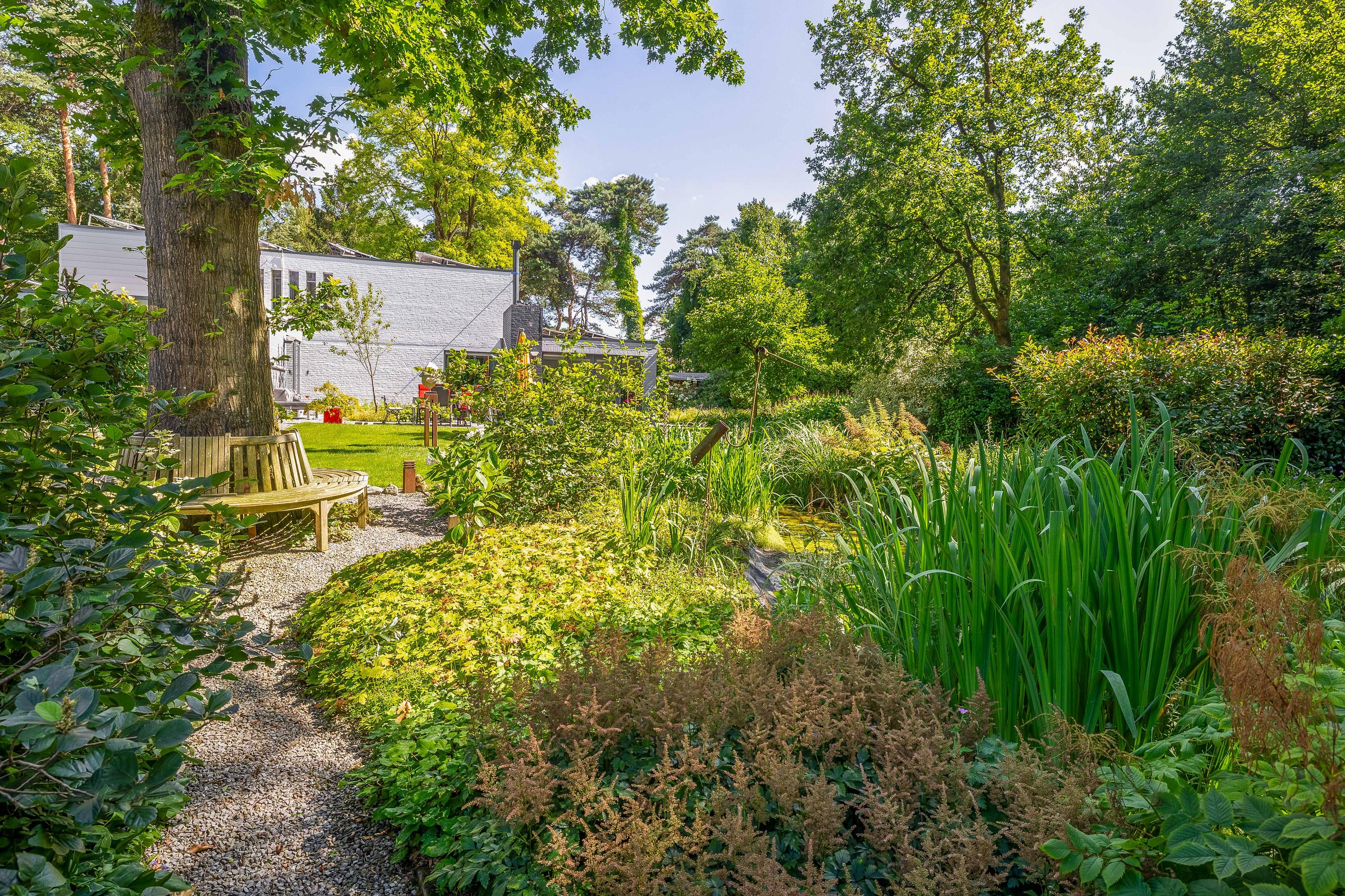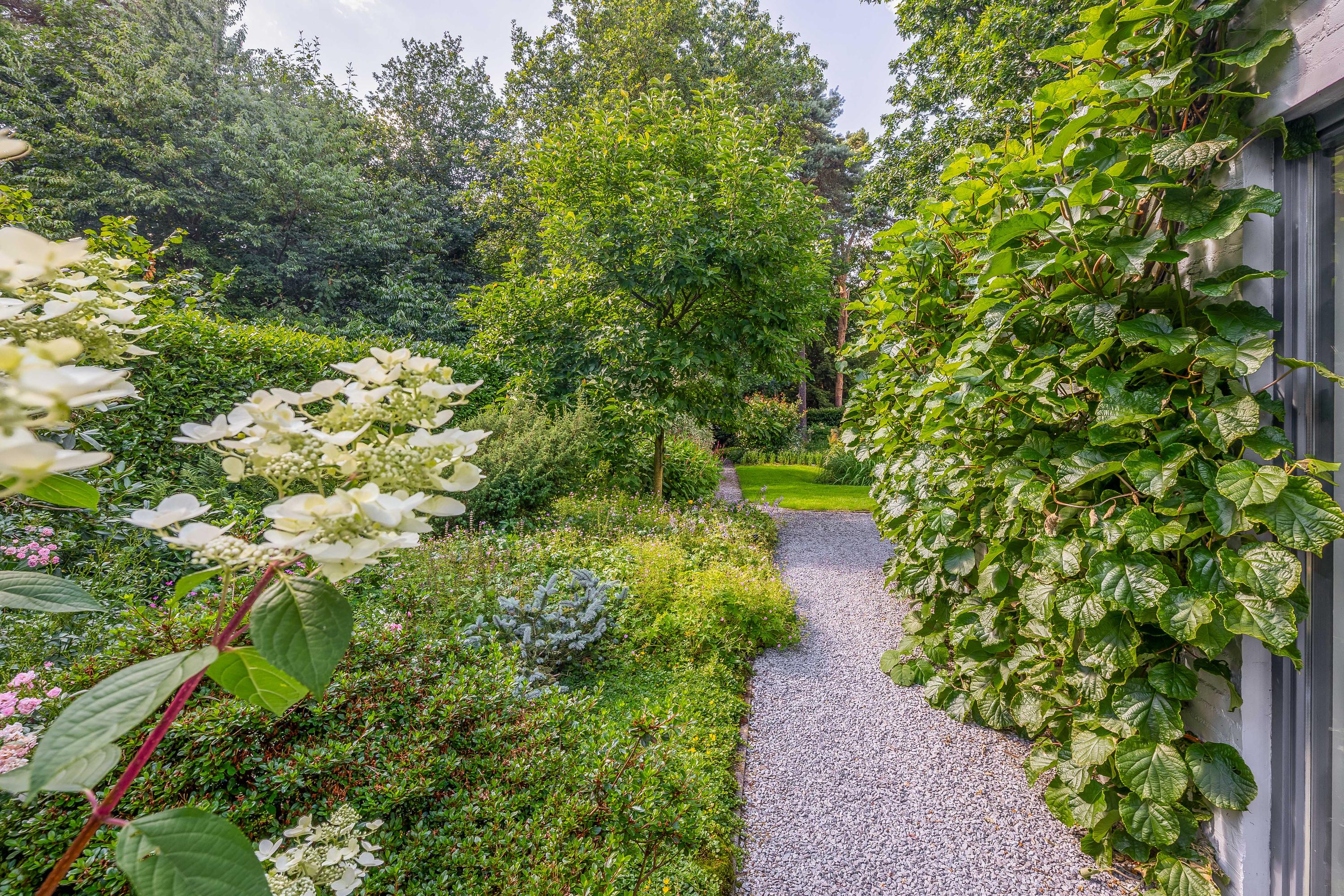 De achtertuin is een ware oase van privacy en rust. Je waant je hier letterlijk in een park omringd door volwassen groen en midden in de natuur. De tuin is rondom afgeschermd door een laurierhaag.. Hier zijn meerdere stroompunten en buitenkraantjes aanwezig, en voor gezellige avonden is er een buitenhaard te vinden! Het geheel is prachtig aangelegd met groot gazon, beplanting en een fraaie vijver. Natuurlijk mag een computergestuurde beregeningsinstallatie hier niet ontbreken. Een prachtige aangelegde tuin met walnotenboom, magnolia's en ook veel bosvruchten: blauwe bessen (25 kg per jaar), bramen en frambozen.
